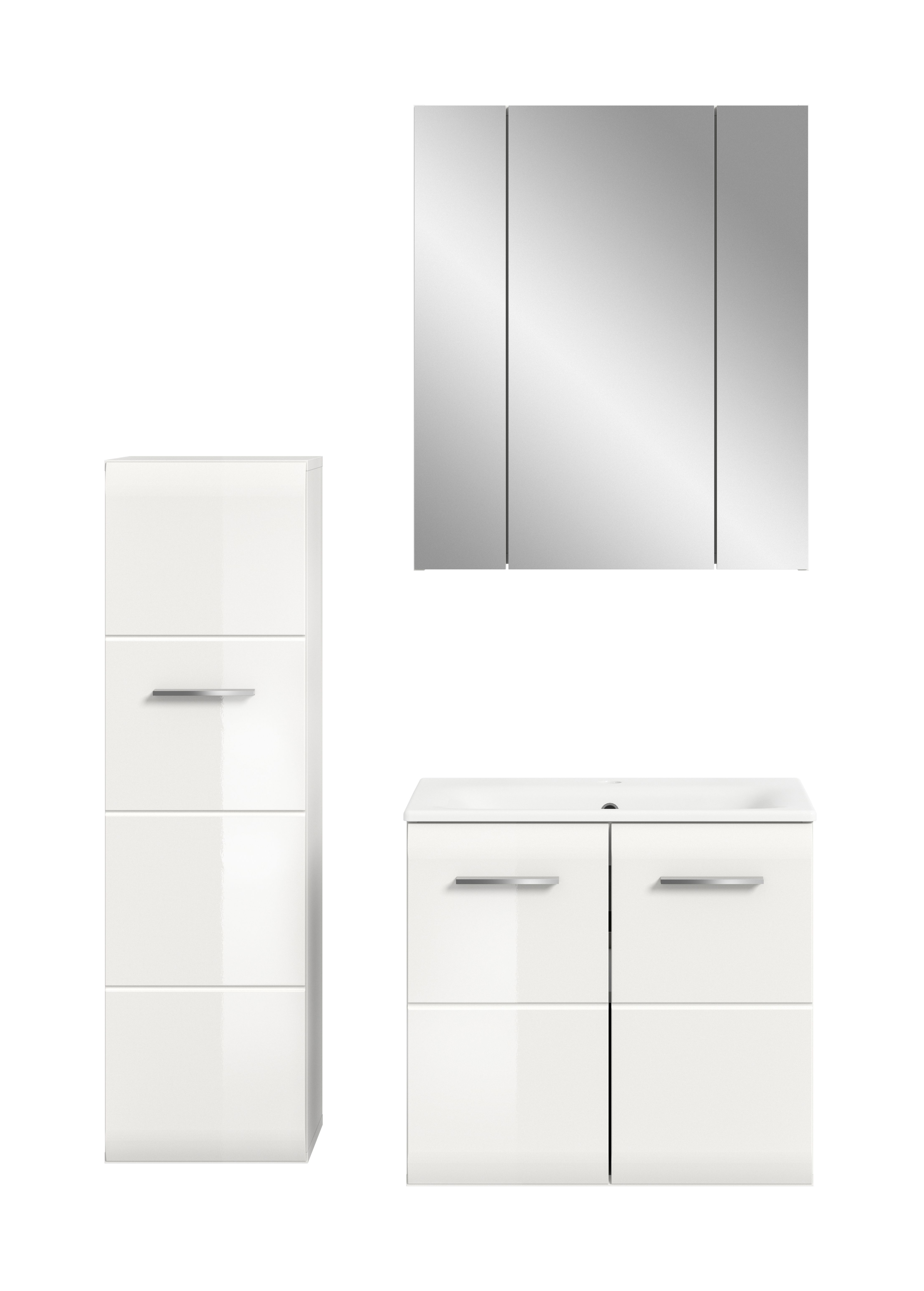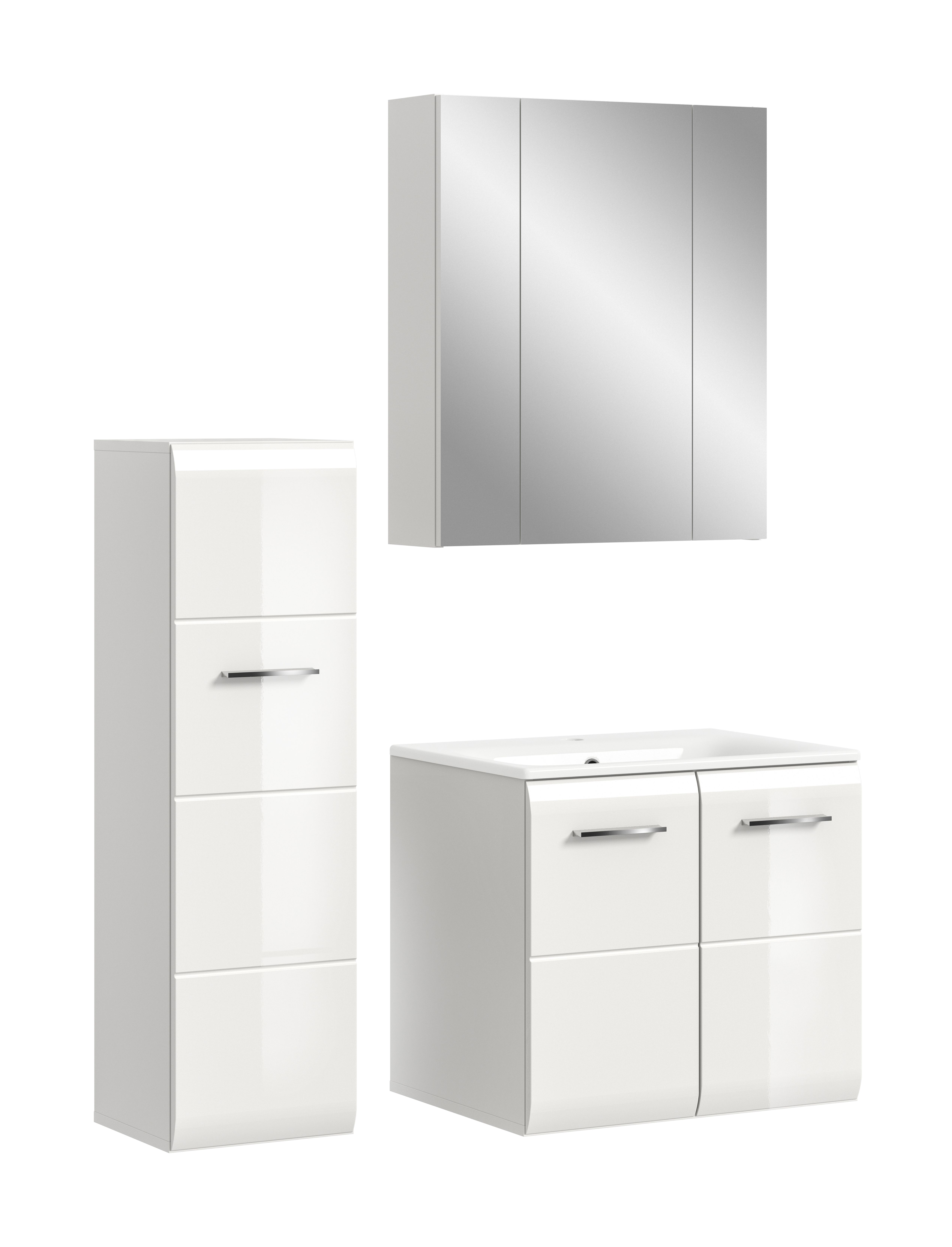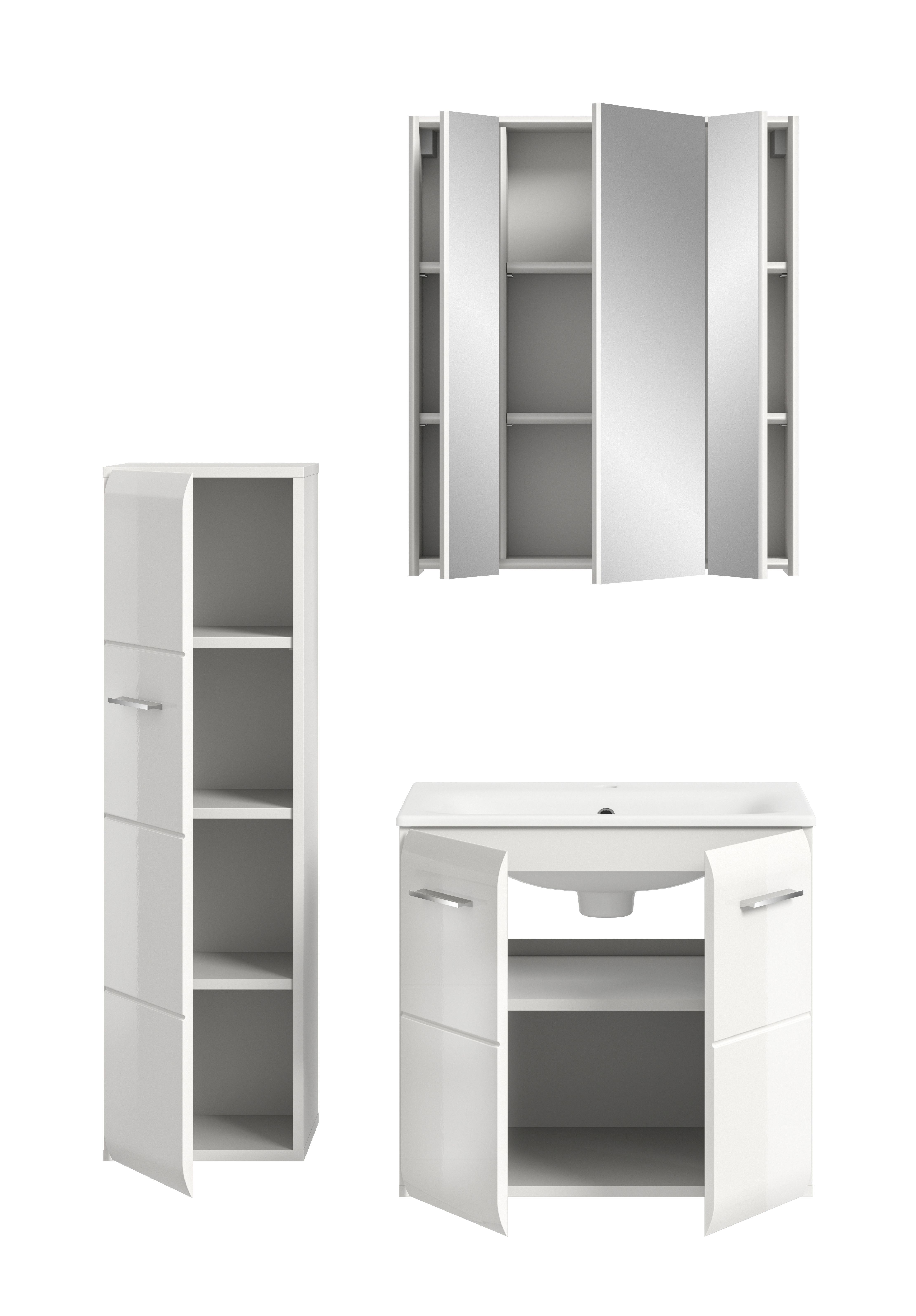 - 3-teilige Badkombination beteht aus 1x Stauraumtype, 1x Waschtisch inkl. Waschbecken, 1x Spiegelschrank