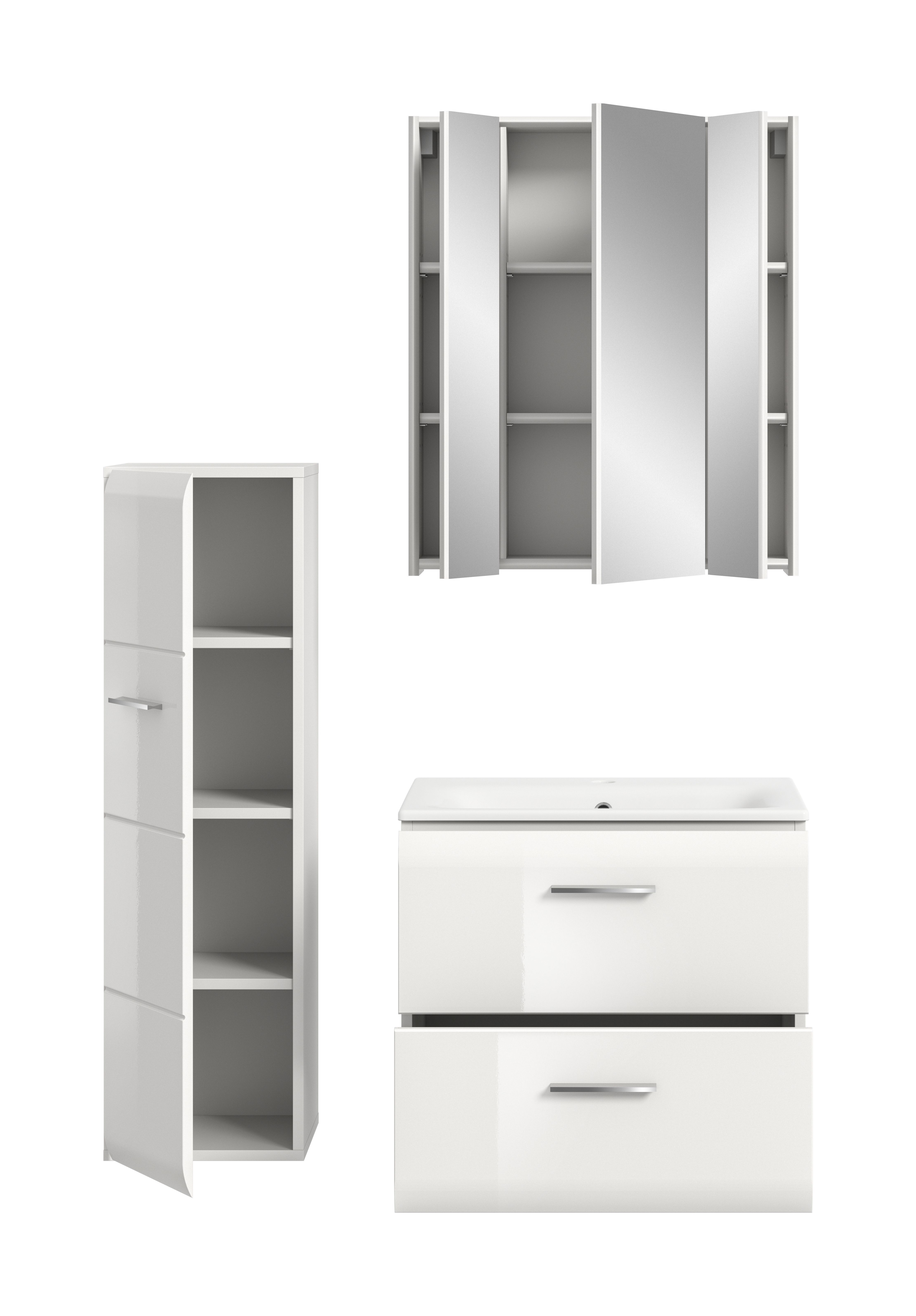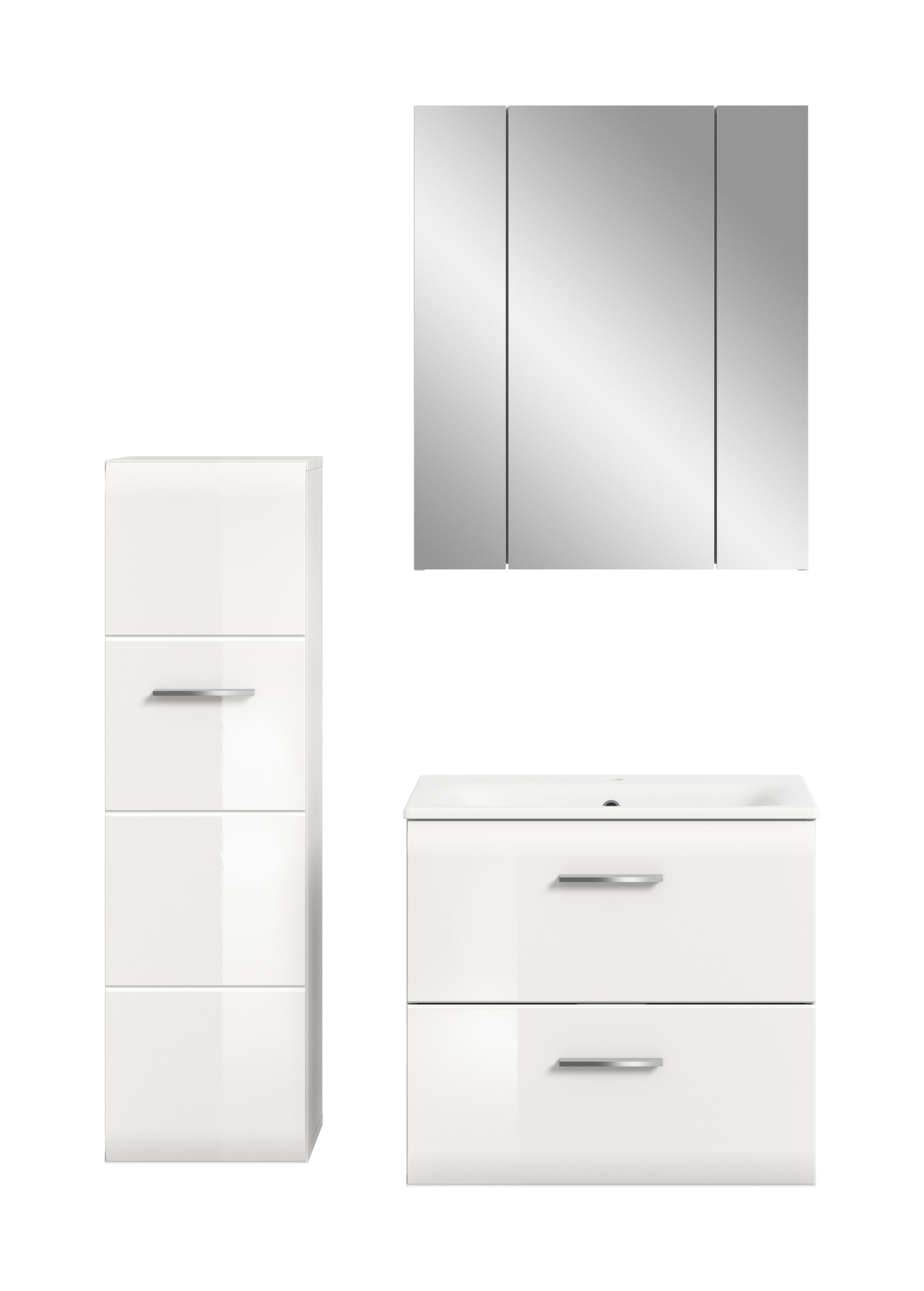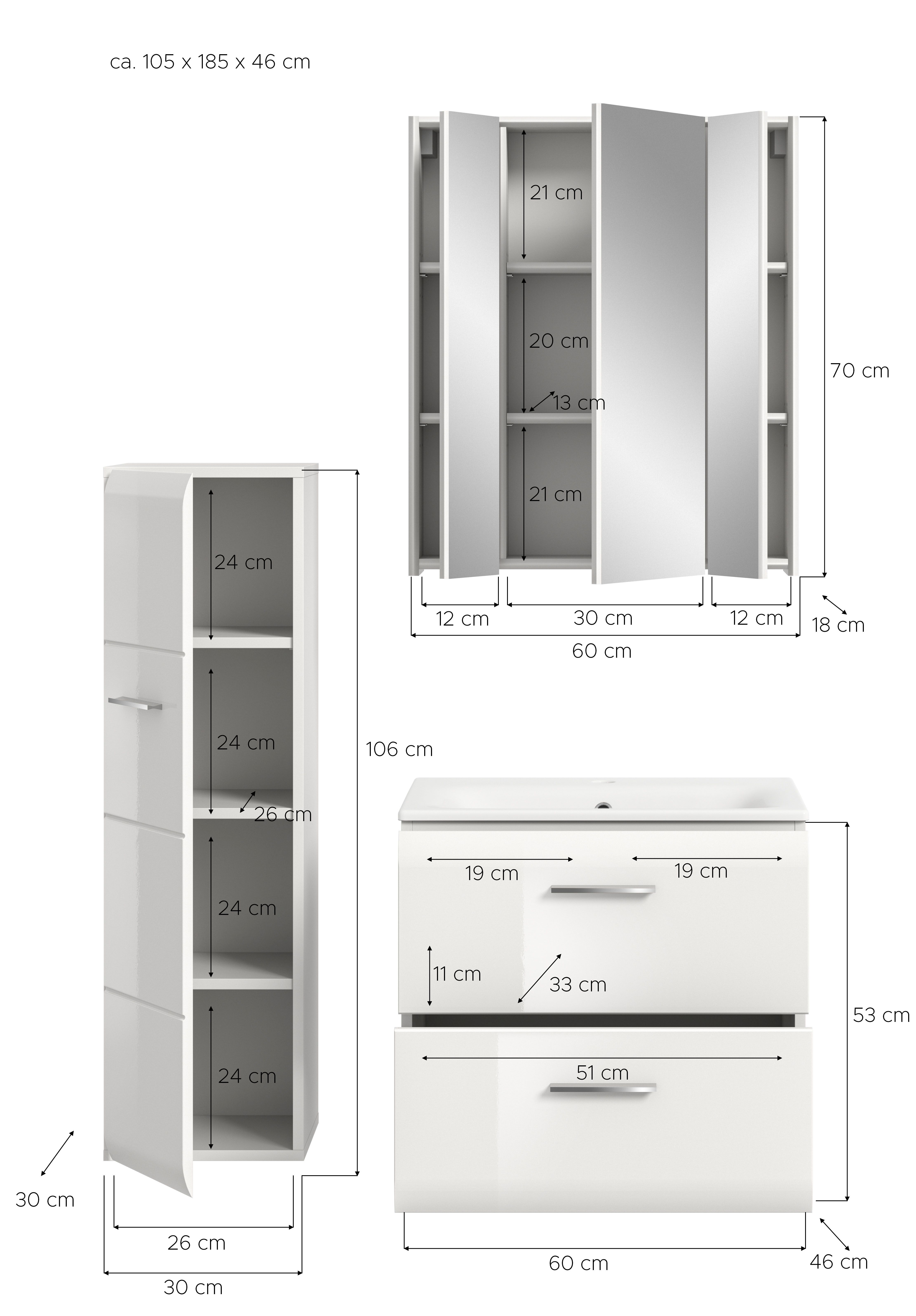 - 3-teilige Badkombination beteht aus 1x Stauraumtype, 1x Waschtisch inkl. Waschbecken, 1x Spiegelschrank