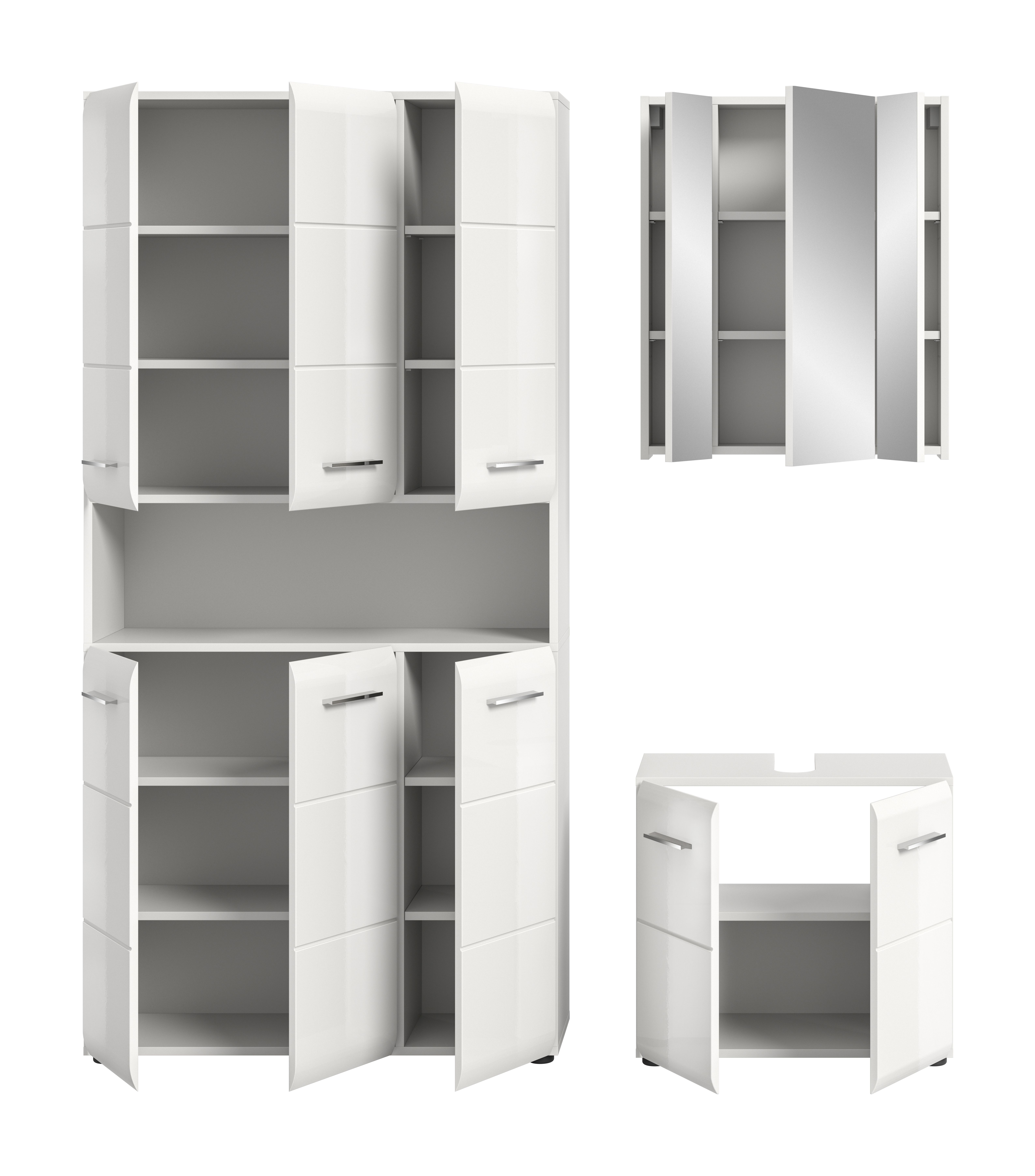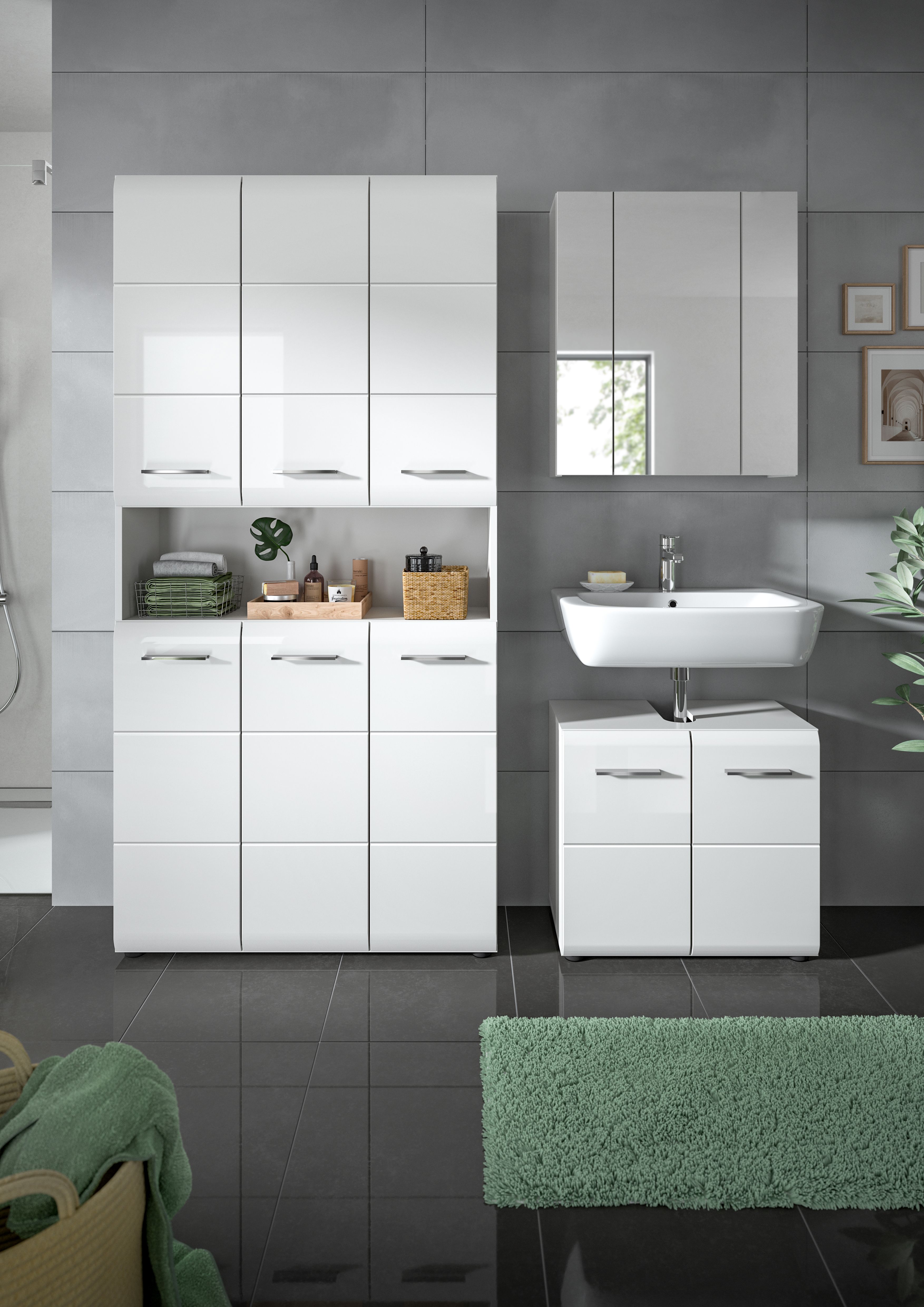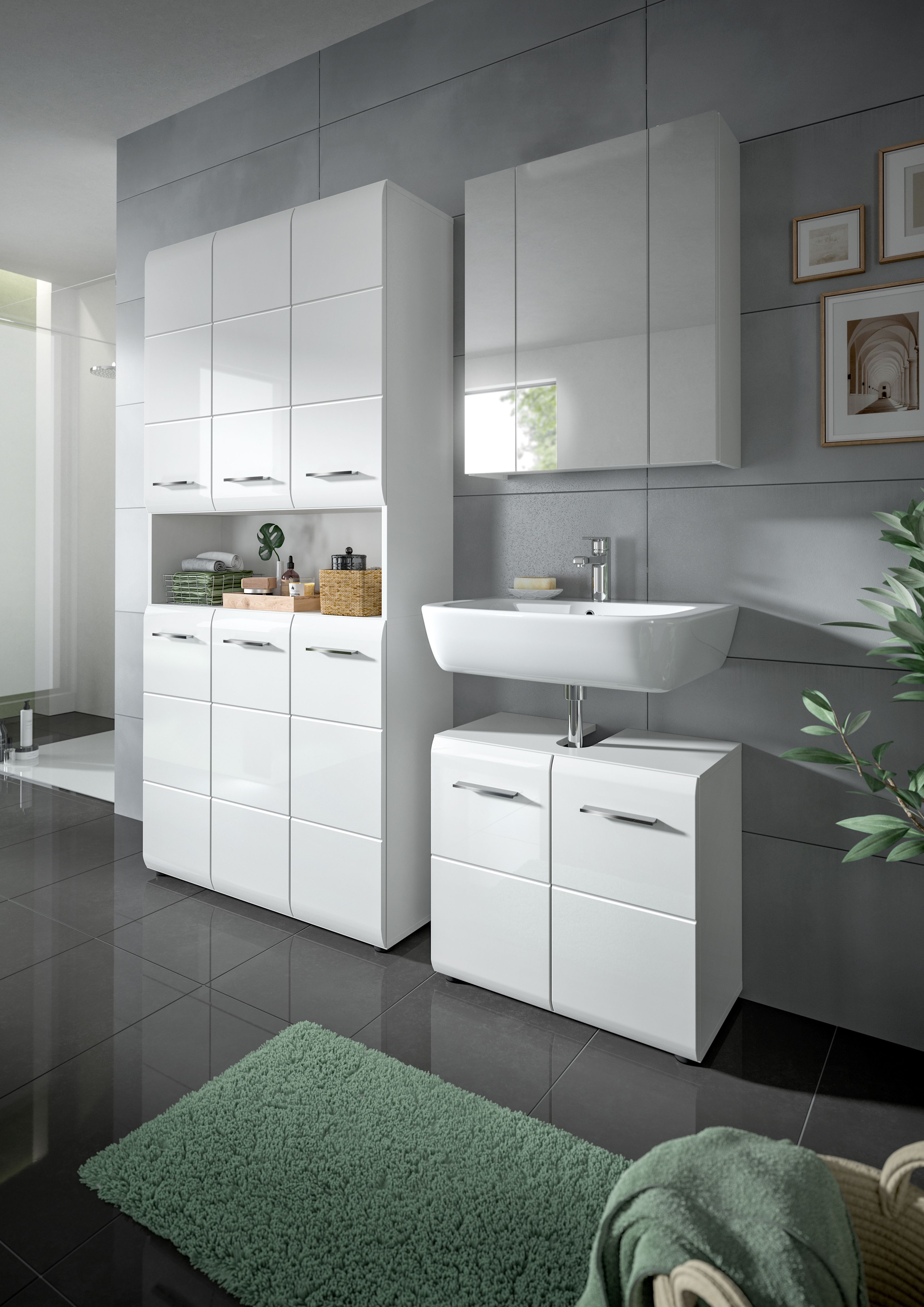 - 3-teilige Badkombination beteht aus 1x Stauraumschrank, 1x WBU, 1x Spiegelschrank