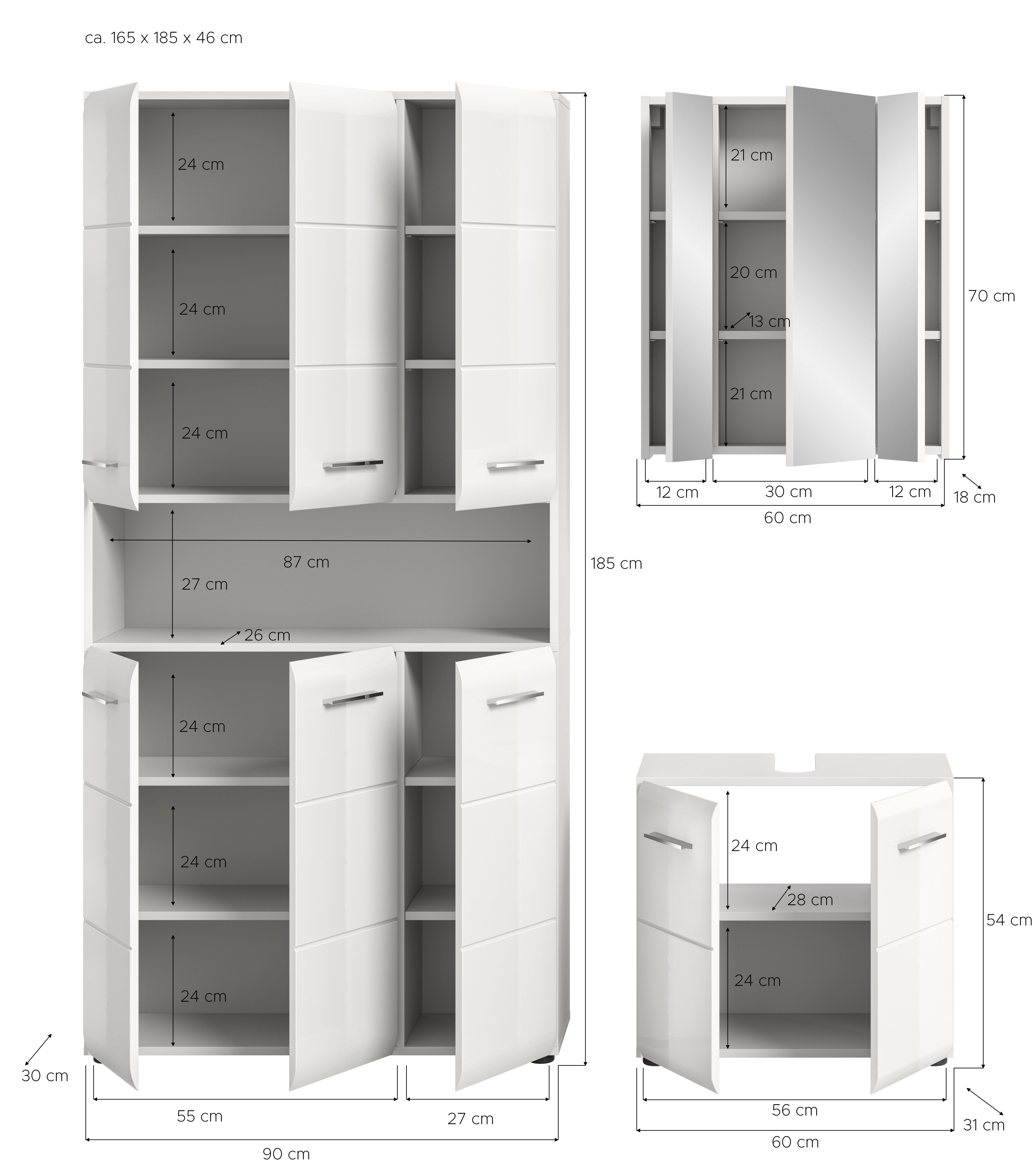 Entdecken Sie die ideale Lösung für Ihre Aufbewahrungsbedürfnisse mit unserer 3-teiligen Badkombination! Diese besteht aus einem praktischen Stauraumschrank, einem Waschbeckenunterschrank (WBU) und einem stilvollen Spiegelschrank. Mit einem Typenabstand von 15 cm und kompakten Abmessungen von 165 x 185 x 30 cm bietet diese Kombination genügend Stauraum bei gleichzeitig eleganter Optik. Die hochwertige MDF-Front mit moderner Rillenfräsung sorgt für Langlebigkeit und zeitgemäßes Design.