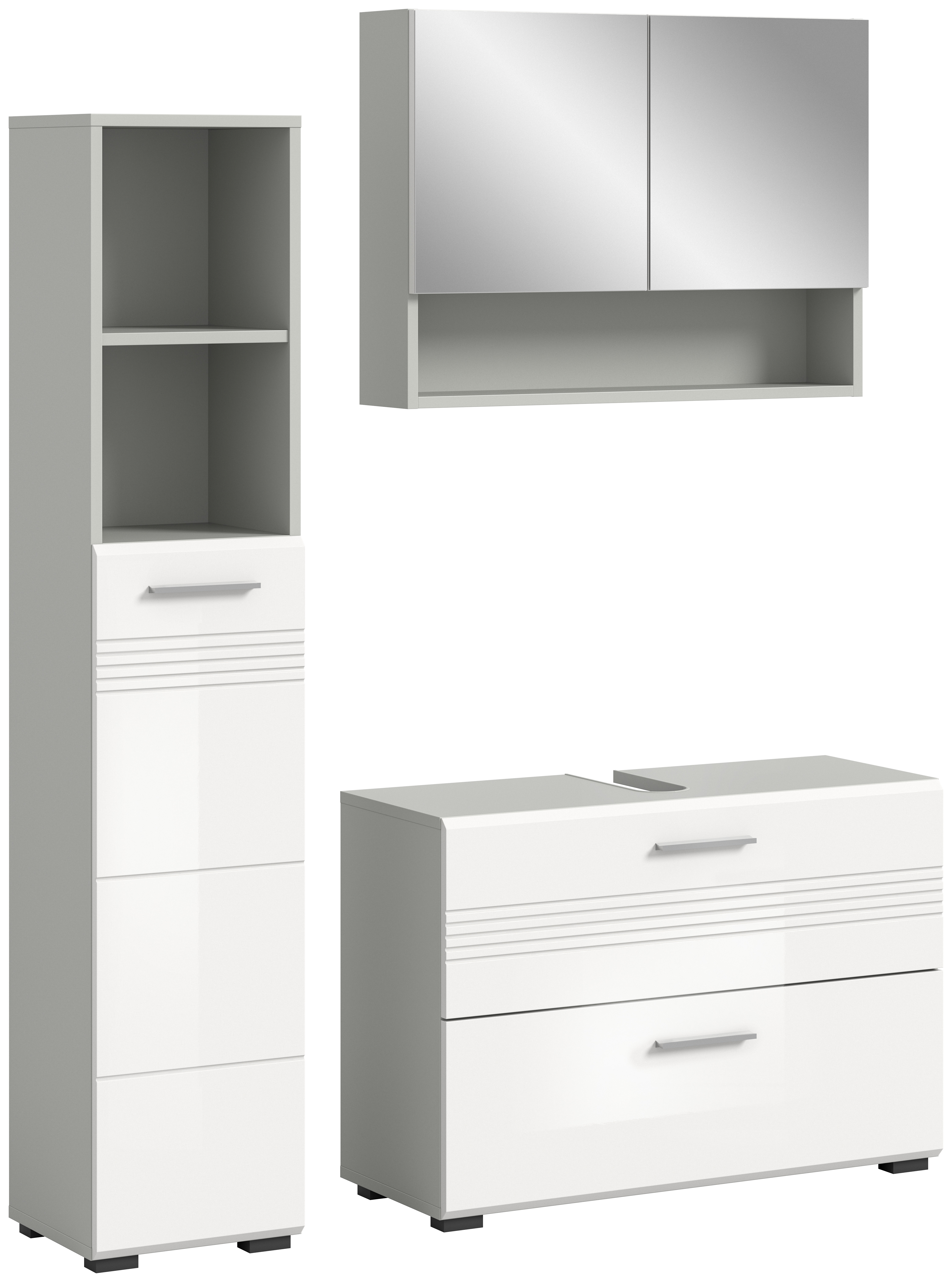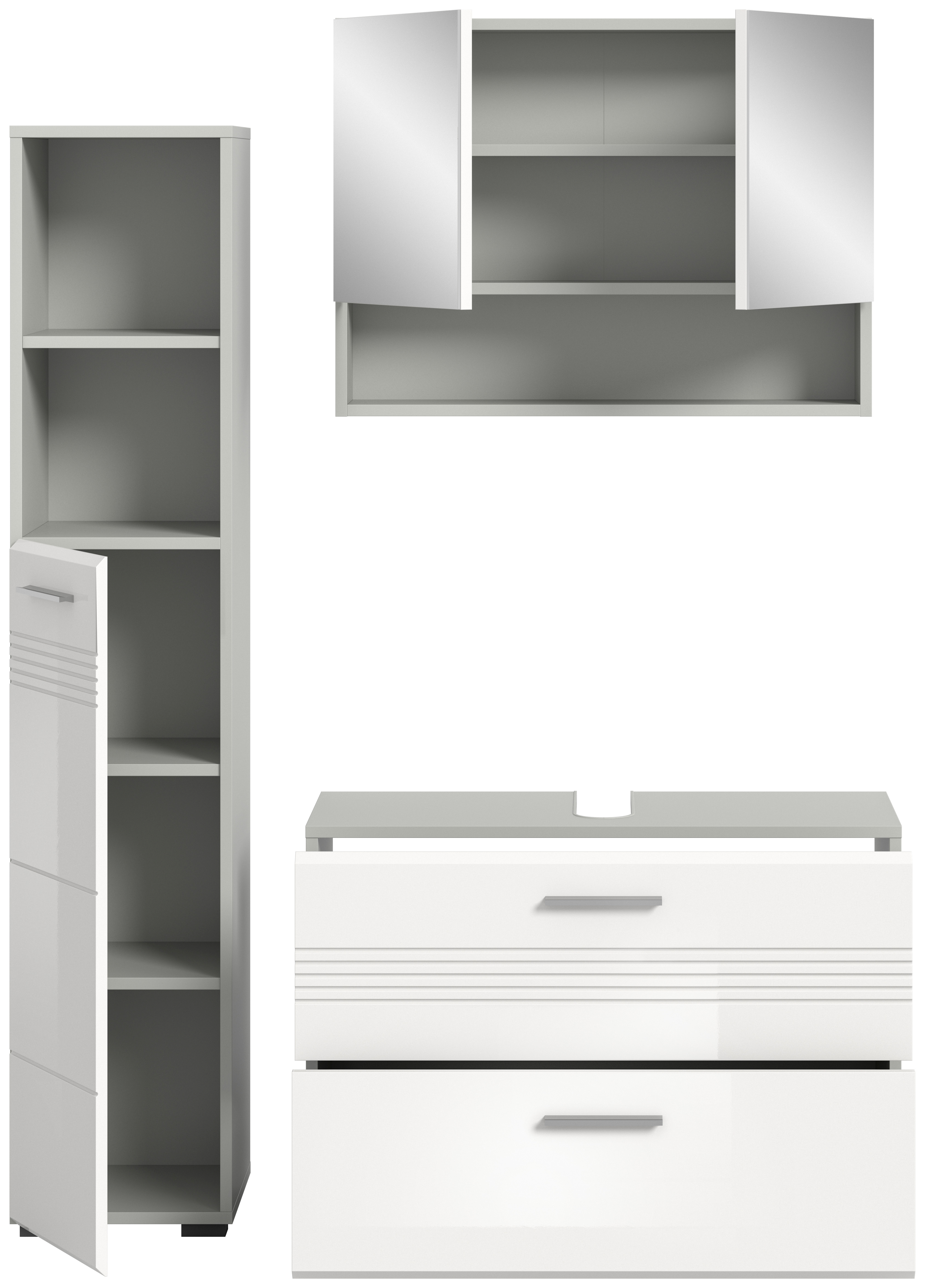 Entdecken Sie unsere moderne Badkombination in eleganter Hellgrau Nachbildung und strahlendem weißem Hochglanz, tiefgezogen für ein glänzendes Finish. Diese Kombination vereint Funktionalität und Stil und bietet mit ihrem zeitgemäßen Design eine perfekte Lösung für Ihr Badezimmer. Mit hochwertiger Verarbeitung und praktischem Stauraum ist sie die ideale Wahl für eine stilvolle und organisierte Badezimmereinrichtung.