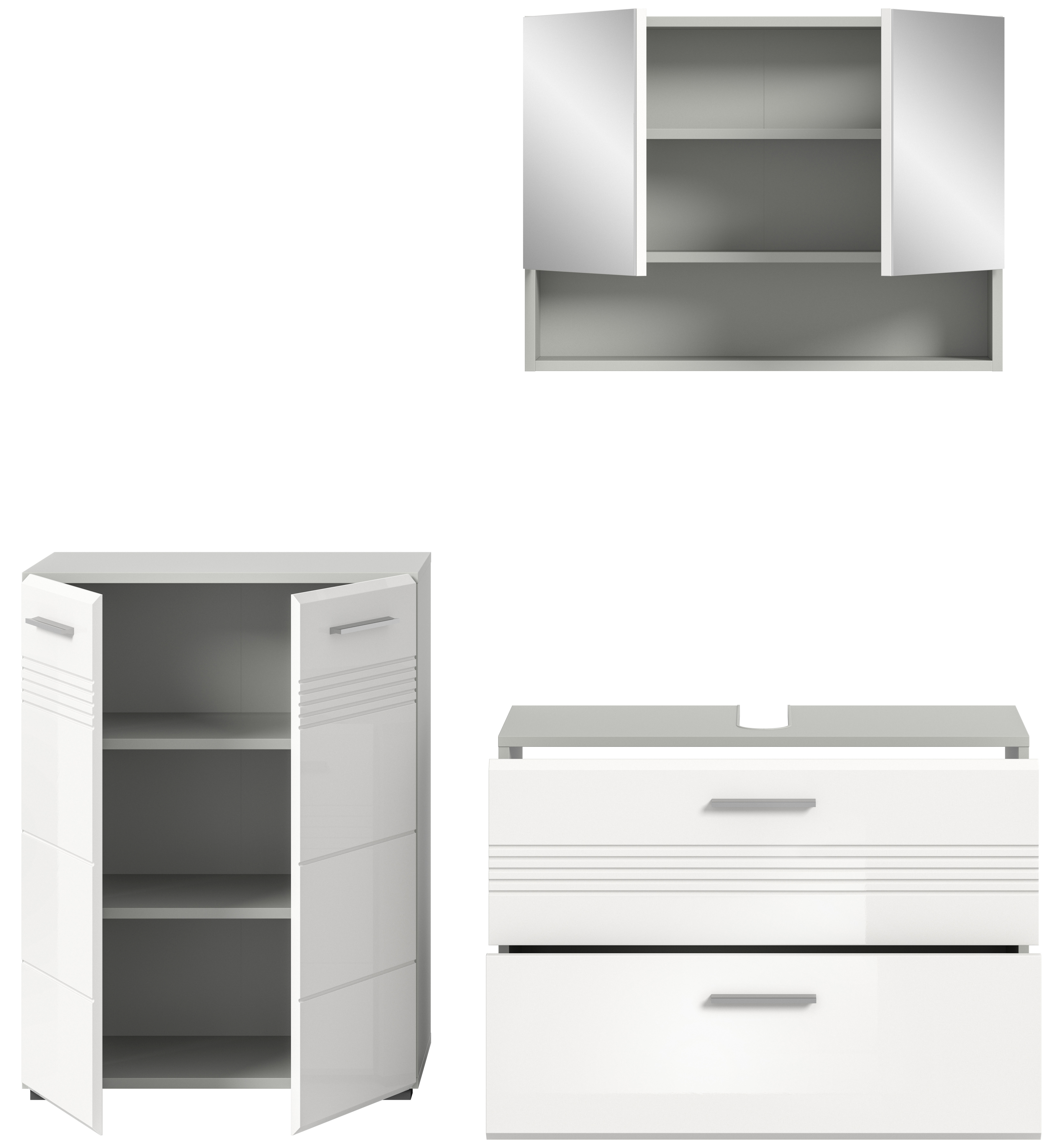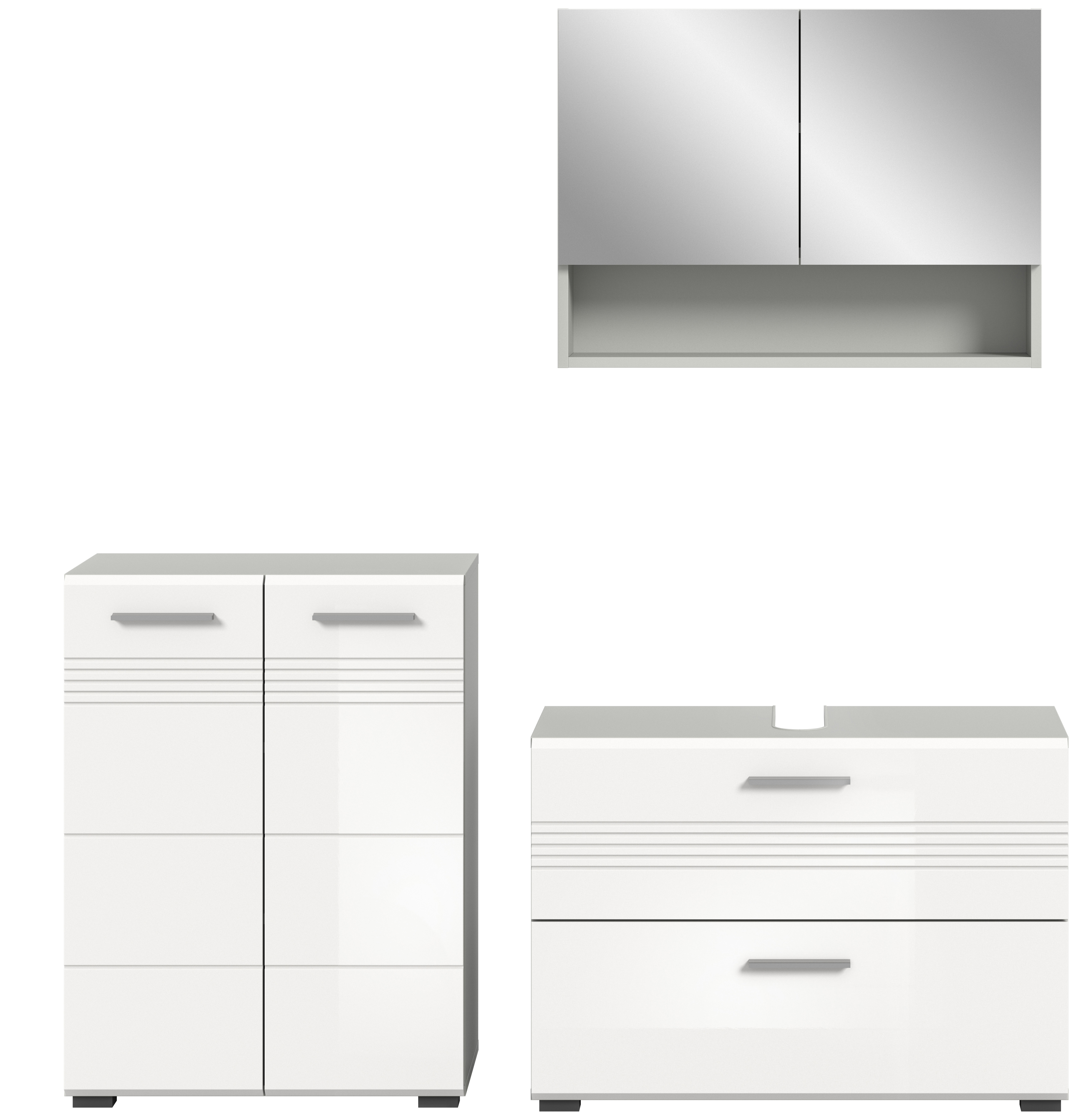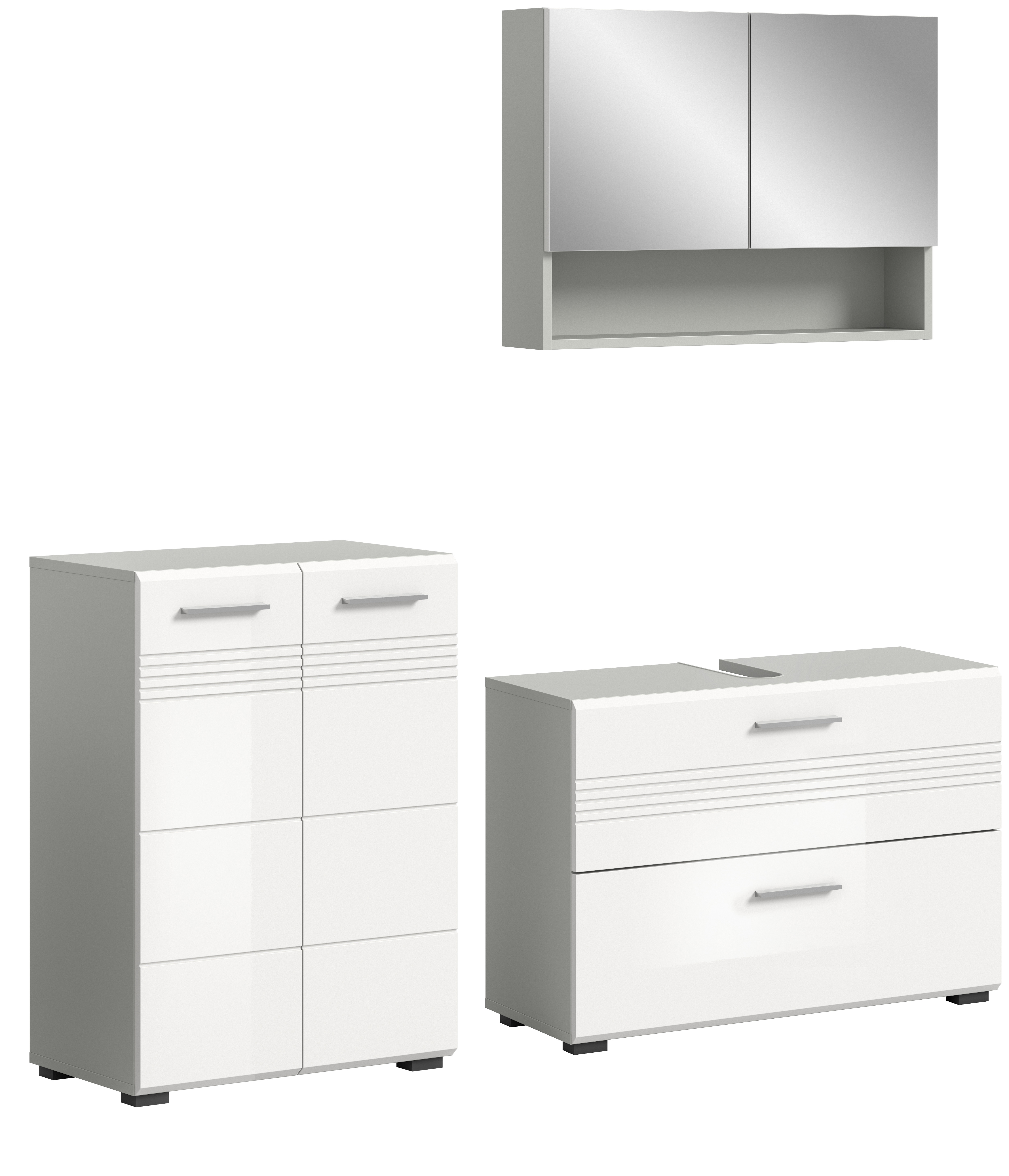 Entdecken Sie unsere moderne Badkombination in eleganter Hellgrau Nachbildung und strahlendem weißem Hochglanz, tiefgezogen für ein glänzendes Finish. Diese Kombination vereint Funktionalität und Stil und bietet mit ihrem zeitgemäßen Design eine perfekte Lösung für Ihr Badezimmer. Mit hochwertiger Verarbeitung und praktischem Stauraum ist sie die ideale Wahl für eine stilvolle und organisierte Badezimmereinrichtung.