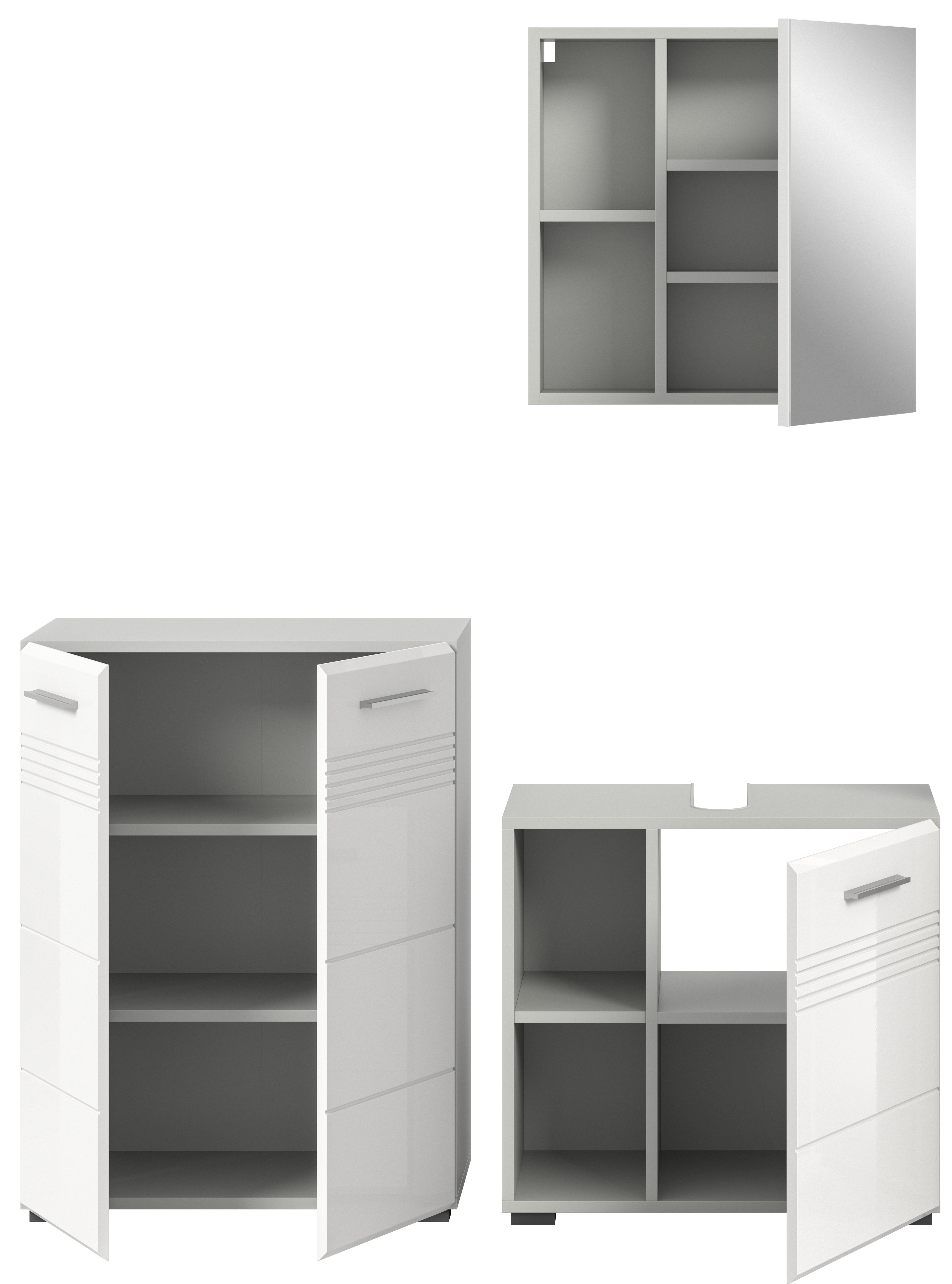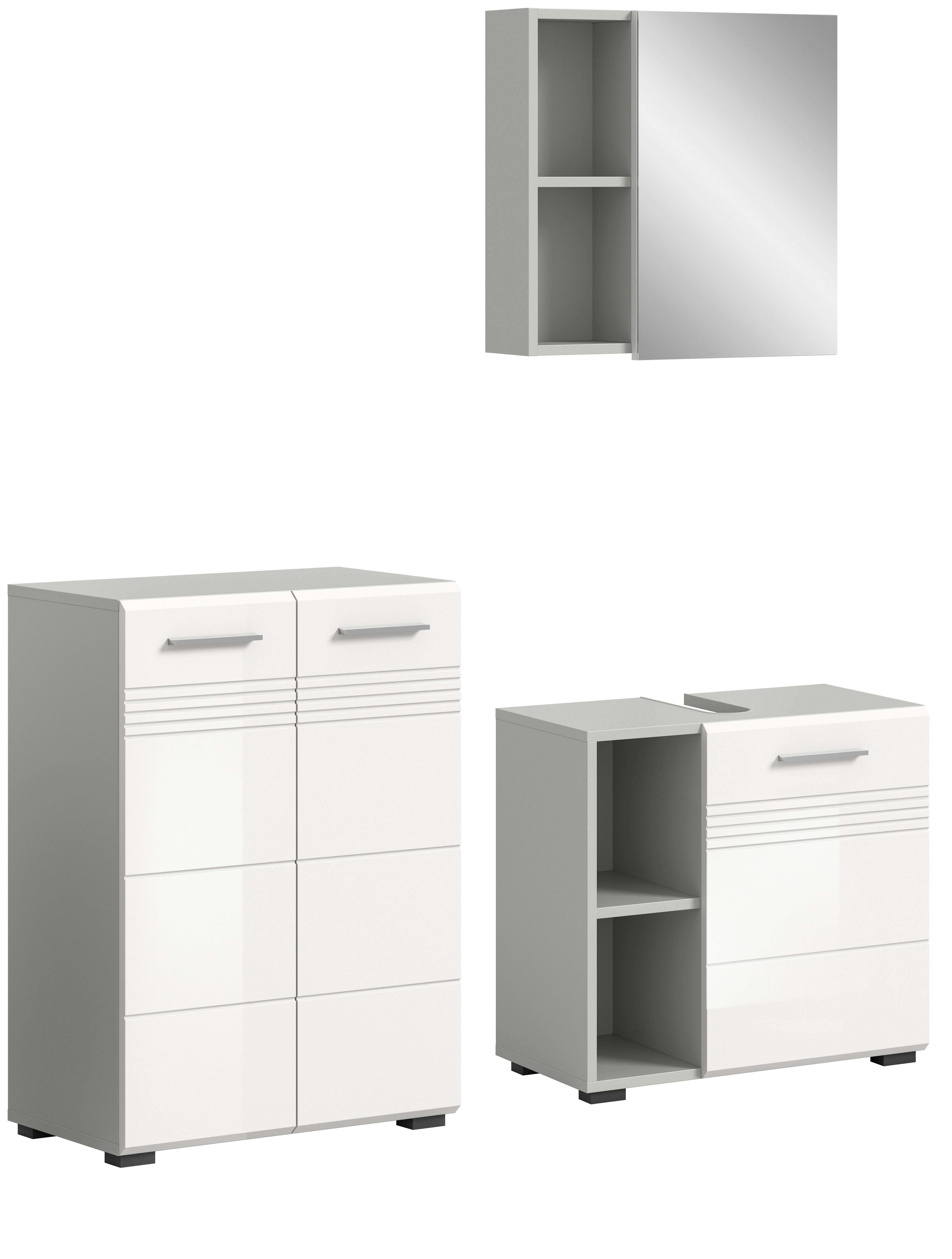 Entdecken Sie unsere moderne Badkombination in eleganter Hellgrau Nachbildung und strahlendem weißem Hochglanz, tiefgezogen für ein glänzendes Finish. Diese Kombination vereint Funktionalität und Stil und bietet mit ihrem zeitgemäßen Design eine perfekte Lösung für Ihr Badezimmer. Mit hochwertiger Verarbeitung und praktischem Stauraum ist sie die ideale Wahl für eine stilvolle und organisierte Badezimmereinrichtung.