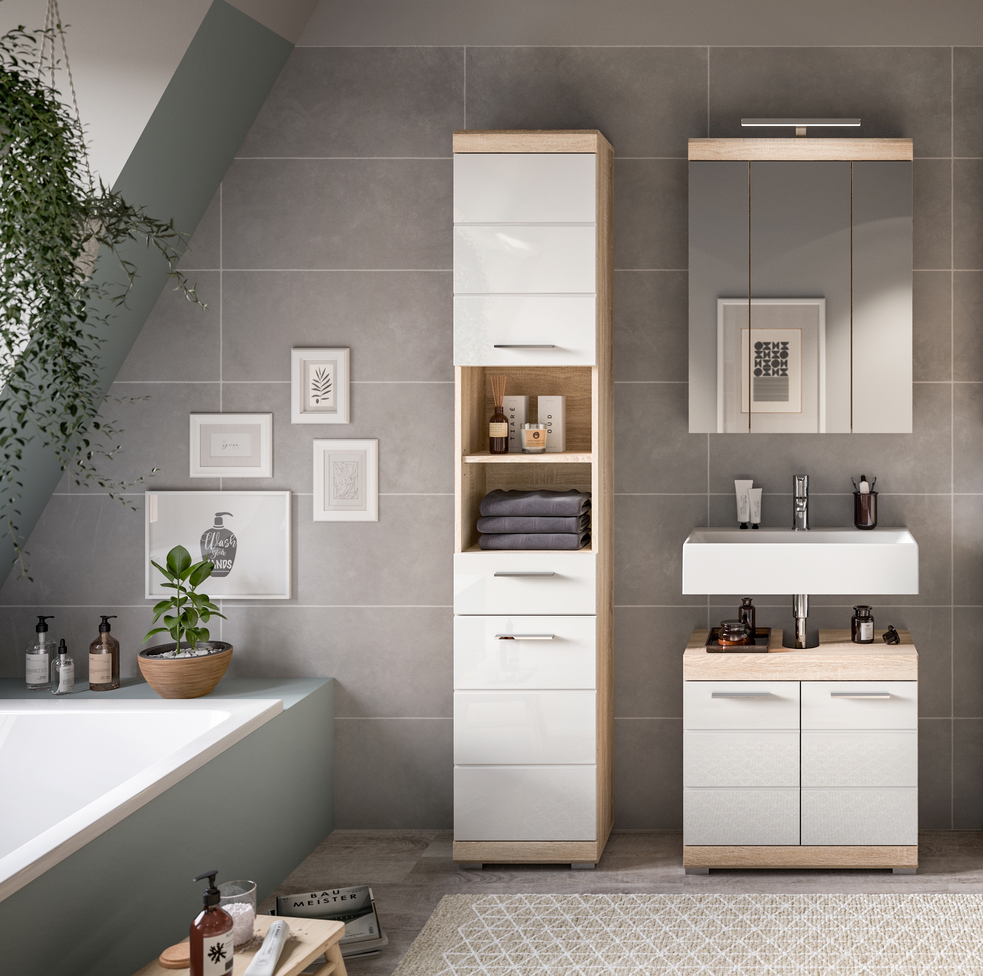Entdecken Sie die perfekte Kombination aus Stil und Funktionalität für Ihr Badezimmer mit unserer Badkombination in Sonoma Eiche hell und weißem Hochglanz. Sie bietet bietet ausreichend Stauraum und verleiht Ihrem Raum einen modernen und ansprechenden Look. Tauchen Sie ein in zeitlose Eleganz und optimale Organisation mit diesem einzigartigen Möbelstück.