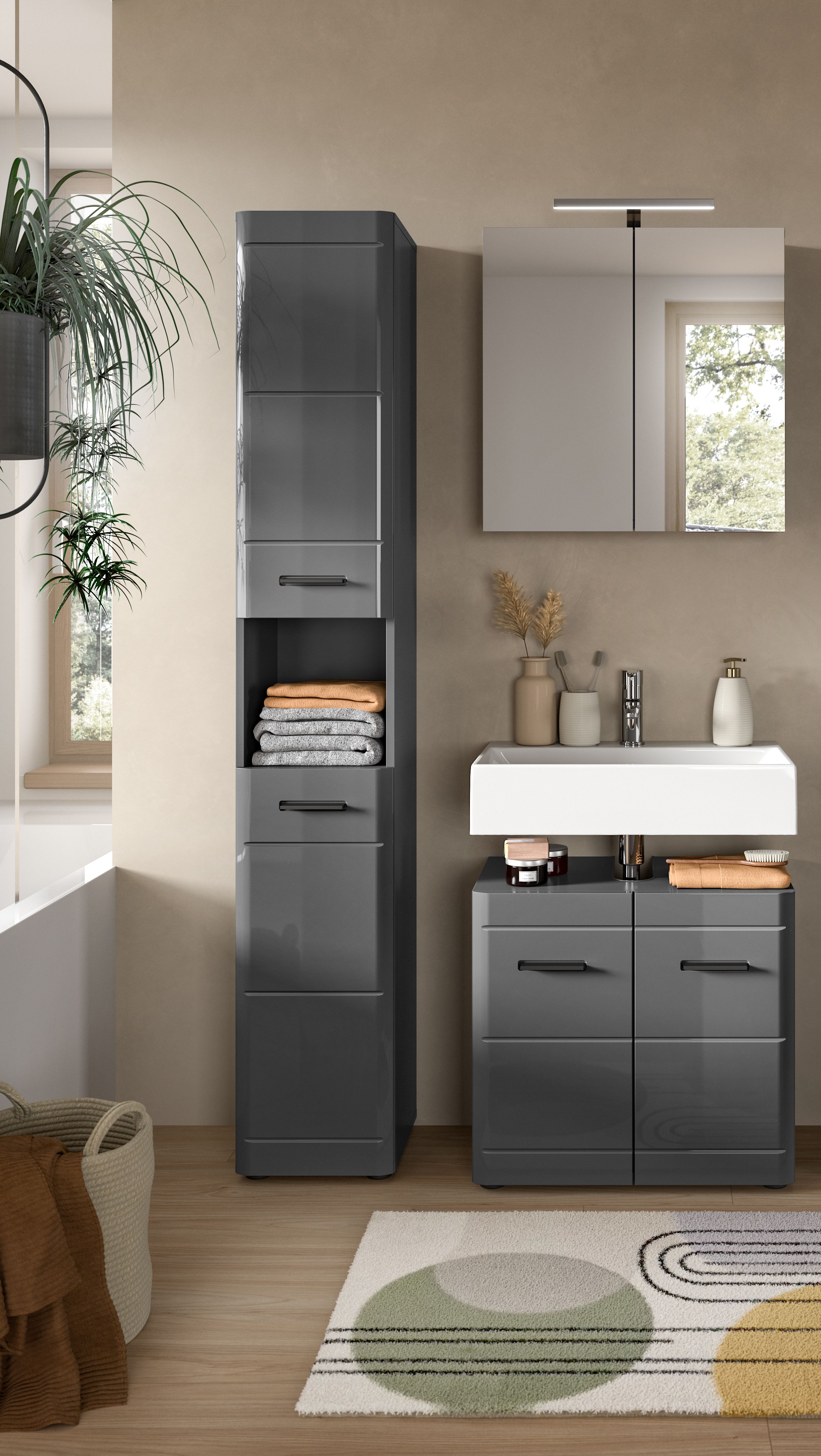 In unserem Sortiment findest du eine Badkombination in eleganter grauer Nachbildung und grauem Hochglanz tiefgezogenem Finish, die deinem Badezimmer eine zeitlose Eleganz verleiht. Mit ihren großzügigen Maßen bietet sie nicht nur reichlich Stauraum für deine Badutensilien, sondern auch eine anspruchsvolle Ästhetik. Entdecke die perfekte Synthese aus Funktionalität und luxuriösem Design mit dieser erstklassigen Badkombination.