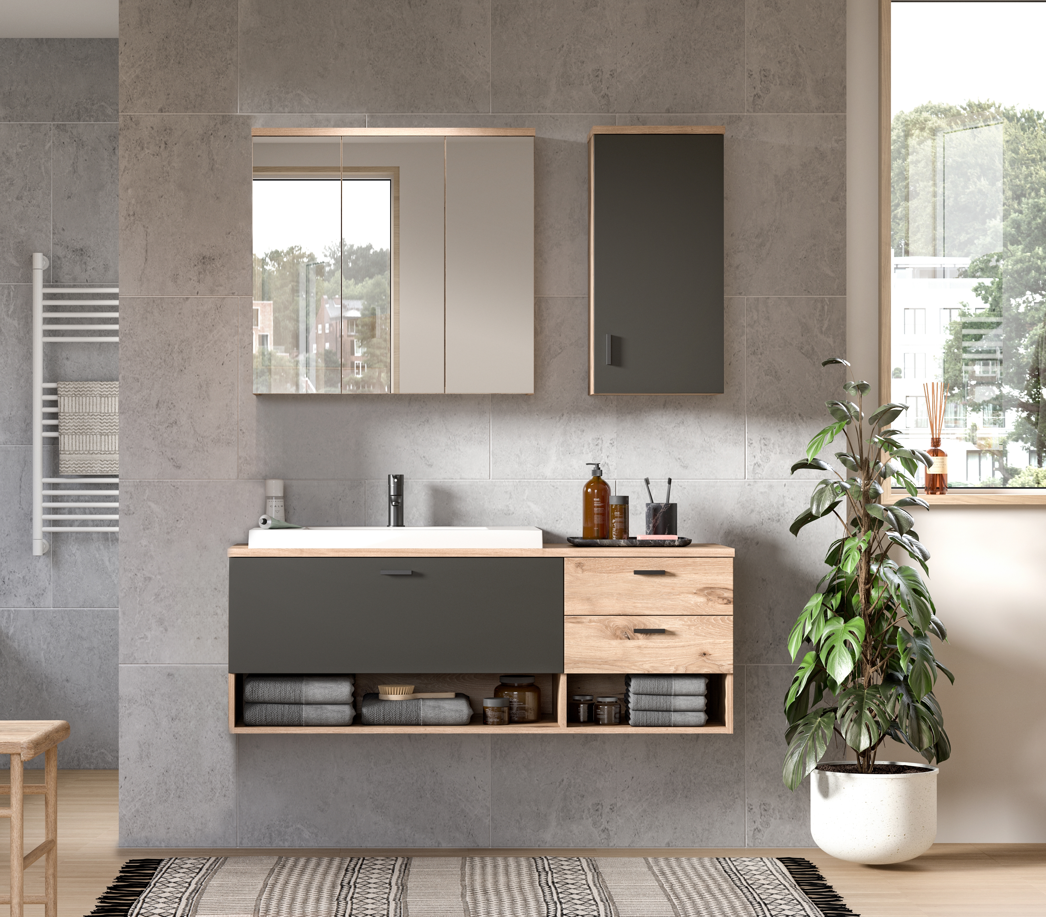 - Funktionalität: Die Badkombination bietet großzügigen Stauraum für die Aufbewahrung von Handtüchern, Kosmetika, Medikamenten und anderen Badutensilien, wodurch sie eine praktische Lösung zur Organisation des Badezimmers darstellt.
