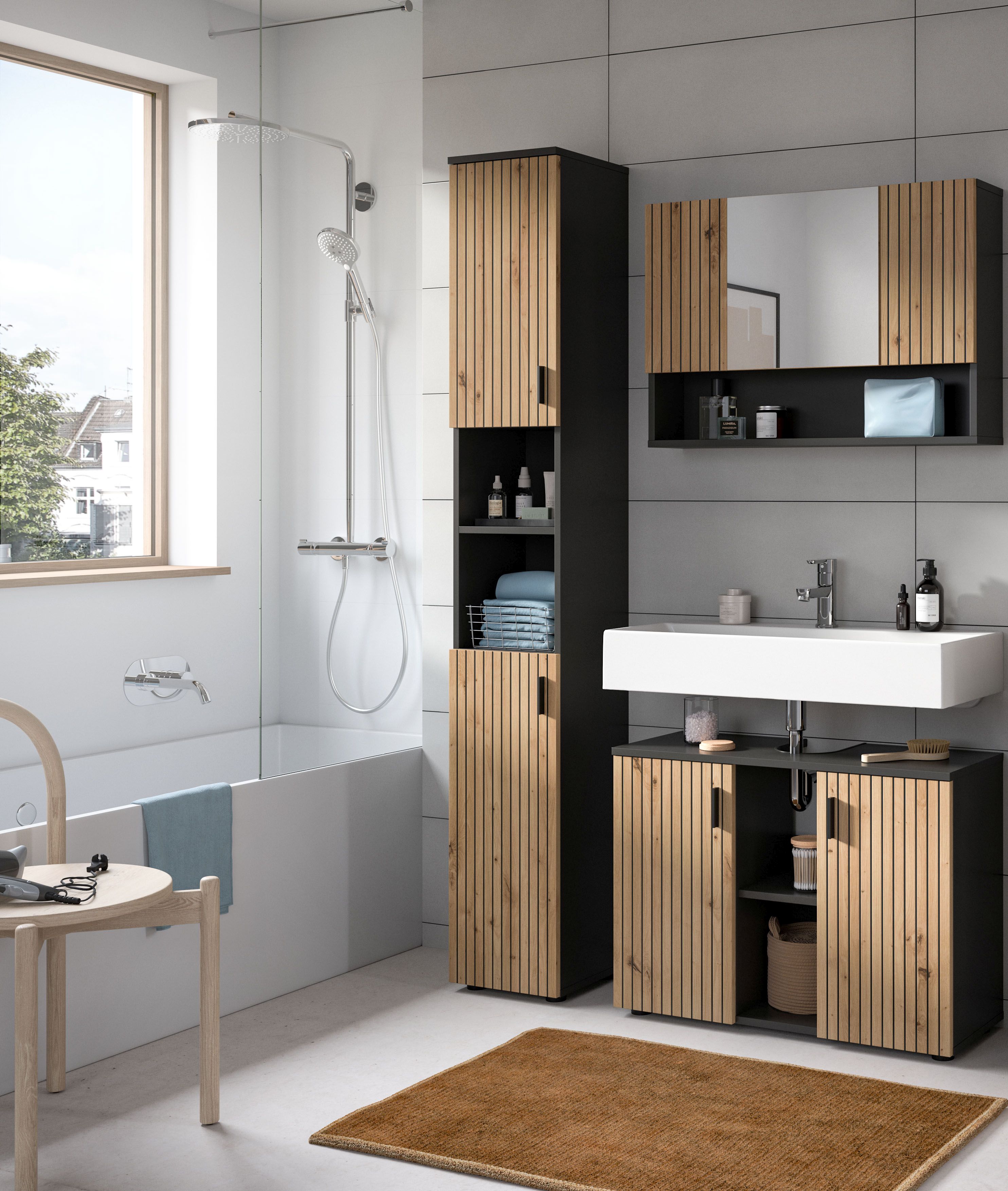 Diese 3-teilige Badkombination in Basalt und Artisan Oak Nachbildung (125 x 192 x 30 cm) bietet dir eine durchdachte Lösung für dein Badezimmer. Das Set besteht aus einem Badschrank, einem Waschbeckenunterschrank und einem Spiegelschrank, die perfekt aufeinander abgestimmt sind. Die pflegeleichte Front mit eingefräster Paneeloptik sorgt für eine moderne, elegante Optik und ist besonders einfach zu reinigen. Mit ausreichend Stauraum für Pflegeprodukte, Handtücher und mehr unterstützt diese Kombination eine aufgeräumte und funktionale Badgestaltung. Die hochwertigen Materialien garantieren Langlebigkeit und Stabilität. Zudem kannst du durch die vielfältigen Kombinationsmöglichkeiten der Serie dein Badezimmer individuell und flexibel gestalten. Dieses Set verbindet Design, Qualität und Funktionalität für dein Wohlfühlbad.