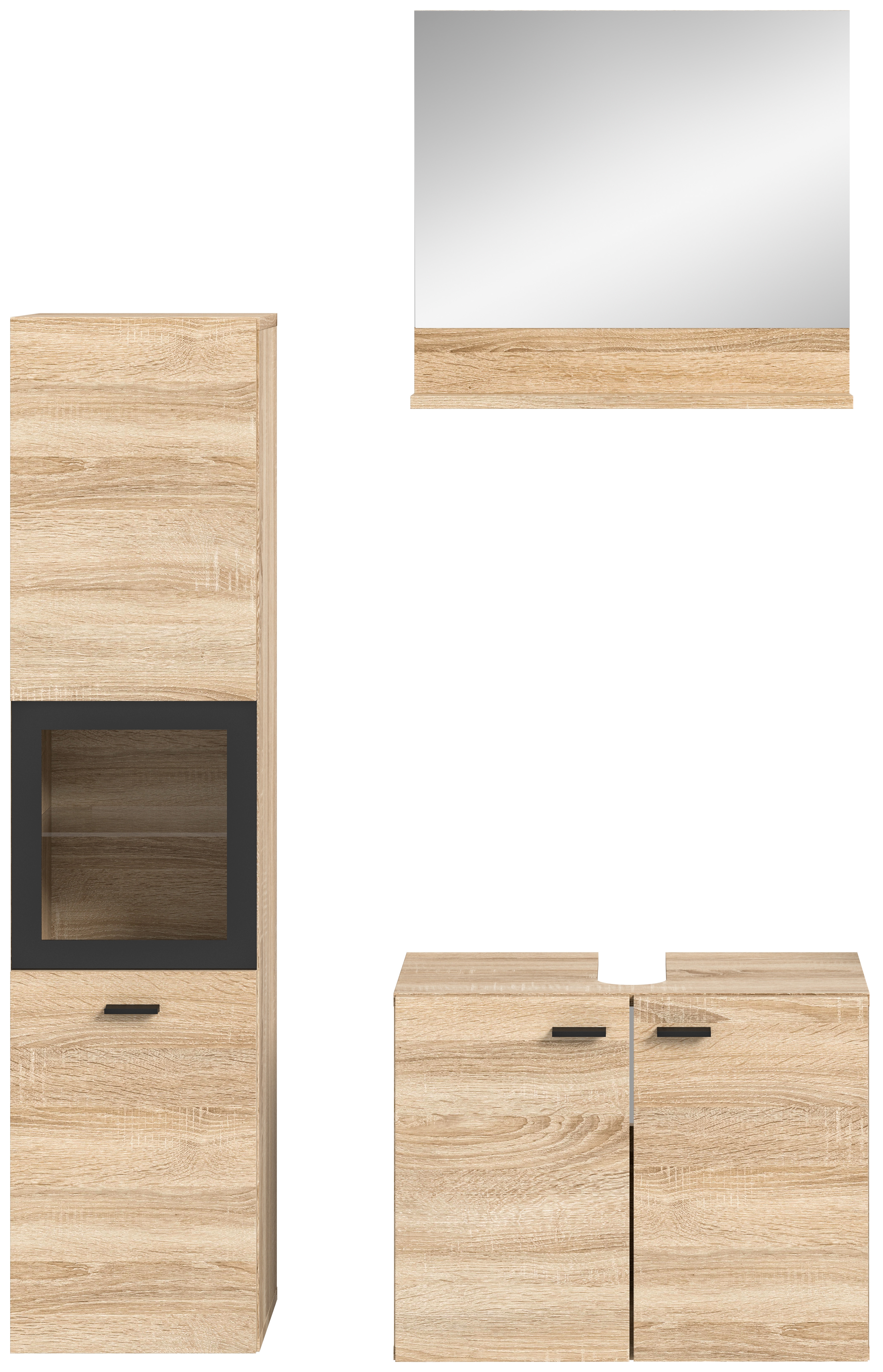 Unsere Badkombination in Eiche Sonoma Nachbildung bietet maximale Flexibilität, um Ihr Badezimmer nach Ihren individuellen Vorstellungen zu gestalten. Das zeitlose Design fügt sich harmonisch in jedes Badezimmer ein und verleiht ihm eine warme und natürliche Atmosphäre. Erforschen Sie jetzt diese vielseitige Lösung für Ihr Badezimmer.