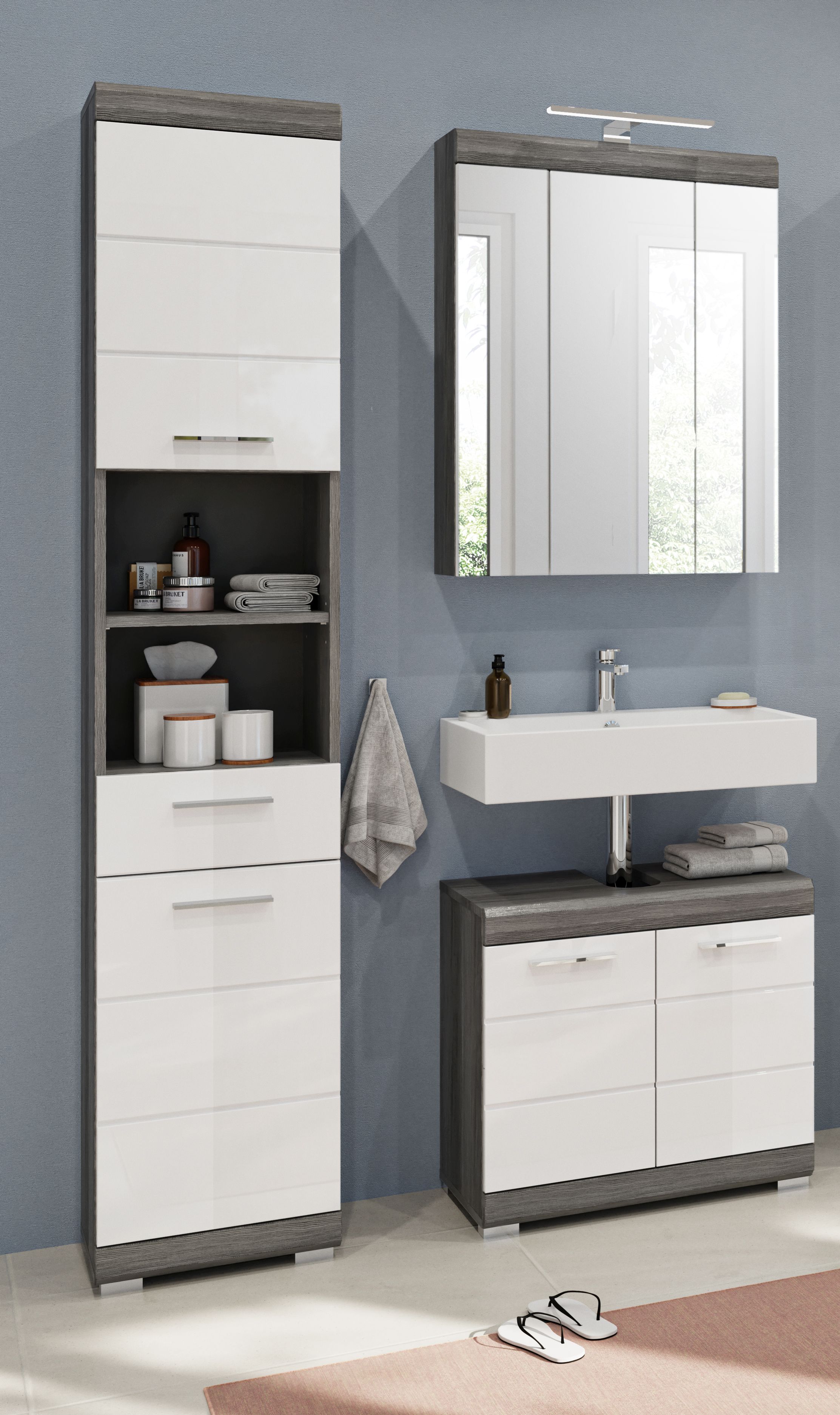 Verleihe deinem Badezimmer den ultimativen Style mit unserer Badkombination in angesagtem Rauchsilber Nachbildung und weißem Hochglanz tiefgezogenem Finish. Mit ihrem trendigen Design und der hochwertigen Verarbeitung setzt sie ein modernes Statement in deinem Zuhause. Entdecke jetzt die perfekte Verbindung von Coolness und Funktionalität für dein Badezimmer!