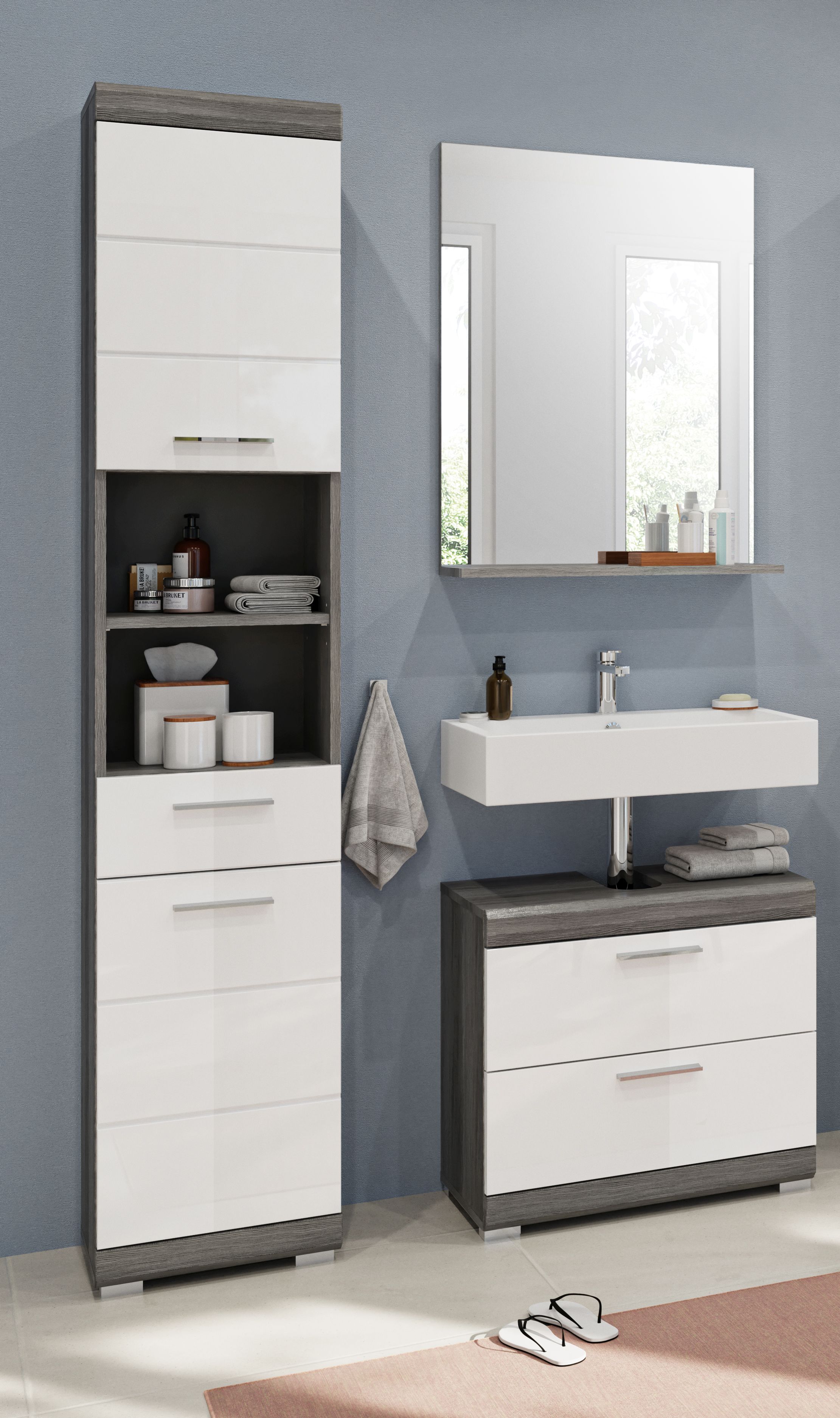 Verleihe deinem Badezimmer den ultimativen Style mit unserer Badkombination in angesagtem Rauchsilber Nachbildung und weißem Hochglanz tiefgezogenem Finish. Mit ihrem trendigen Design und der hochwertigen Verarbeitung setzt sie ein modernes Statement in deinem Zuhause. Entdecke jetzt die perfekte Verbindung von Coolness und Funktionalität für dein Badezimmer!