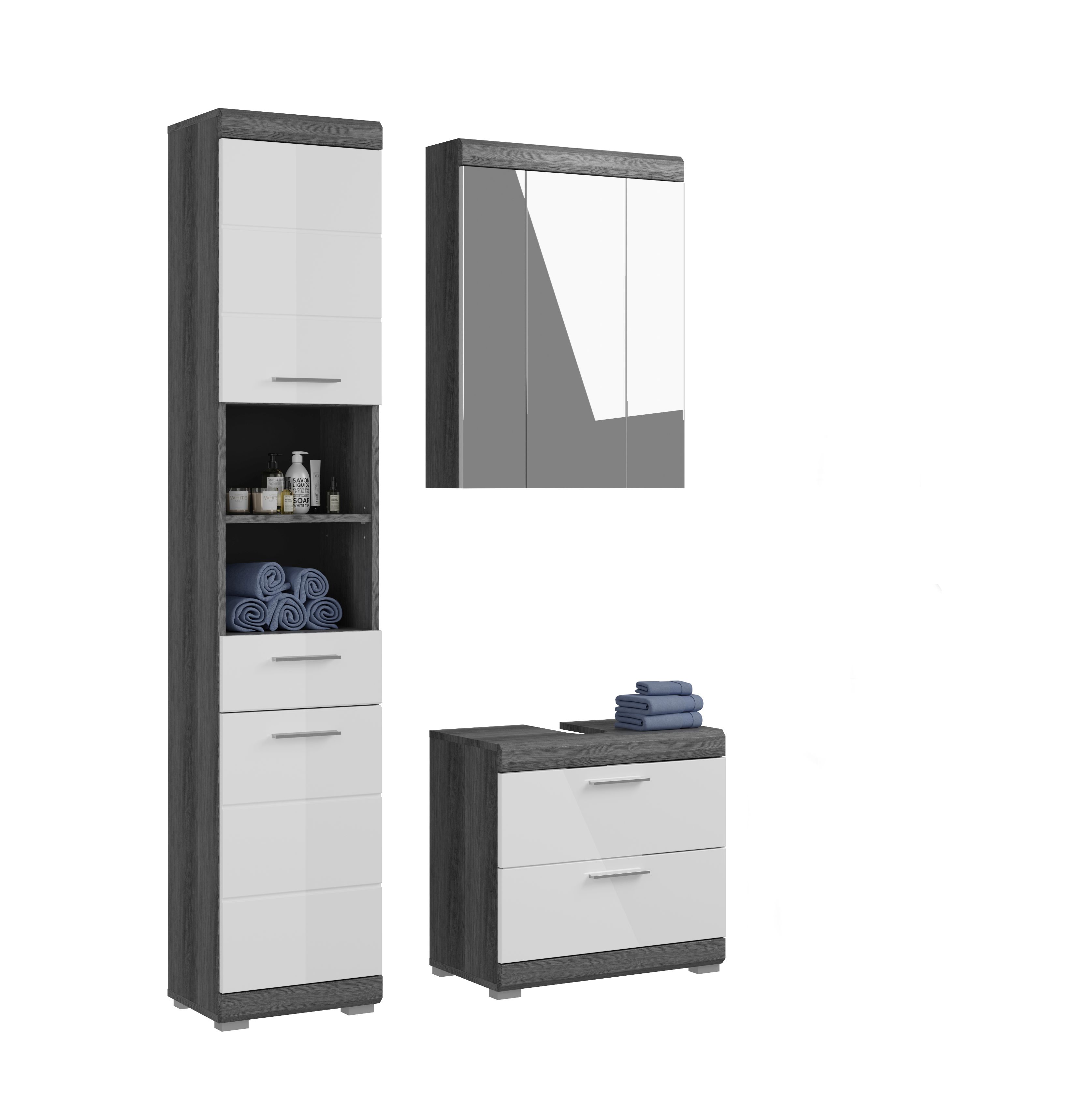 Verleihe deinem Badezimmer den ultimativen Style mit unserer Badkombination in angesagtem Rauchsilber Nachbildung und weißem Hochglanz tiefgezogenem Finish. Mit ihrem trendigen Design und der hochwertigen Verarbeitung setzt sie ein modernes Statement in deinem Zuhause. Entdecke jetzt die perfekte Verbindung von Coolness und Funktionalität für dein Badezimmer!