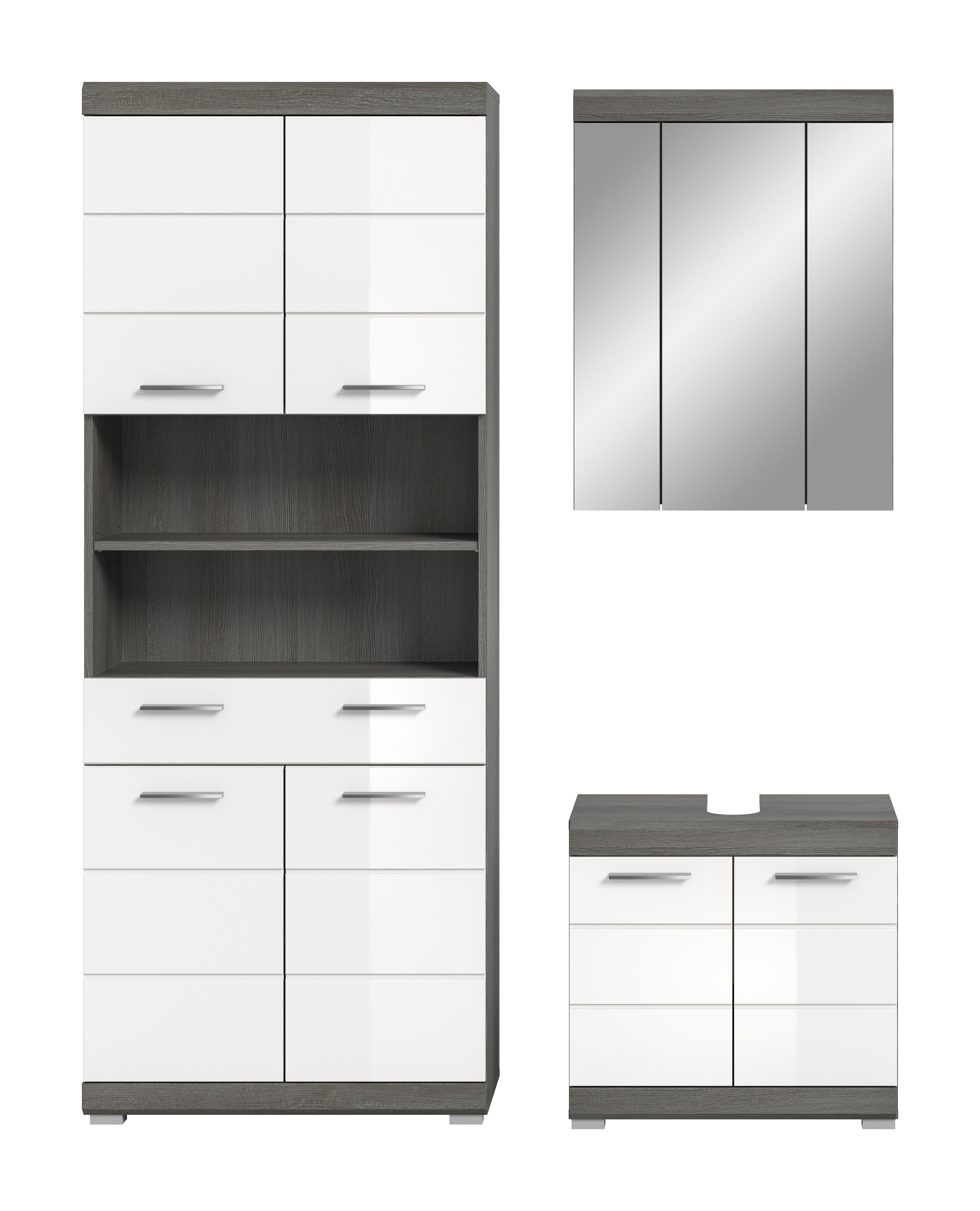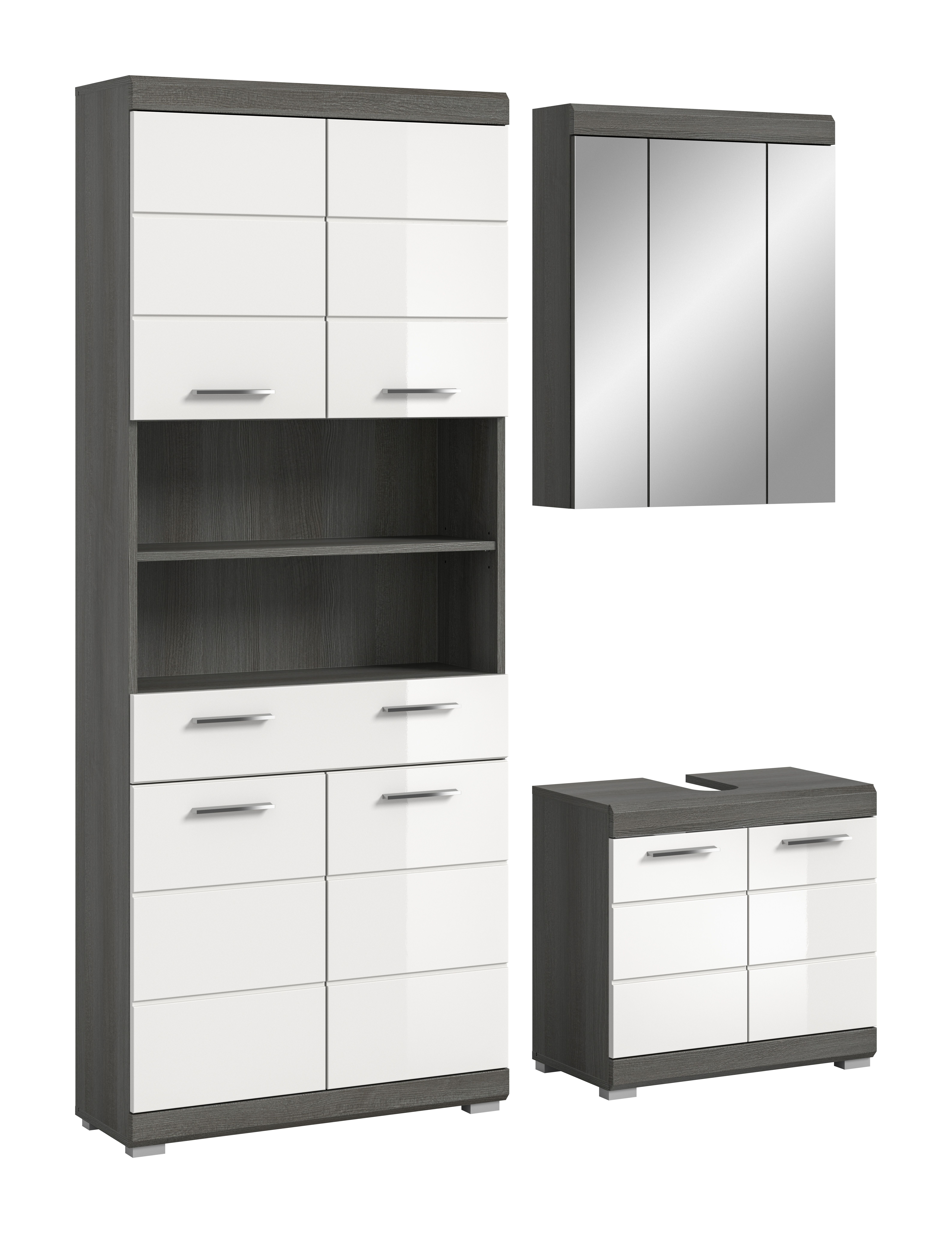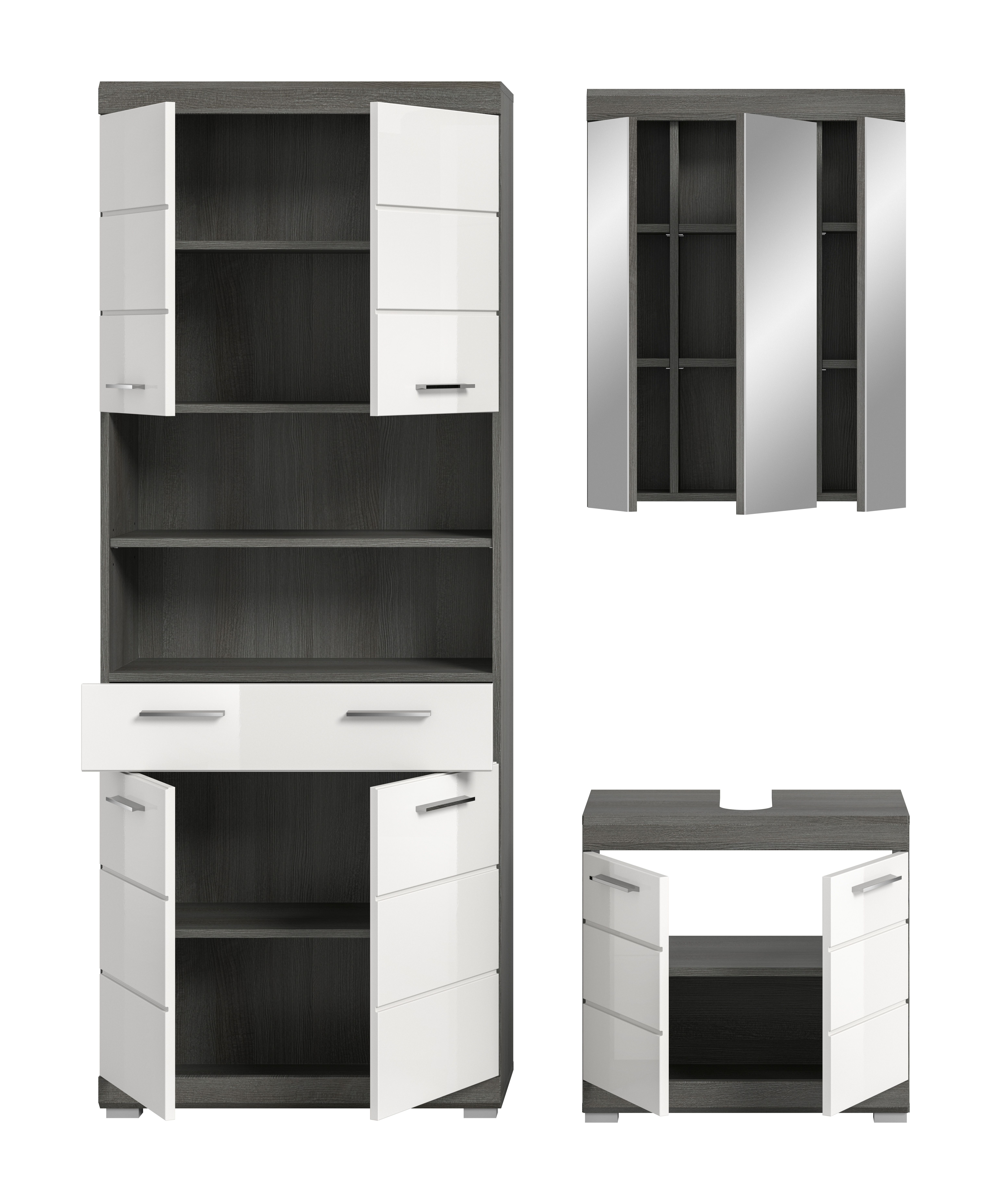 - 3-teiliges Set, bestehend aus: 1x Hochschrank, 1x Waschbeckenunterschrank, 1x Spiegelschrank