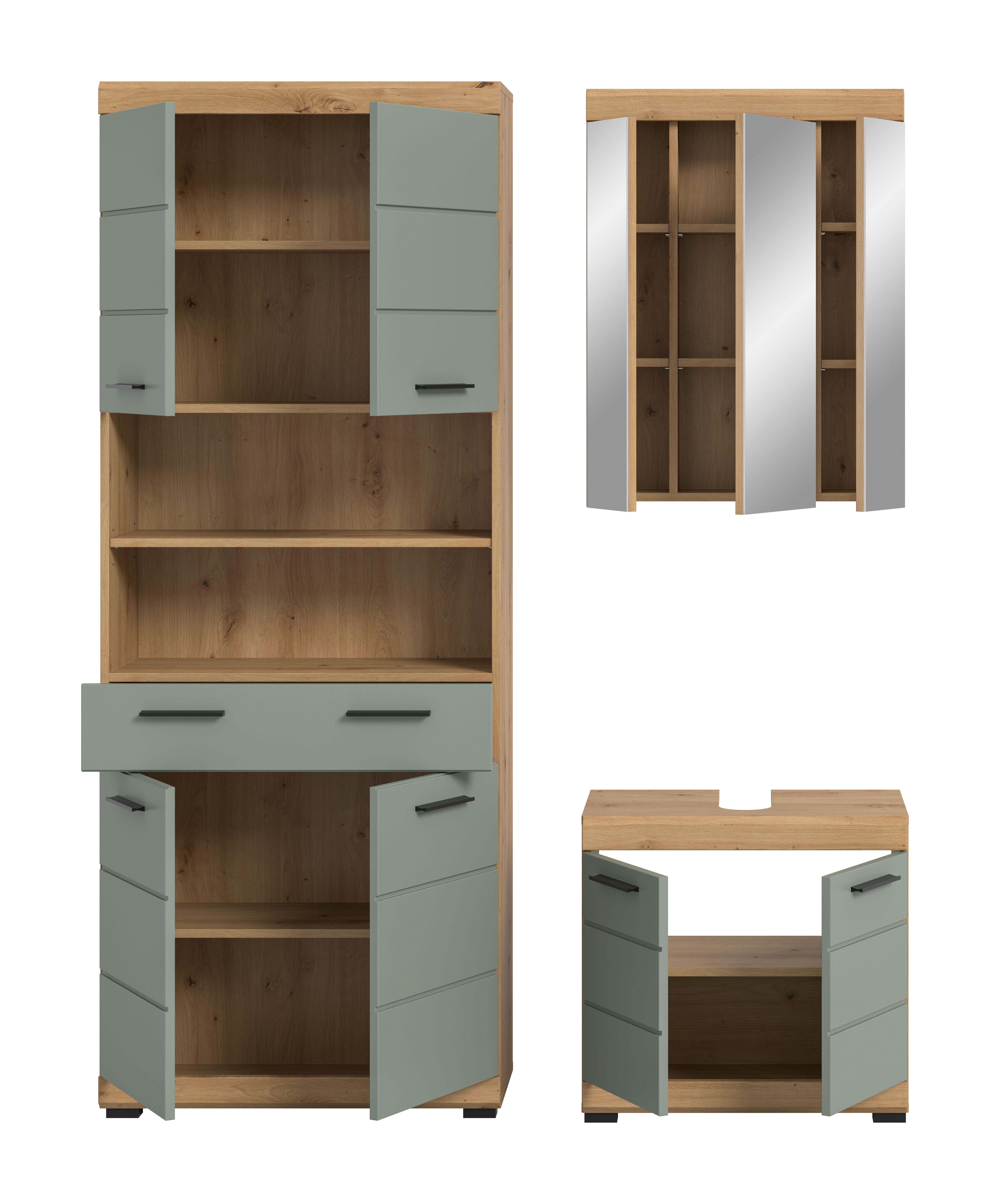 Diese 3-teilige Badkombination in Artisan Eiche Holznachbildung und Salbei (149 x 191 x 34 cm) besteht aus einem Hochschrank, einem Waschbeckenunterschrank und einem Spiegelschrank. Die hochwertig verarbeitete MDF-Front mit eingefräster Rillenoptik verleiht deinem Bad eine moderne und elegante Optik. Die pflegeleichte Oberfläche erleichtert die Reinigung und sorgt für eine langanhaltende Schönheit. Die Kombination bietet dir viel Stauraum für Handtücher, Pflegeprodukte und weitere Badutensilien, sodass dein Bad stets ordentlich und funktional bleibt. Die Möbel sind robust und langlebig, was den Alltag erleichtert. Mit dieser Badkombination schaffst du eine harmonische Verbindung aus Design, Qualität und Funktionalität.