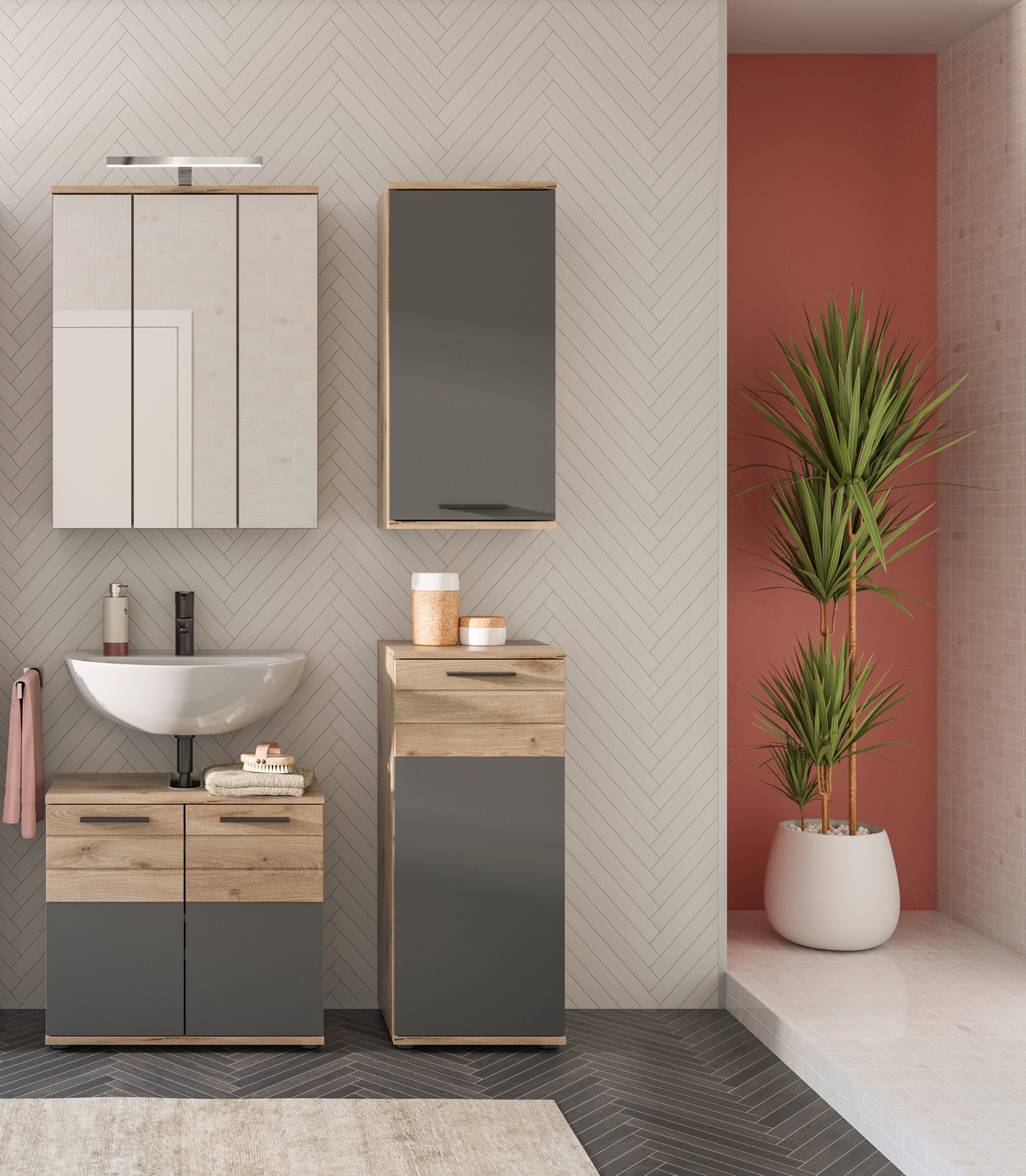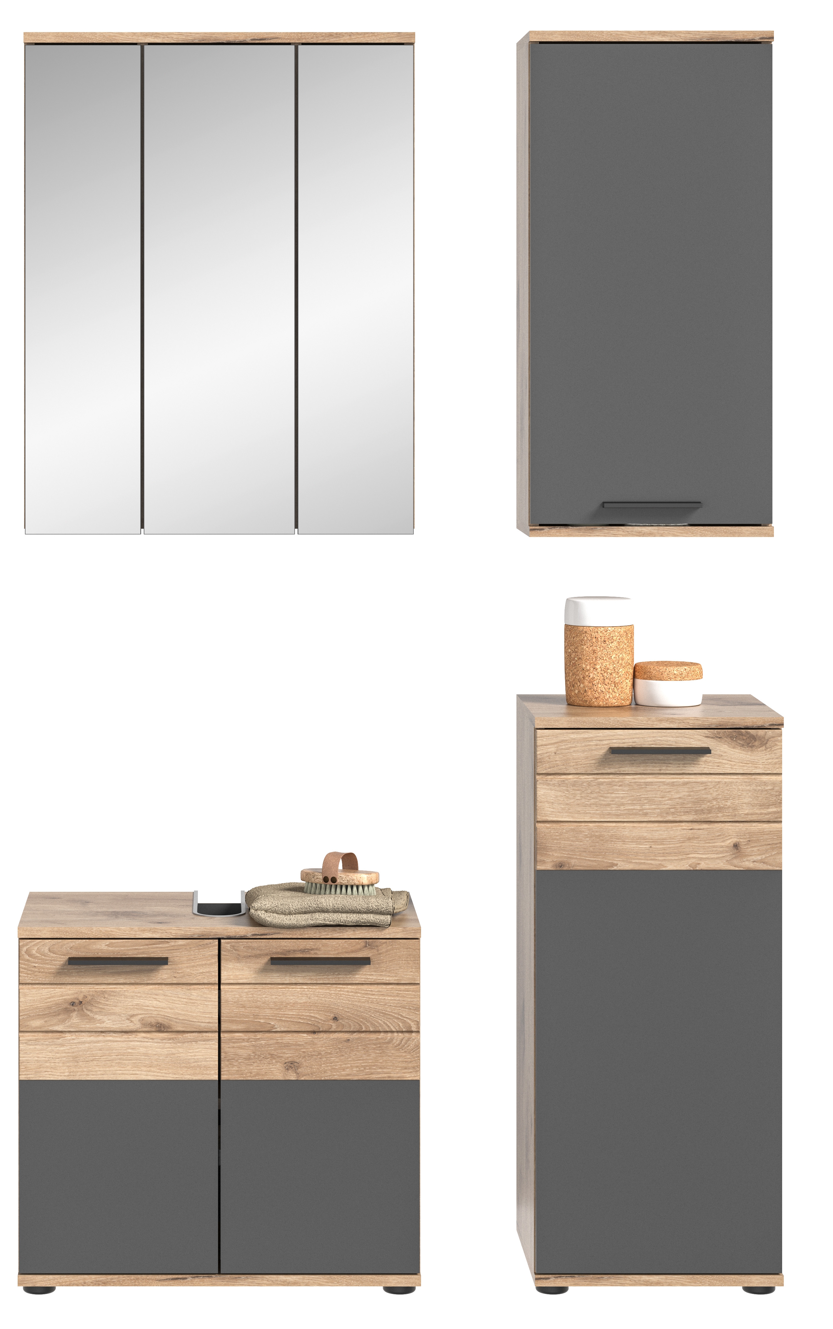 Verwandeln Sie Ihr Badezimmer in eine Oase der Entspannung mit unserer vielseitigen Badkombination in Nox Oak und Basalt grau Nachbildung. Bestehend aus Waschbeckenunterschrank, Hängeschrank, Badkommode und Spiegelschrank, bietet sie nicht nur ausreichend Stauraum, sondern auch ein modernes Design. Mit ihrer hochwertigen Verarbeitung und der harmonischen Farbkombination wird diese Badkombination zum Blickfang in Ihrem Badezimmer.