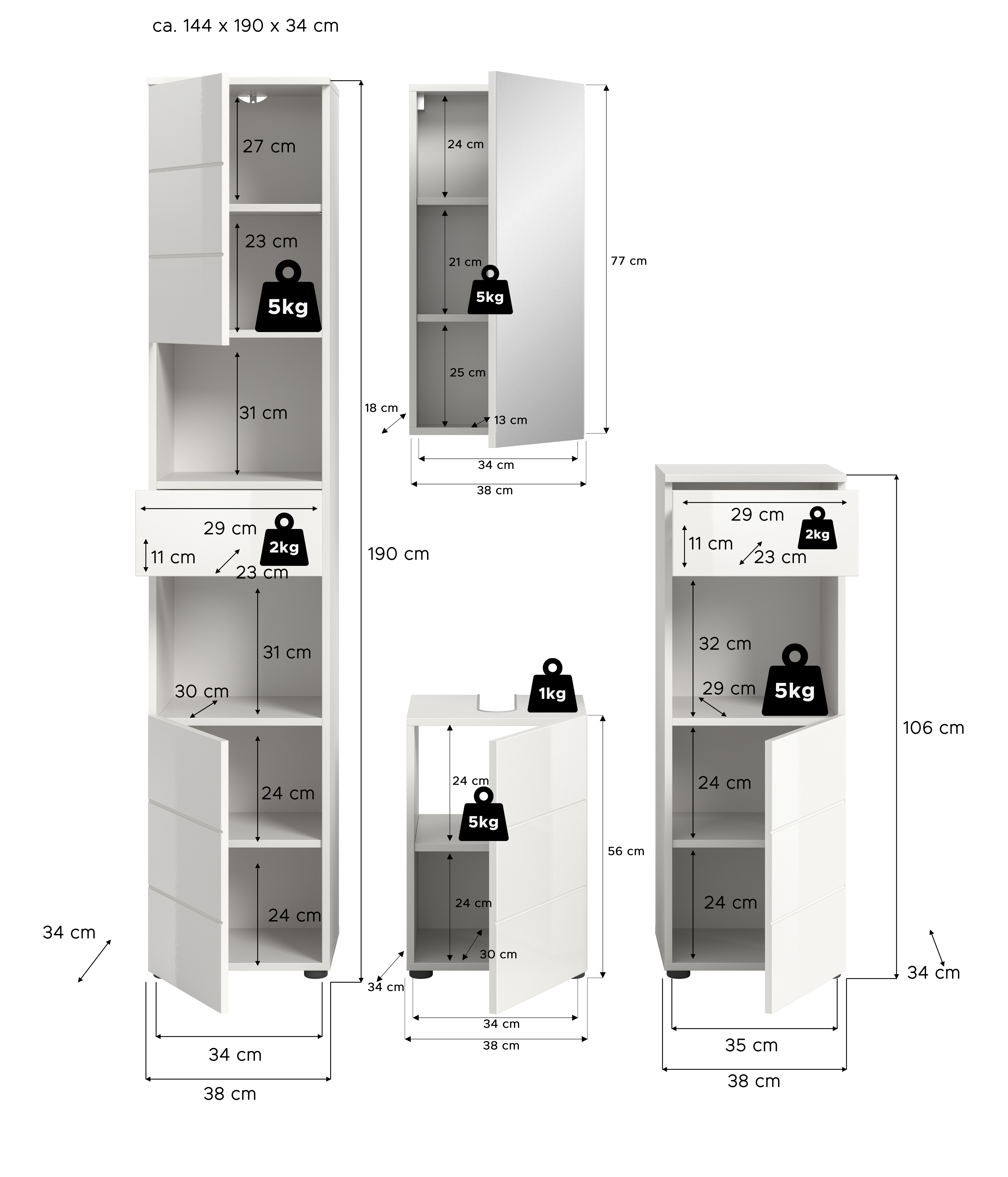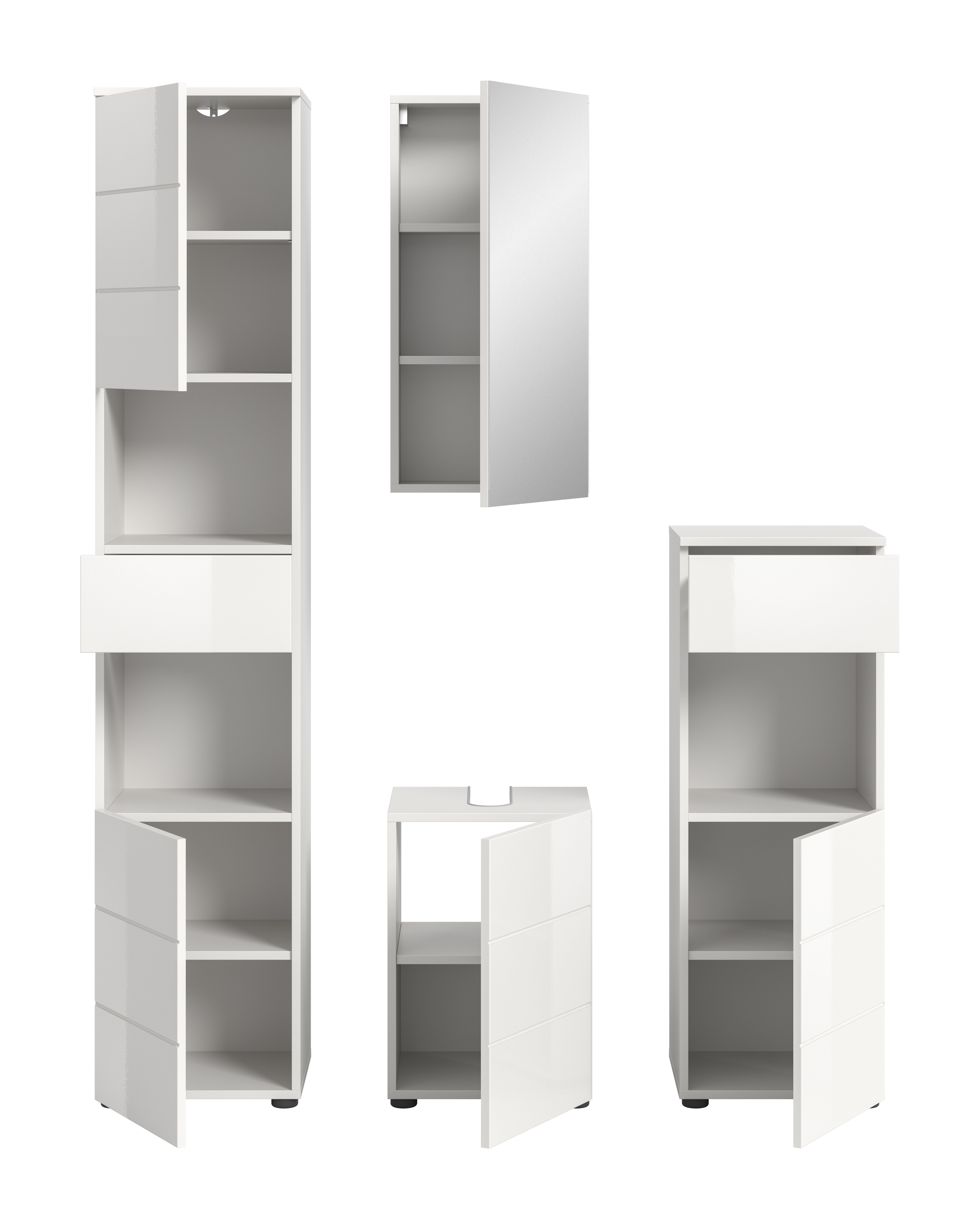 - 4 tlg. Set besteht aus: 1x Hochschrank, 1x Waschbeckenunterschrank, 1x Spiegelschrank, 1x Badschrank schmal