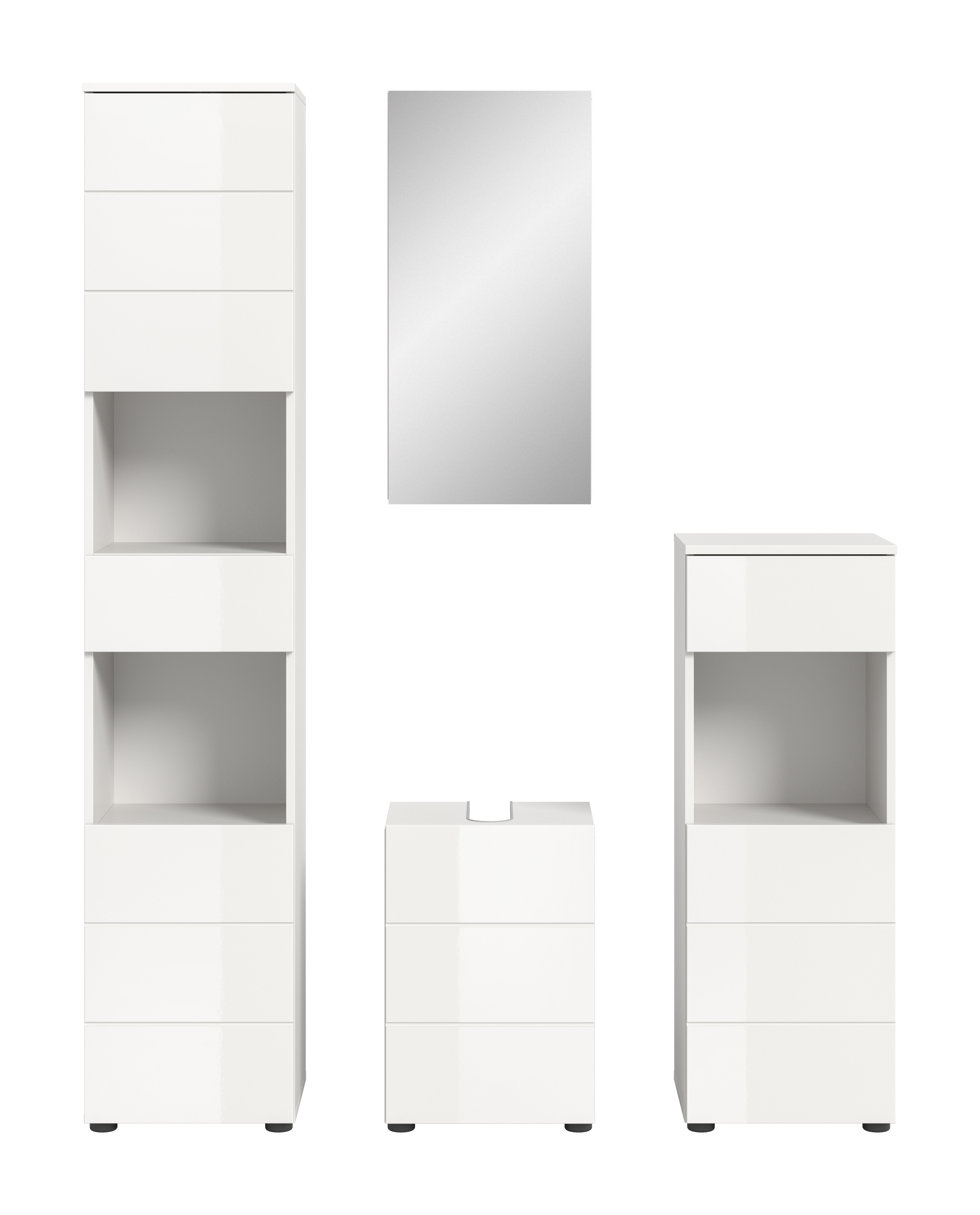 Unsere Badkombination (B/H/T: 144x190x34 cm) in weiß hochglänzender Tiefzieh-Optik vereint Stil und Funktionalität! Mit einem Hochschrank, einem Waschbeckenunterschrank, einem Spiegelschrank und einem schmalen Badschrank bietet dieses Set umfassenden Stauraum und eine moderne Ästhetik. Perfekt für jedes Badezimmer, sorgt diese Kombination für Ordnung und ein einladendes Ambiente. Erleben Sie die perfekte Balance aus Design und Praxistauglichkeit!