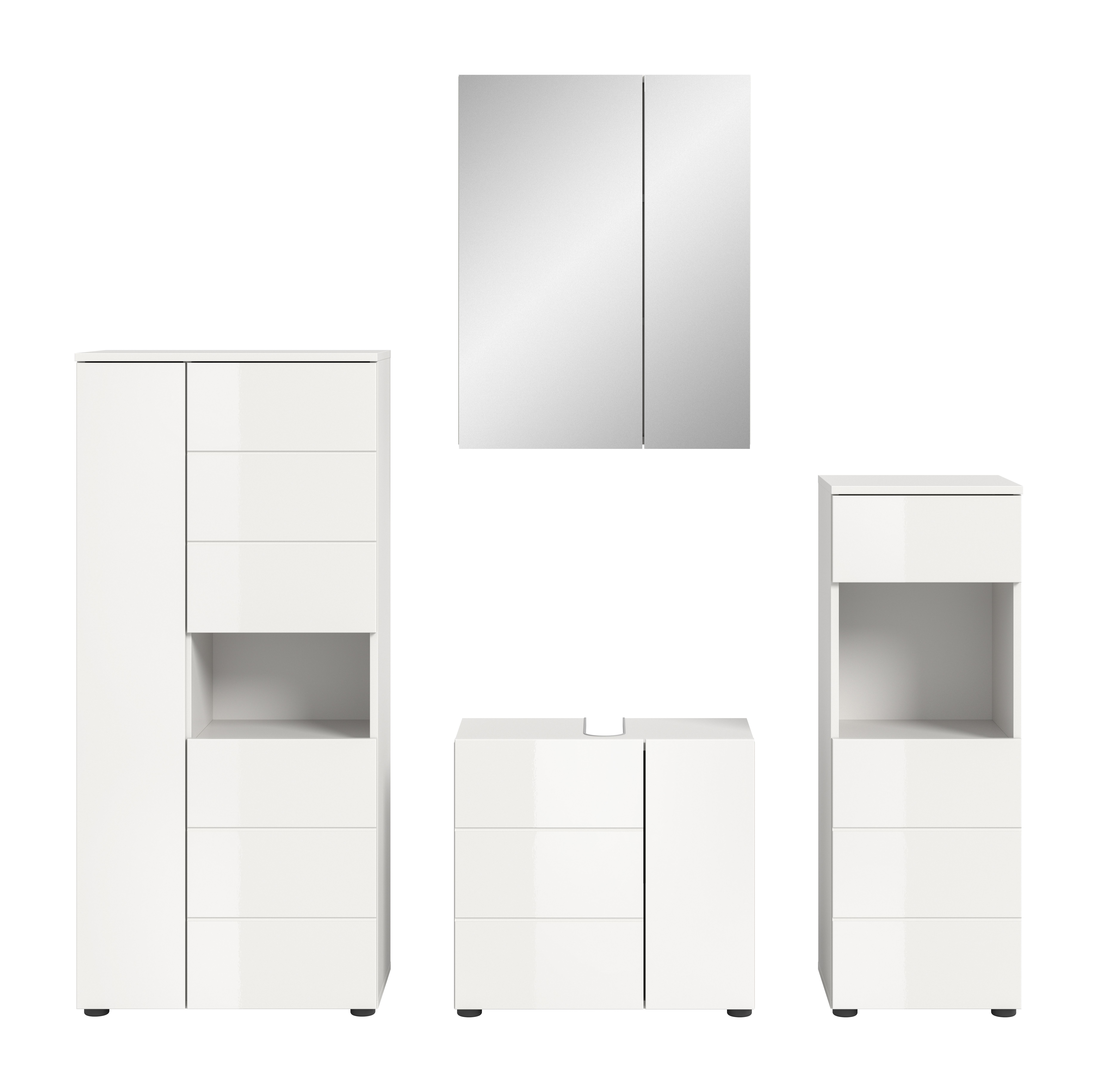 Die Badkombination (B/H/T: 188x190x34 cm) in elegantem weiß hochglänzenden Tiefzieh-Design bietet umfassenden Stauraum für Ihr Badezimmer. Dieses Set beinhaltet einen breiten Badschrank, einen Waschbeckenunterschrank, einen Spiegelschrank und einen schmalen Badschrank, um Ihren Raum ordentlich und organisiert zu halten. Die moderne Gestaltung schafft eine einladende Atmosphäre in Ihrem Bad. Verleihen Sie Ihrer Badeoase neuen Glanz mit dieser stilvollen Badkombination!