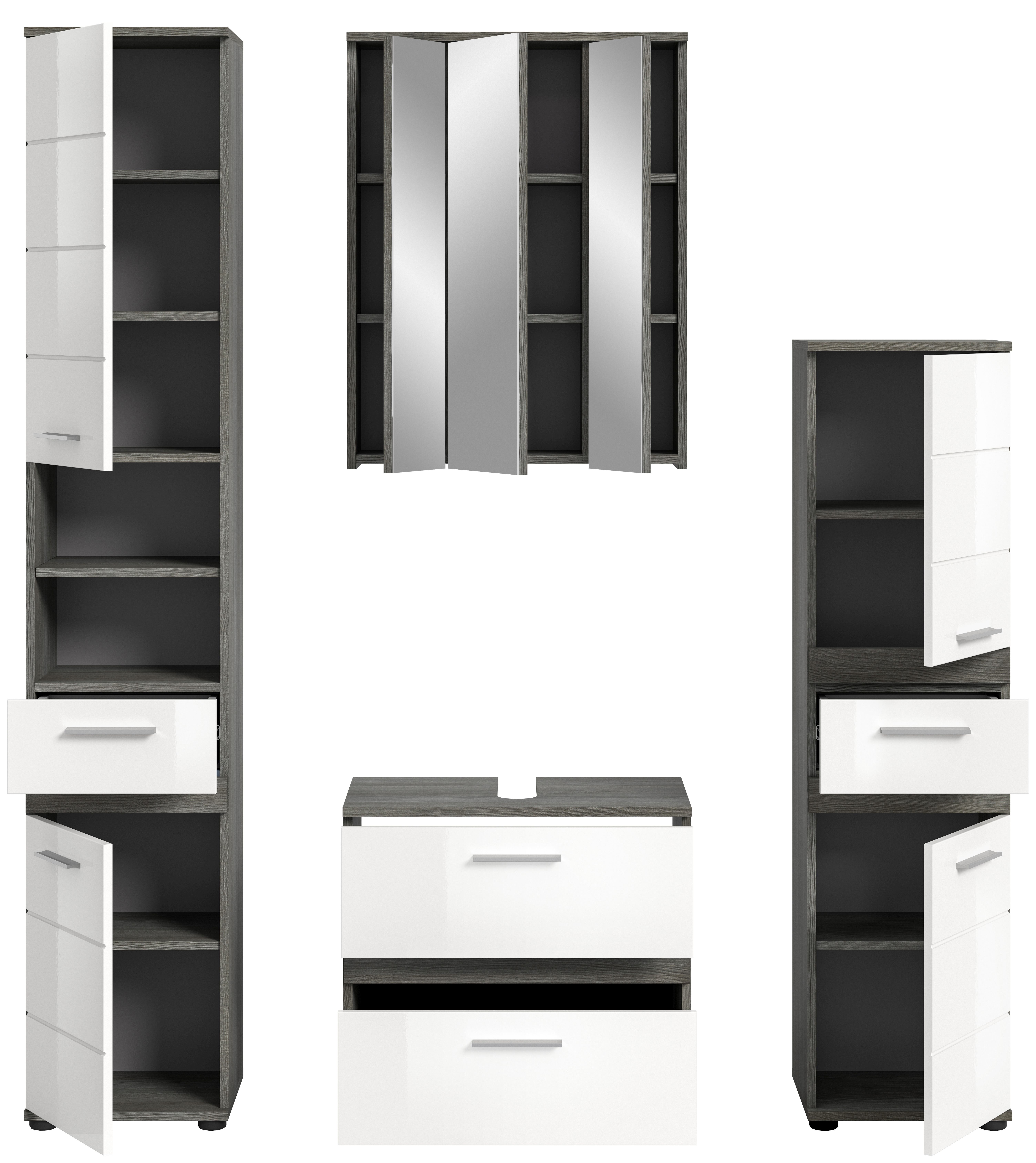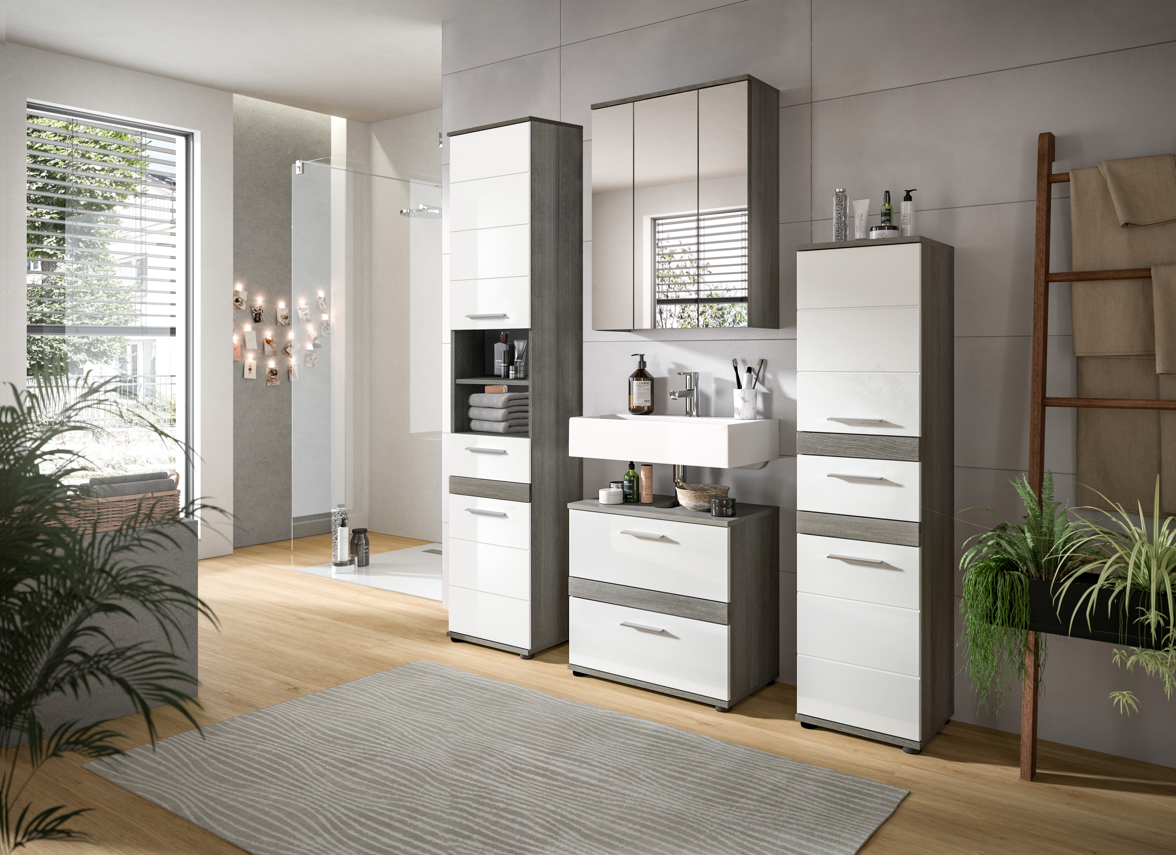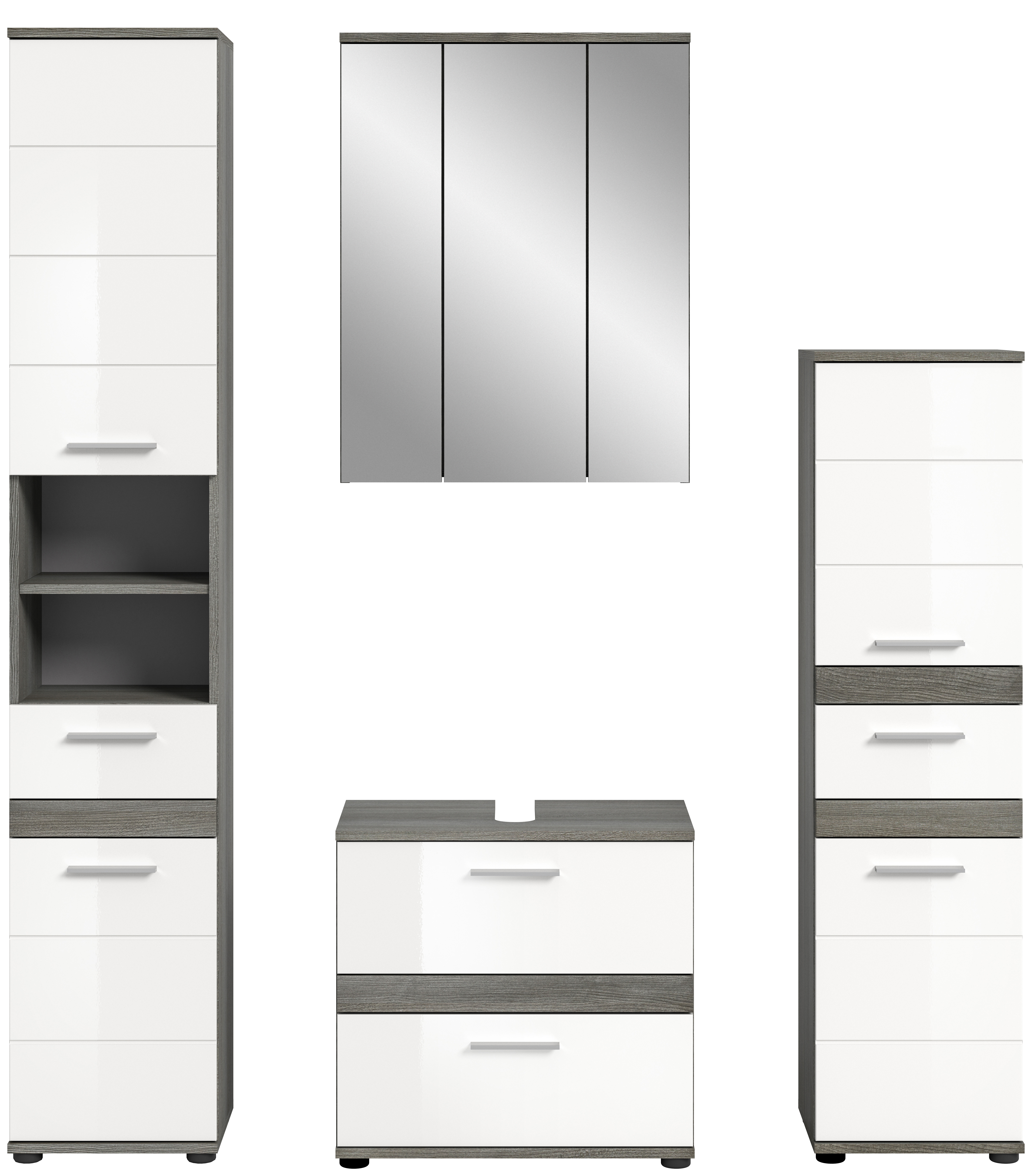 Unsere Badkombination vereint Stil und Funktionalität in einem eleganten Design. Die Rauchsilber-Nachbildung in Kombination mit dem strahlenden Weiß-Hochglanz verleiht Ihrem Badezimmer einen modernen und attraktiven Look. Entdecken Sie jetzt diese vielseitige Lösung für Ihr Bad und verwandeln Sie Ihren Raum in eine stilvolle Wohlfühloase.