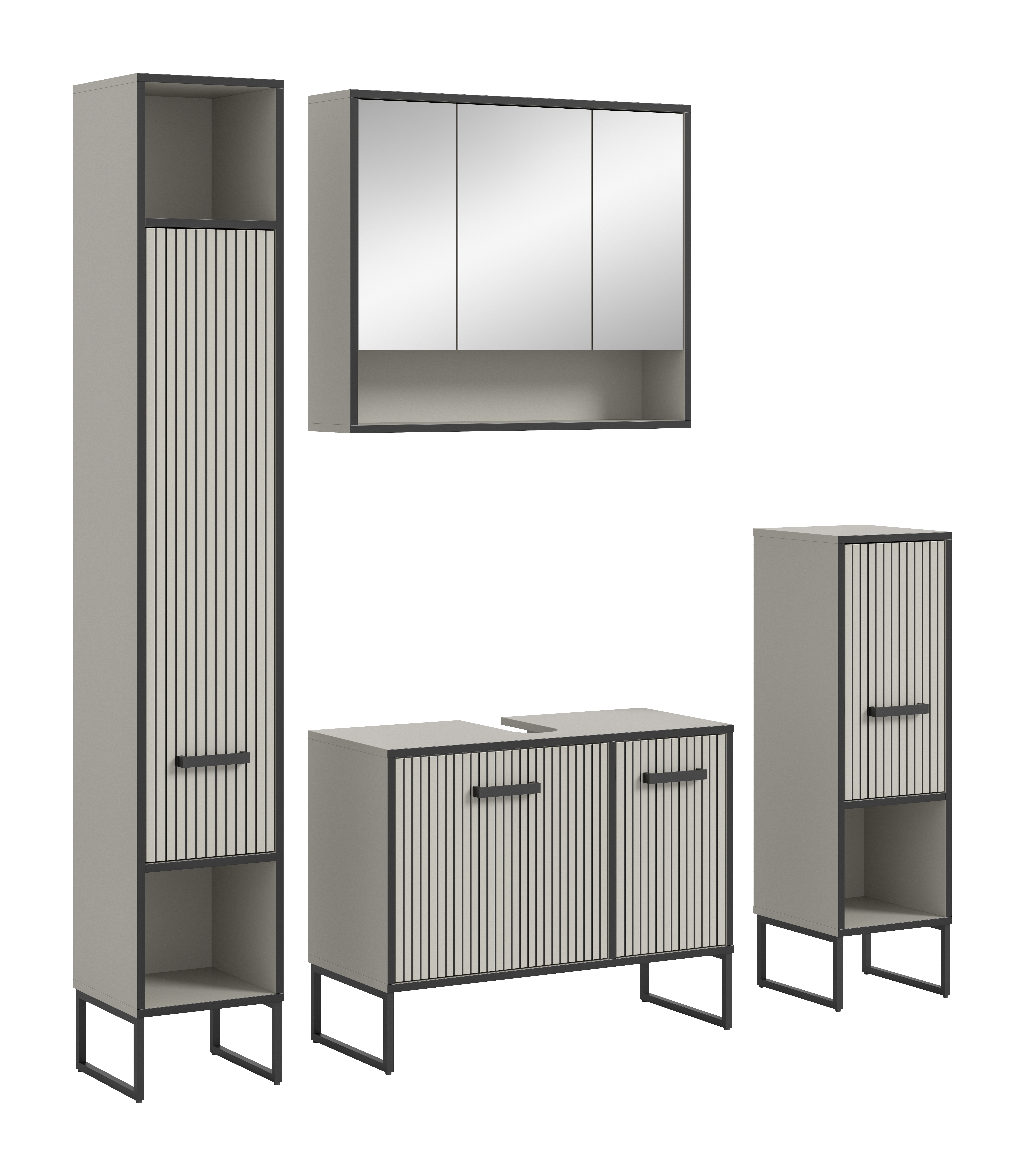 Verleihen Sie Ihrem Badezimmer mit der 4-teiligen Badkombination (B/H/T: 170x192x36 cm) in Kaschmir Holznachbildung eine luxuriöse Note. Dieses umfassende Set beinhaltet einen Hochschrank, Waschbeckenunterschrank, Spiegelschrank und einen Standschrank, die zusammen ein maximales Stauraumangebot bieten. Die hochwertig verarbeitete, pflegeleichte Oberfläche und die trendige Rillenoptik schaffen ein elegantes und einladendes Ambiente. Ideal für großzügigere Badezimmer!
