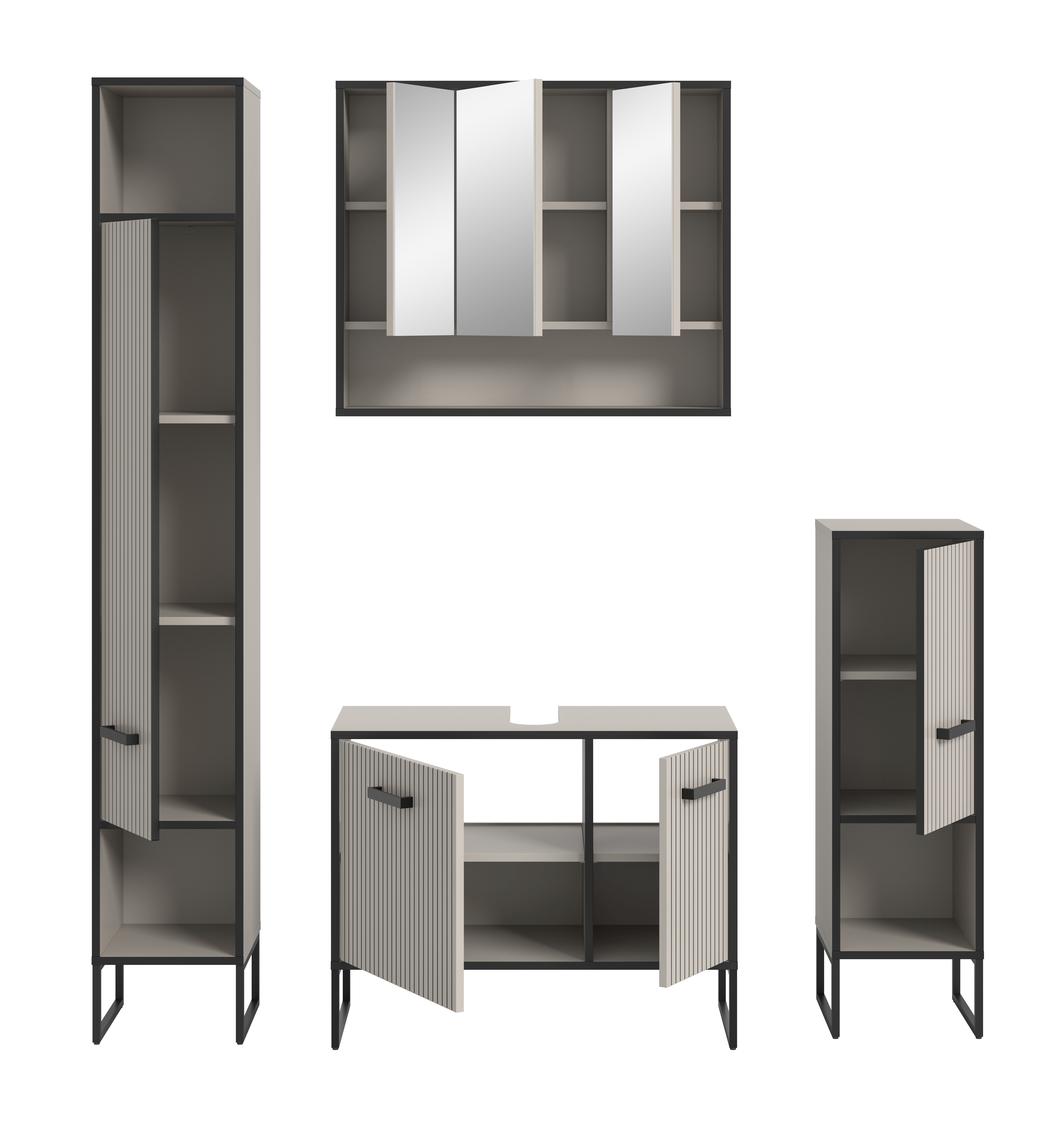 - 4-teilige Badkombination, bestehend aus: 1x Hochschrank, Waschbeckenunterschrank, 1x Spiegelschrank, 1x Standschrank