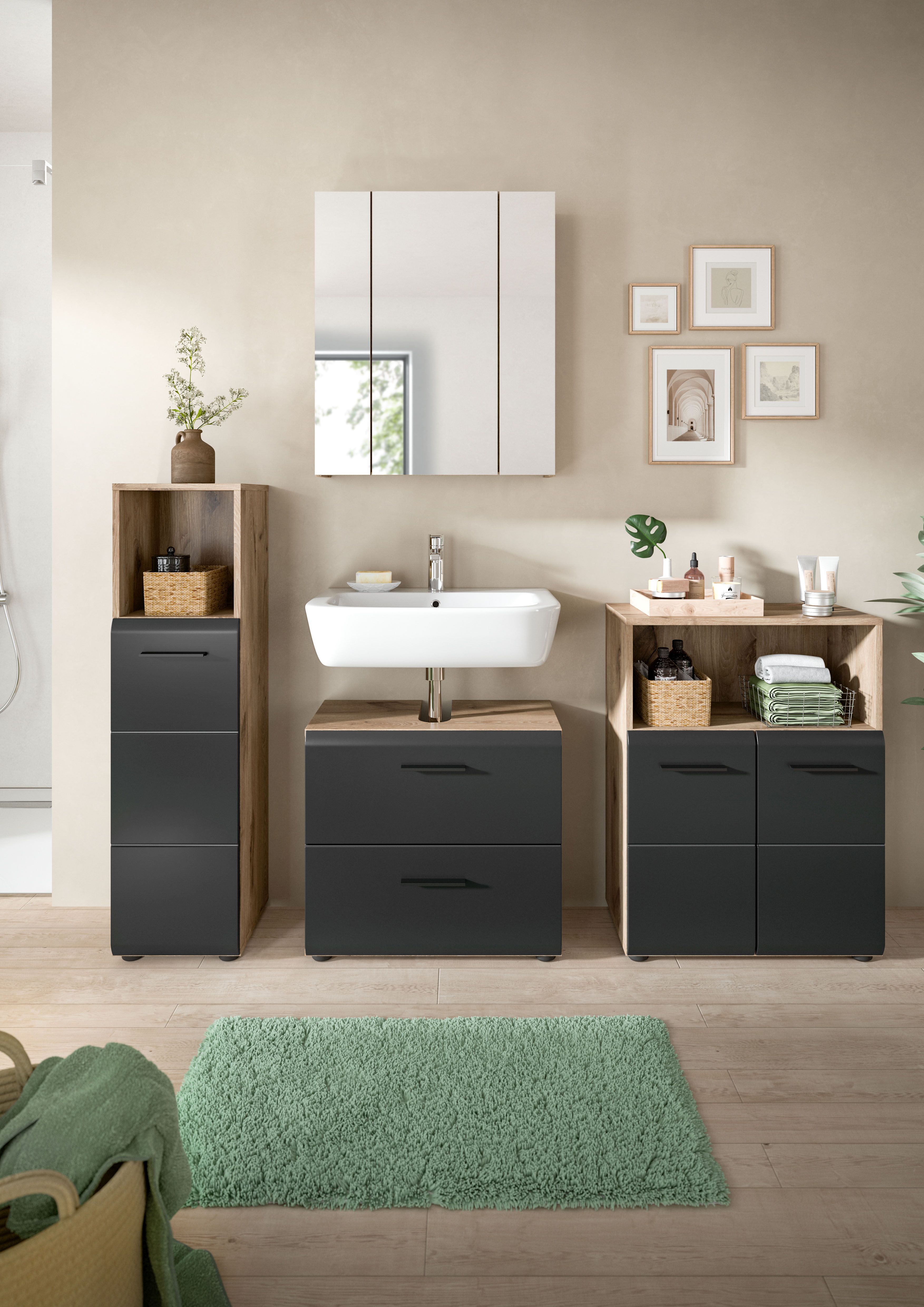 Entdecken Sie unsere elegante Badezimmer Badkombination in Schwarz matt und Nox Eiche Holznachbildung. Diese durchdachte Kombination aus verschiedenen Badmöbeln in bietet nicht nur Stauraum für Ihre Badutensilien, sondern verleiht Ihrem Badezimmer auch einen modernen und aufgeräumten Look.