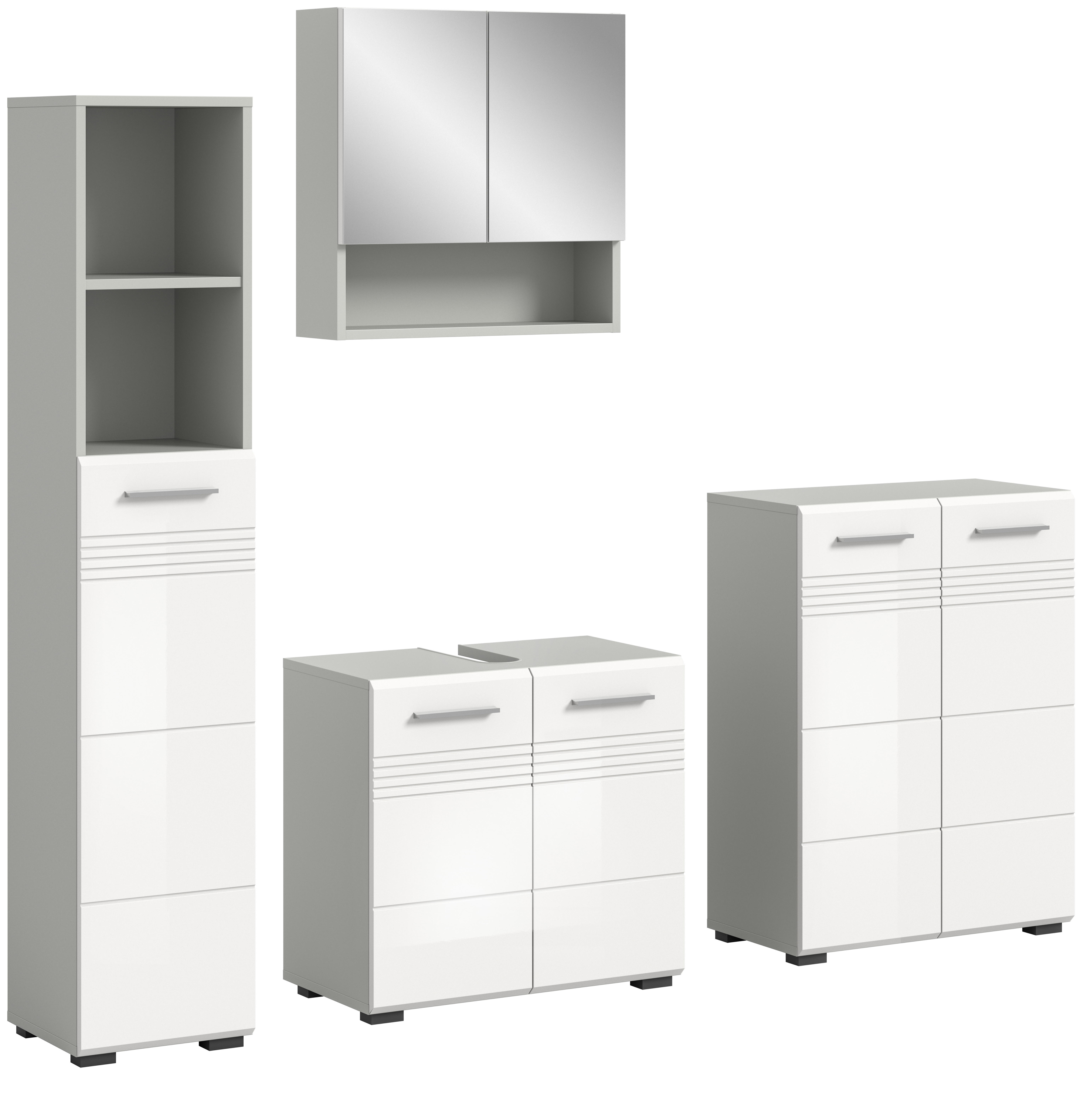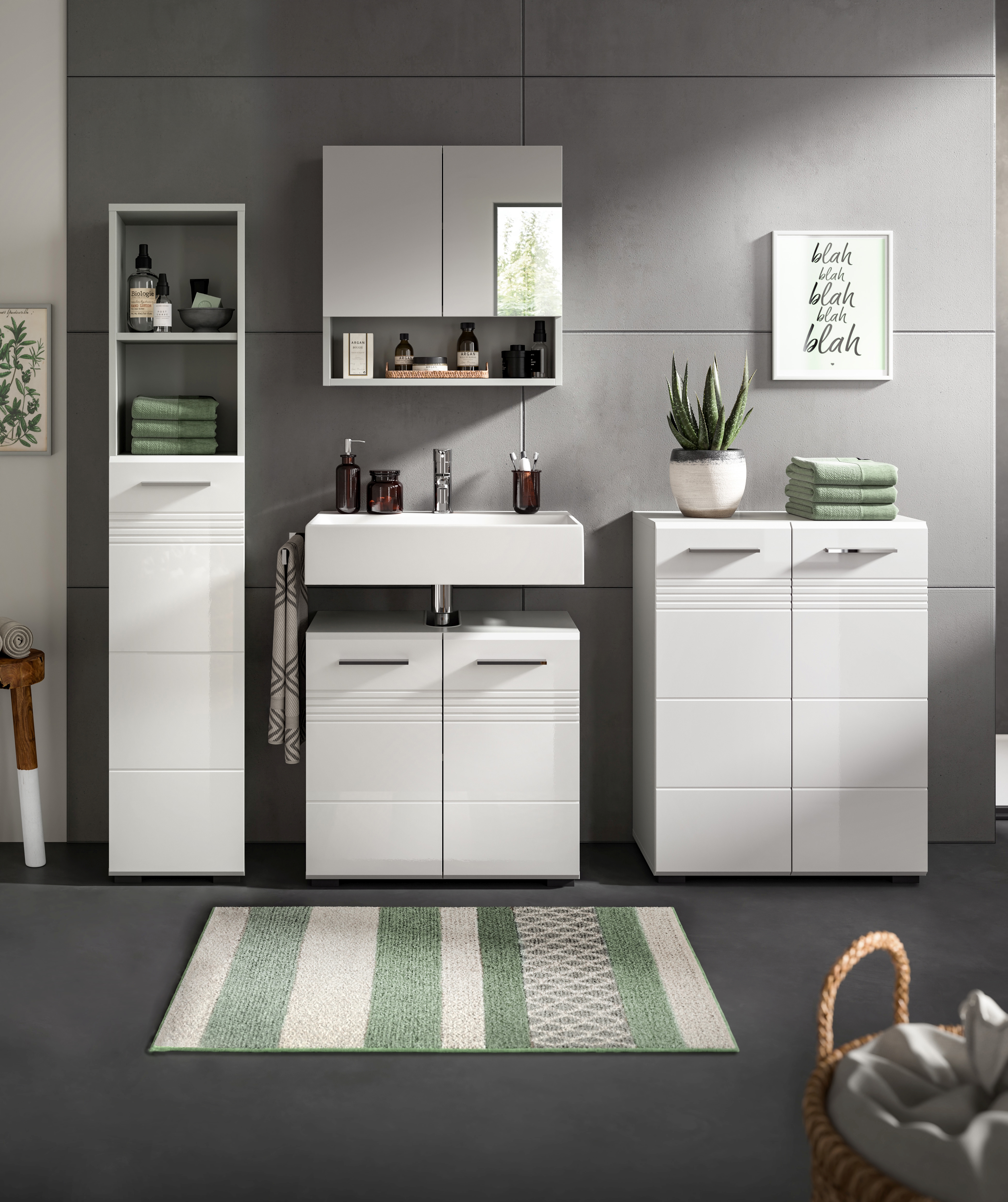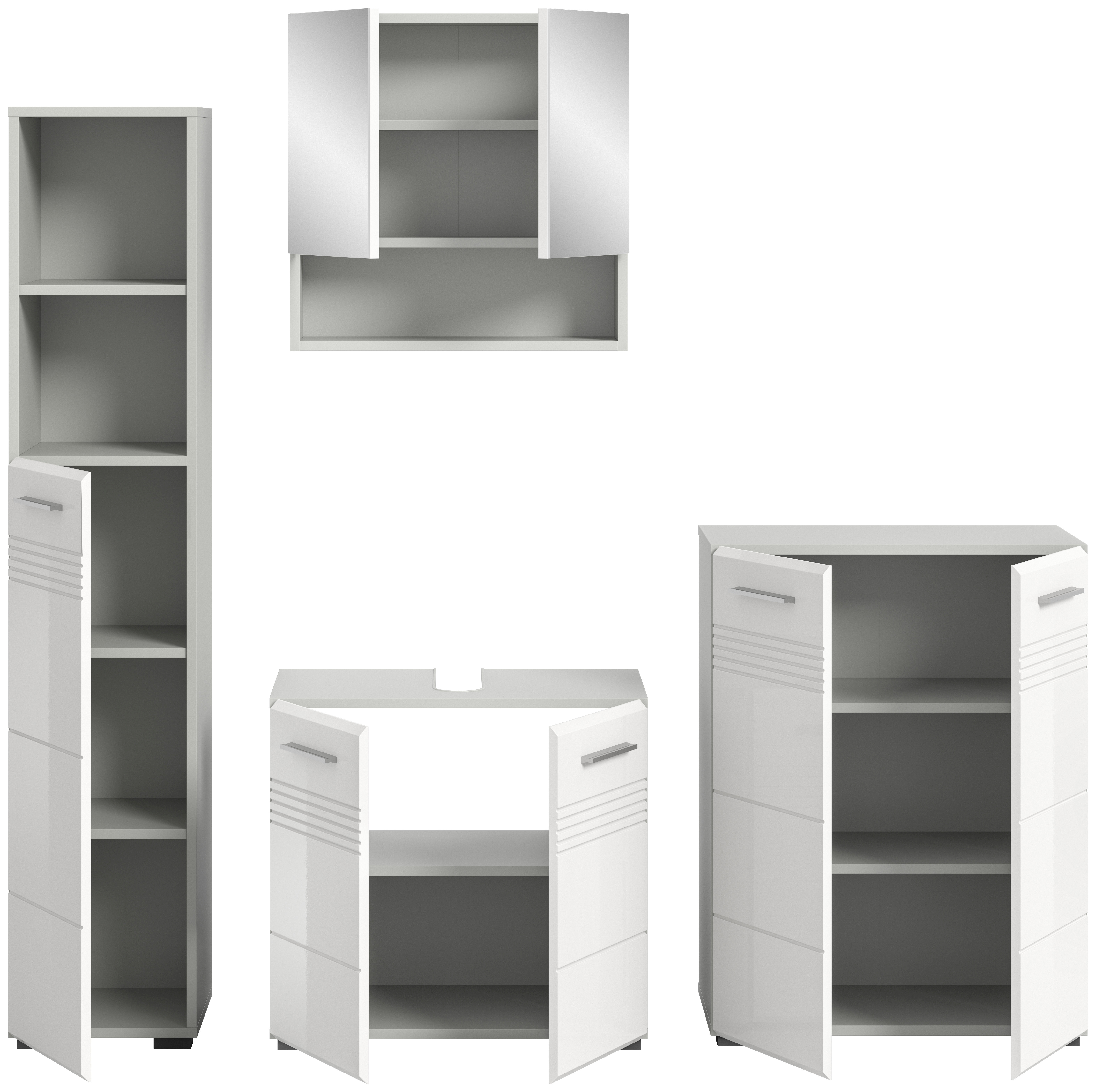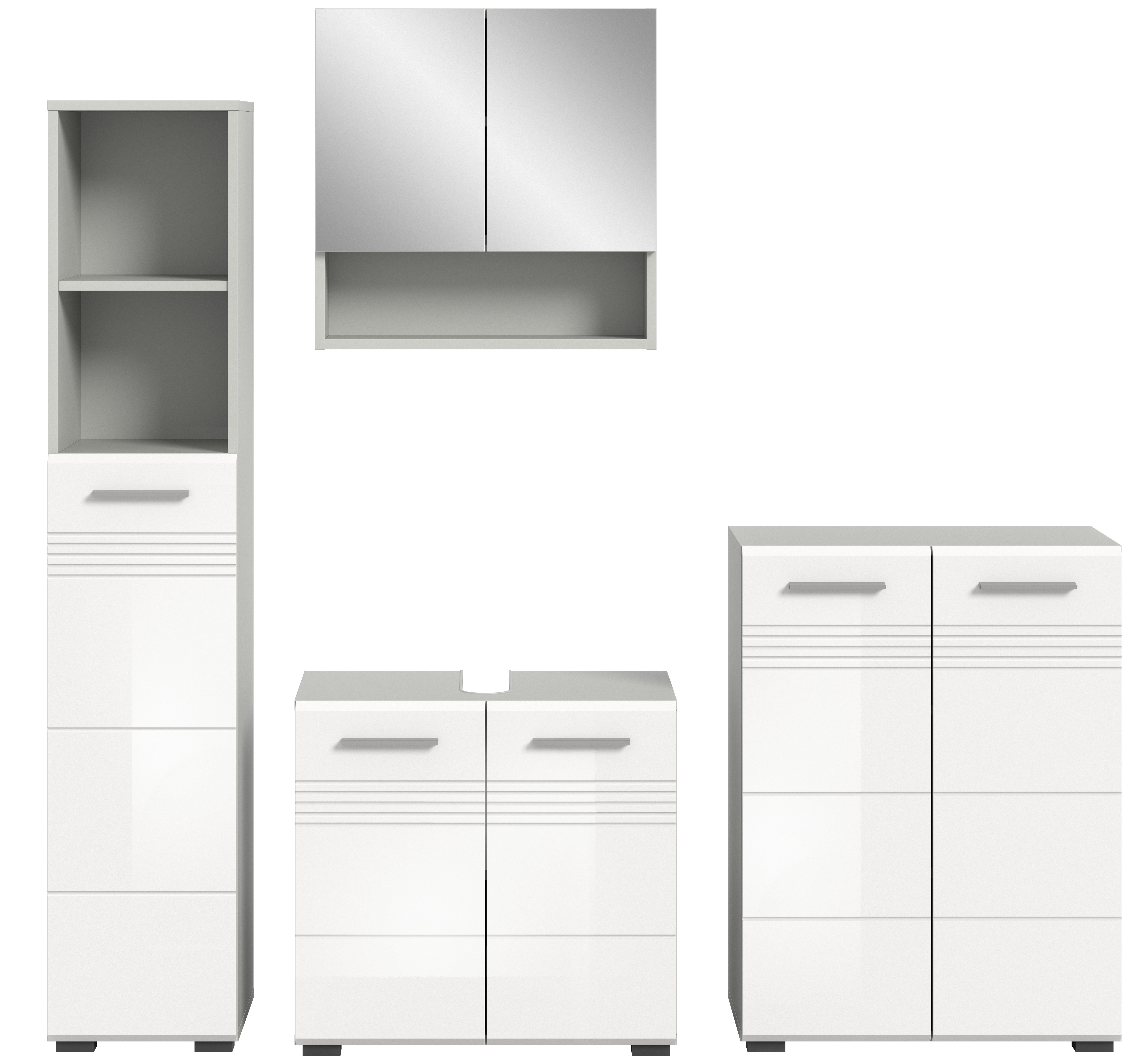 Entdecken Sie unsere moderne Badkombination in eleganter Hellgrau Nachbildung und strahlendem weißem Hochglanz, tiefgezogen für ein glänzendes Finish. Diese Kombination vereint Funktionalität und Stil und bietet mit ihrem zeitgemäßen Design eine perfekte Lösung für Ihr Badezimmer. Mit hochwertiger Verarbeitung und praktischem Stauraum ist sie die ideale Wahl für eine stilvolle und organisierte Badezimmereinrichtung.