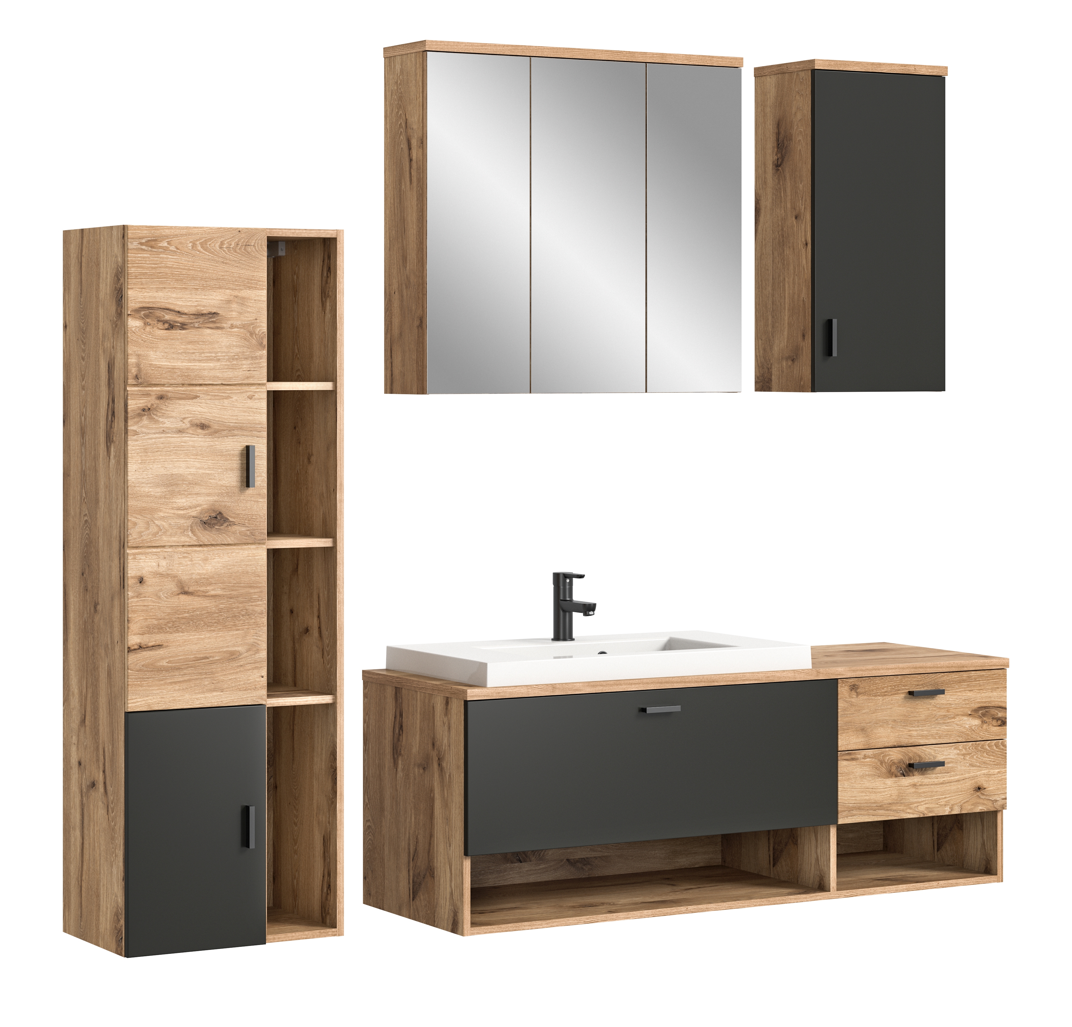 - Funktionalität: Die Badkombination bietet großzügigen Stauraum für die Aufbewahrung von Handtüchern, Kosmetika, Medikamenten und anderen Badutensilien, wodurch sie eine praktische Lösung zur Organisation des Badezimmers darstellt.