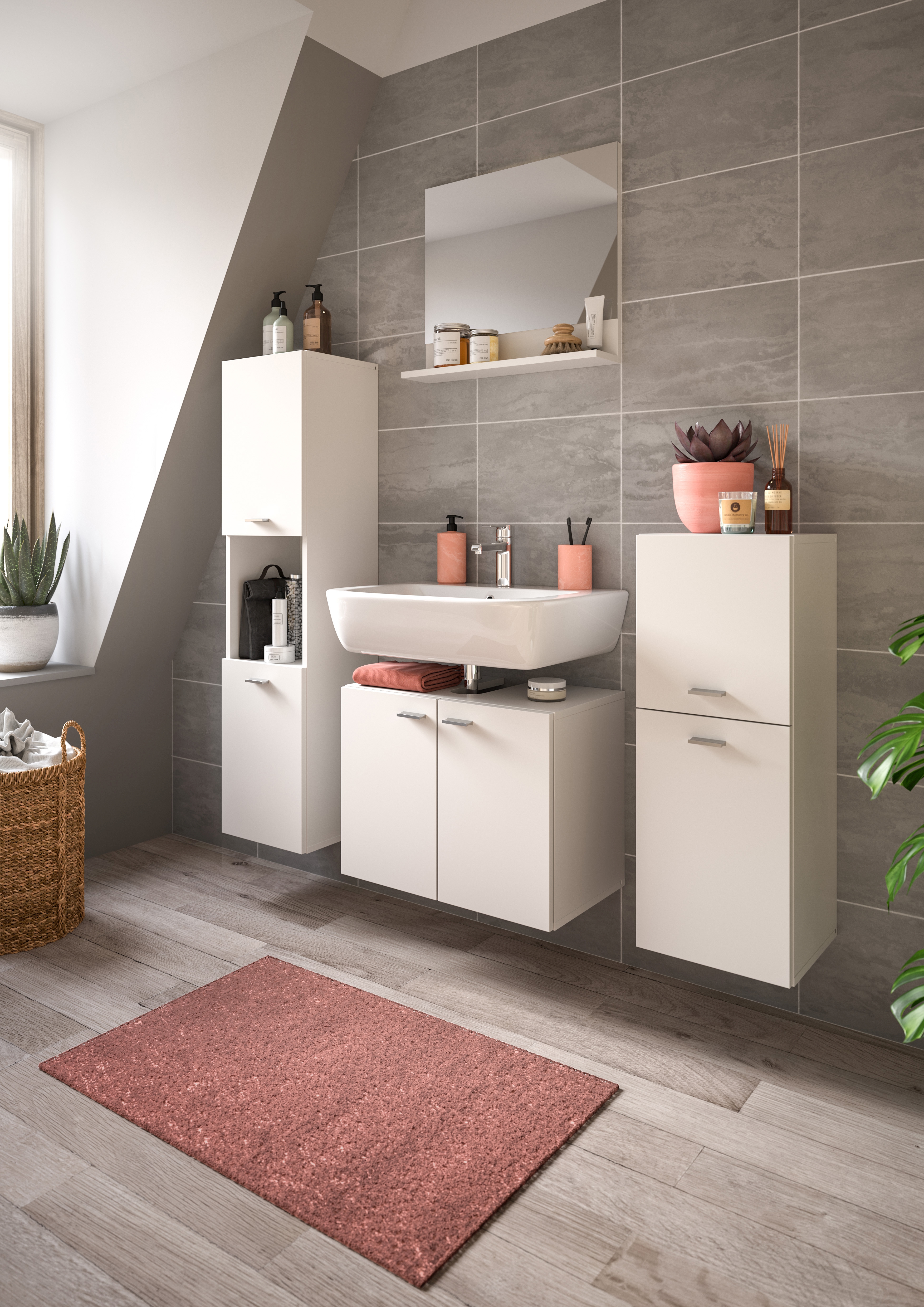 Der Unterschrank und der Midischrank, sowie die Badkommode können sowohl bodenstehend als auch hängend montiert werden.