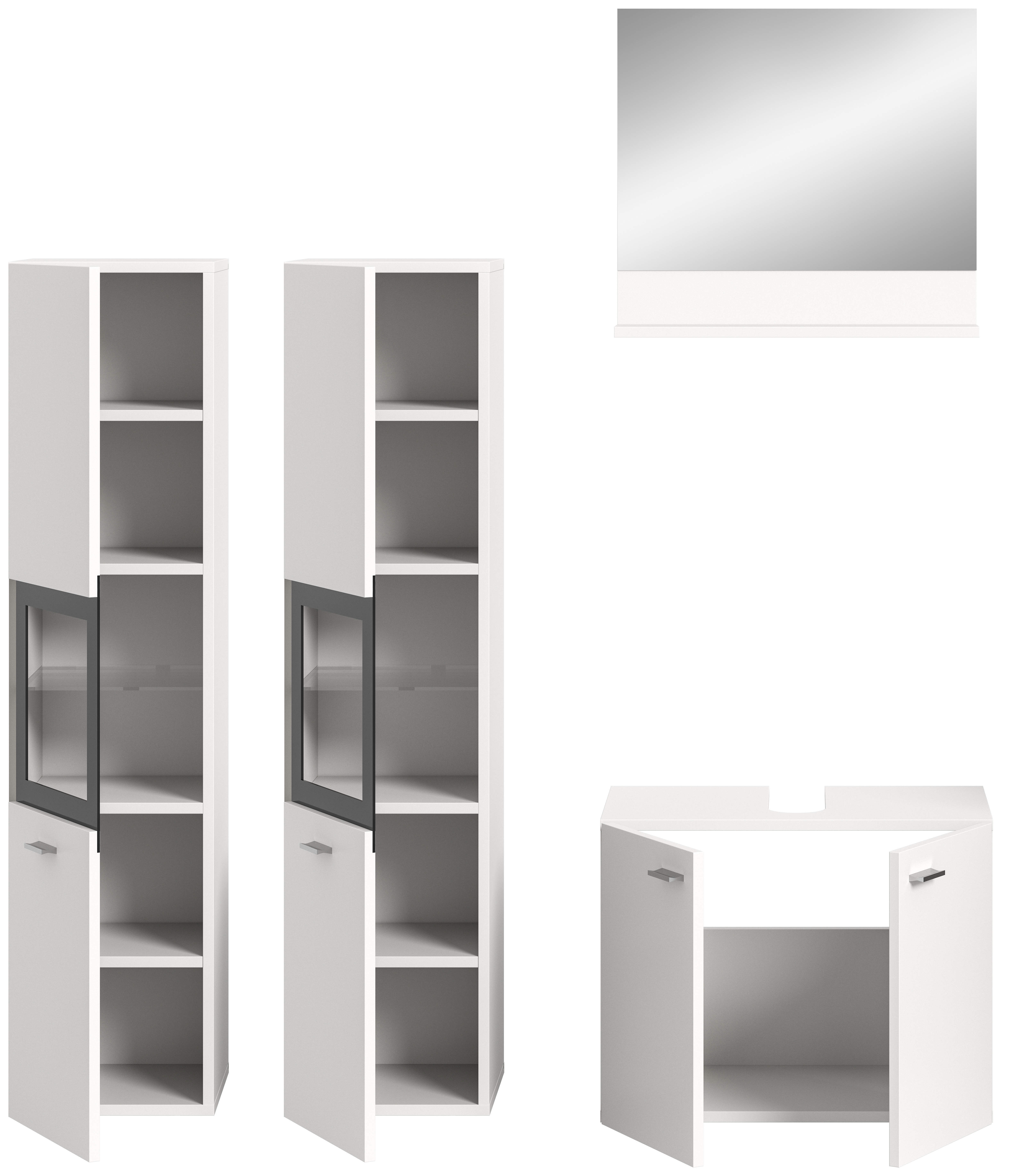 2 Midischränke mit jeweils 1 Tür mit Glaseinsatz, 2 Konstruktionsböden und 2 Einlegeböden