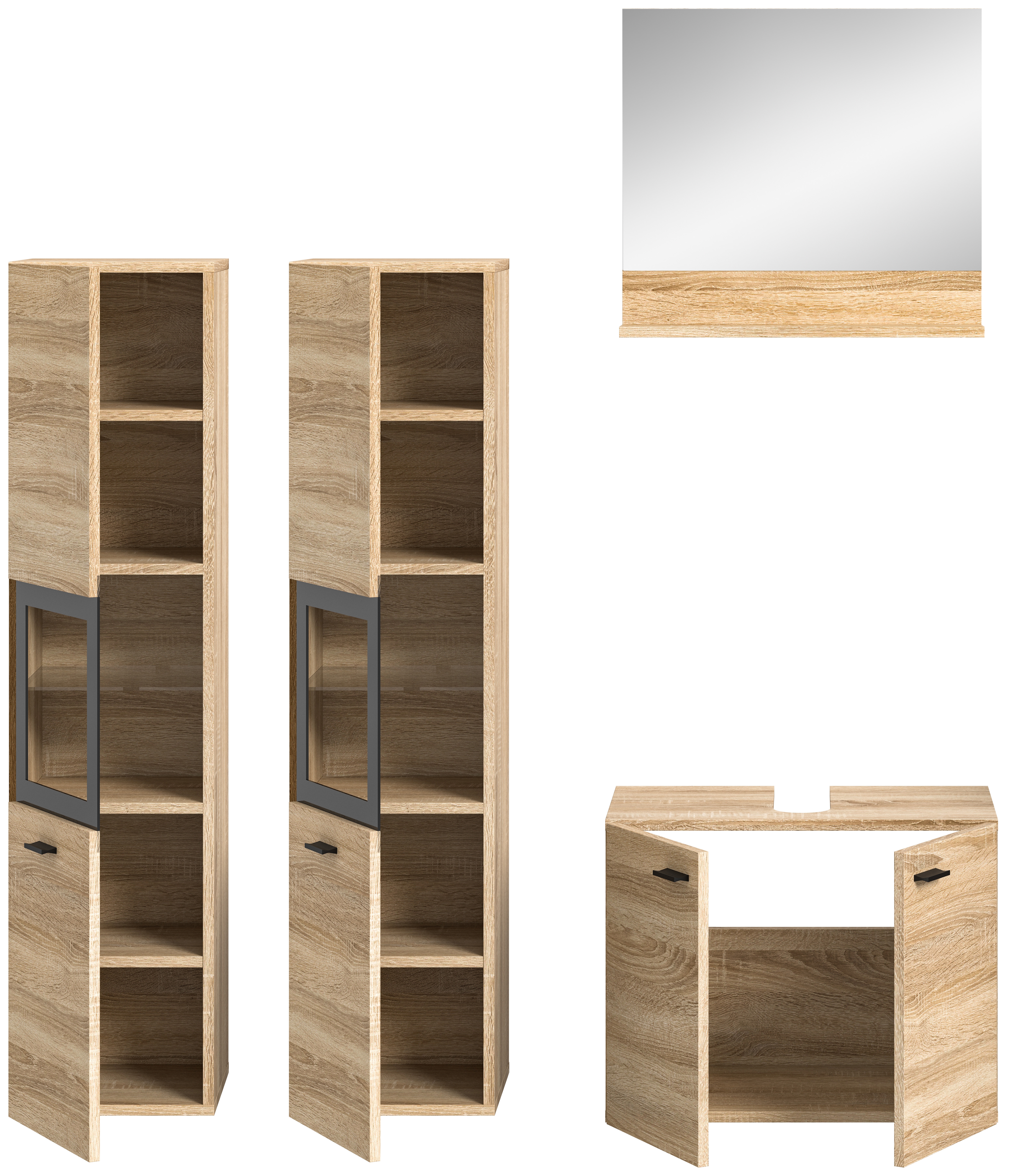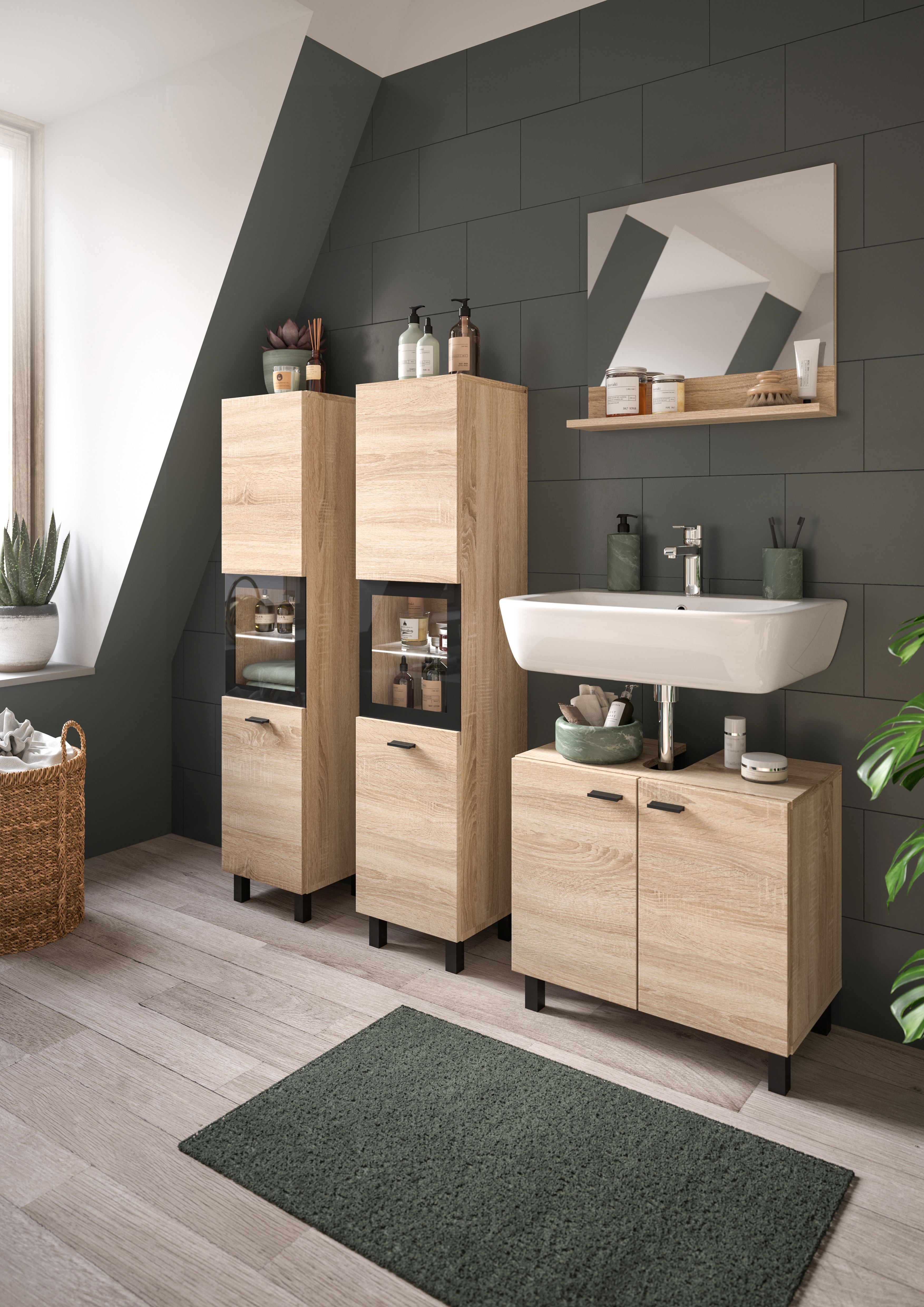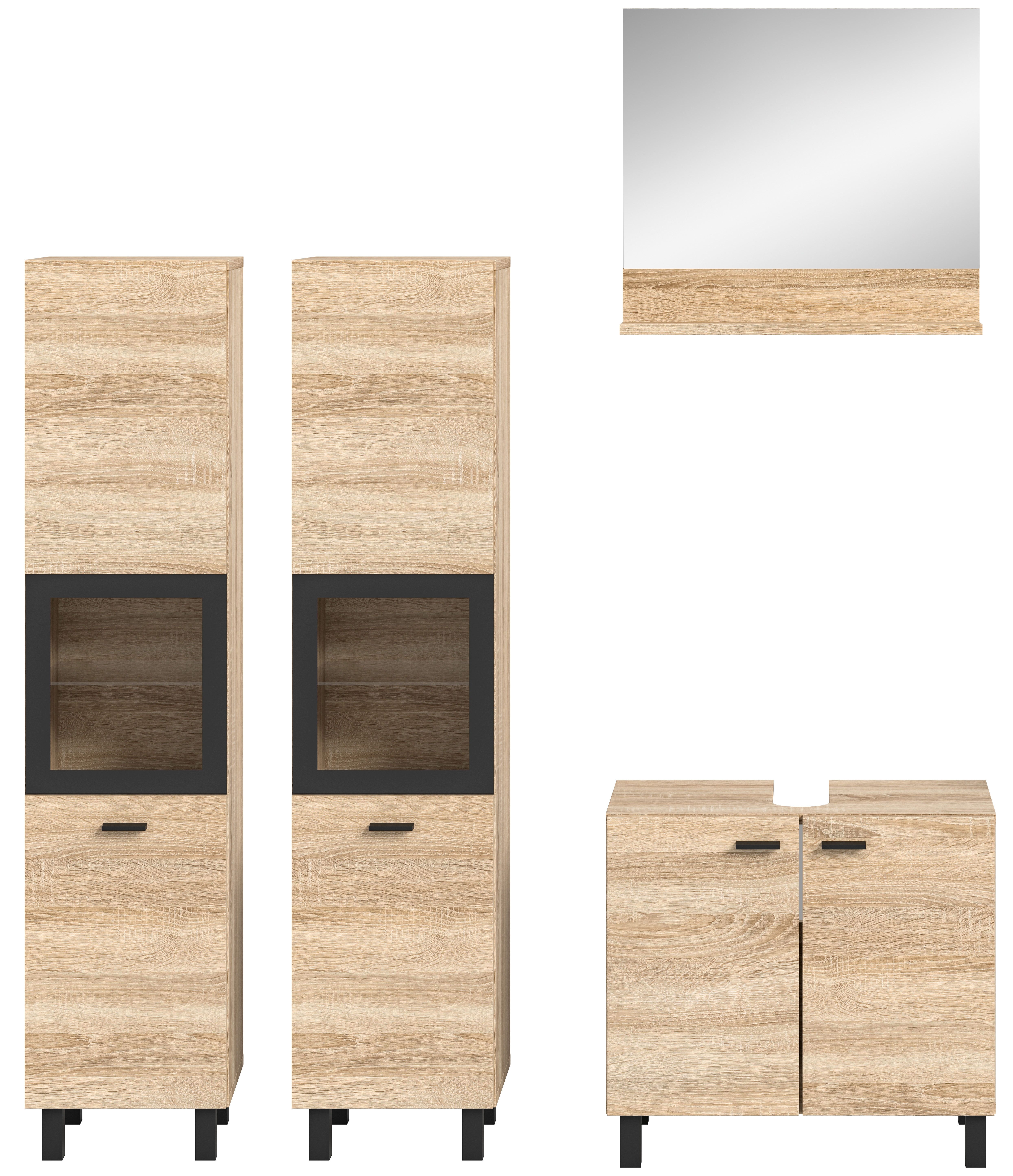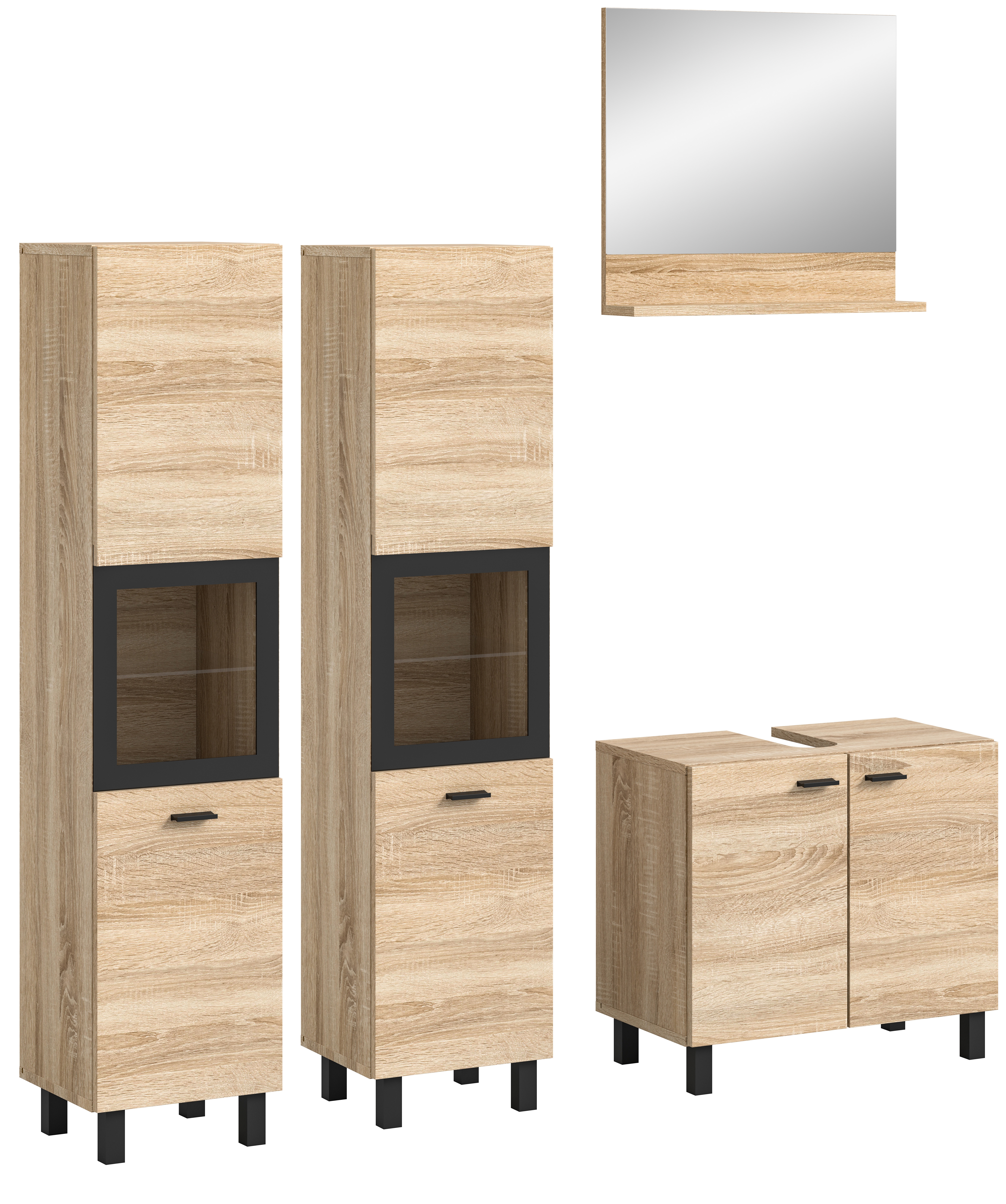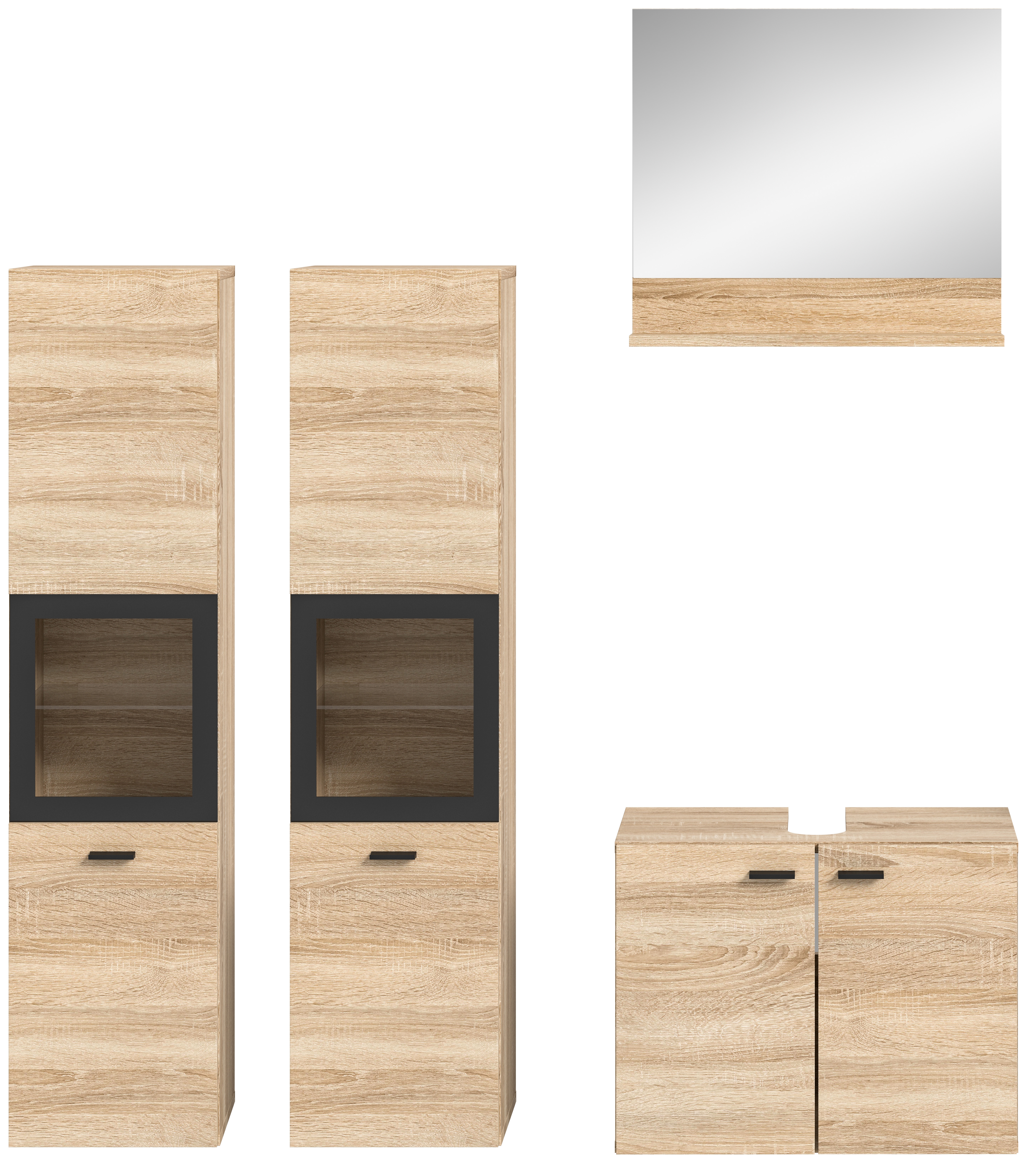 Unsere Badkombination in Eiche Sonoma Nachbildung bietet maximale Flexibilität, um Ihr Badezimmer nach Ihren individuellen Vorstellungen zu gestalten. Das zeitlose Design fügt sich harmonisch in jedes Badezimmer ein und verleiht ihm eine warme und natürliche Atmosphäre. Erforschen Sie jetzt diese vielseitige Lösung für Ihr Badezimmer.