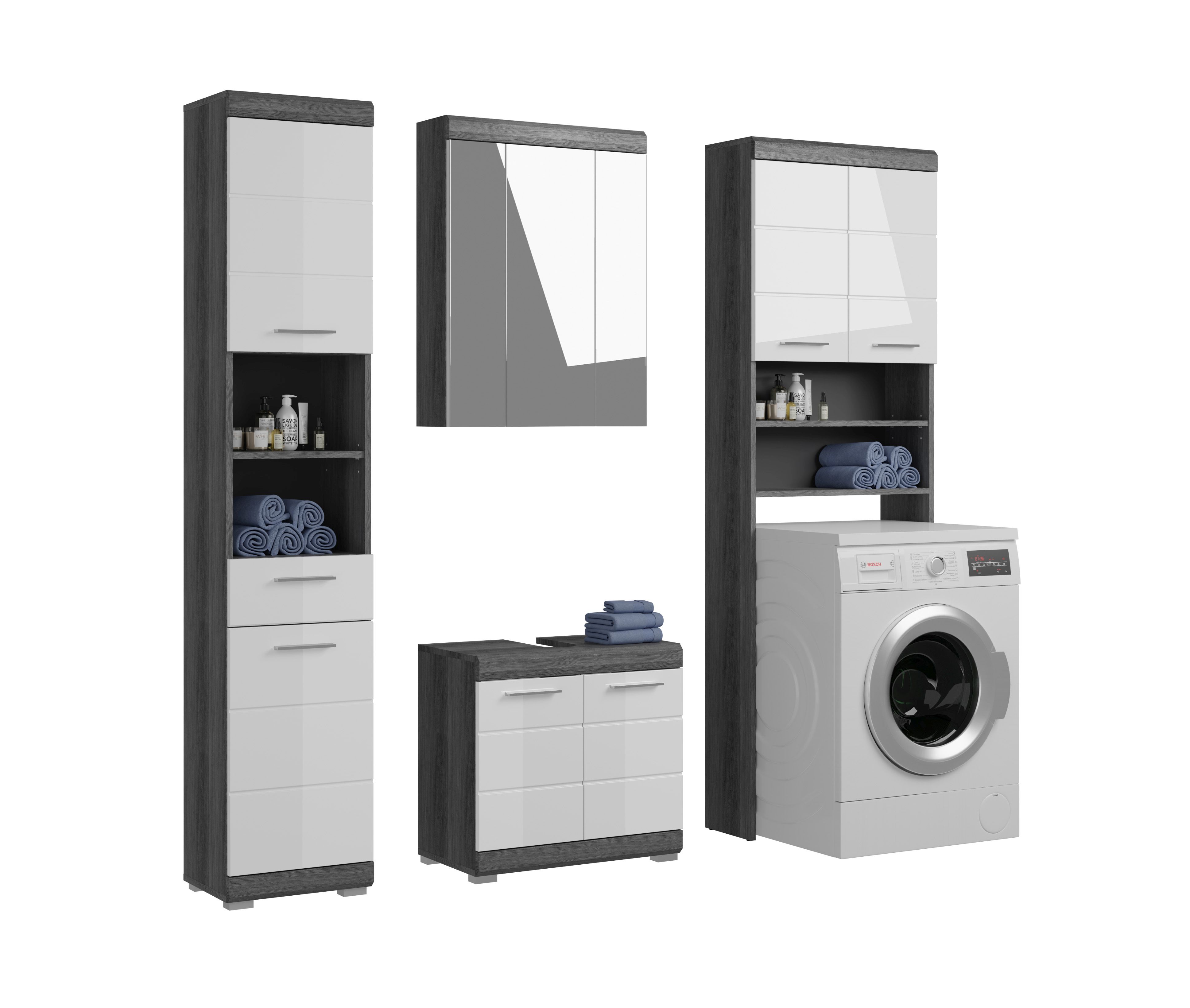 Verleihe deinem Badezimmer den ultimativen Style mit unserer Badkombination in angesagtem Rauchsilber Nachbildung und weißem Hochglanz tiefgezogenem Finish. Mit ihrem trendigen Design und der hochwertigen Verarbeitung setzt sie ein modernes Statement in deinem Zuhause. Entdecke jetzt die perfekte Verbindung von Coolness und Funktionalität für dein Badezimmer!