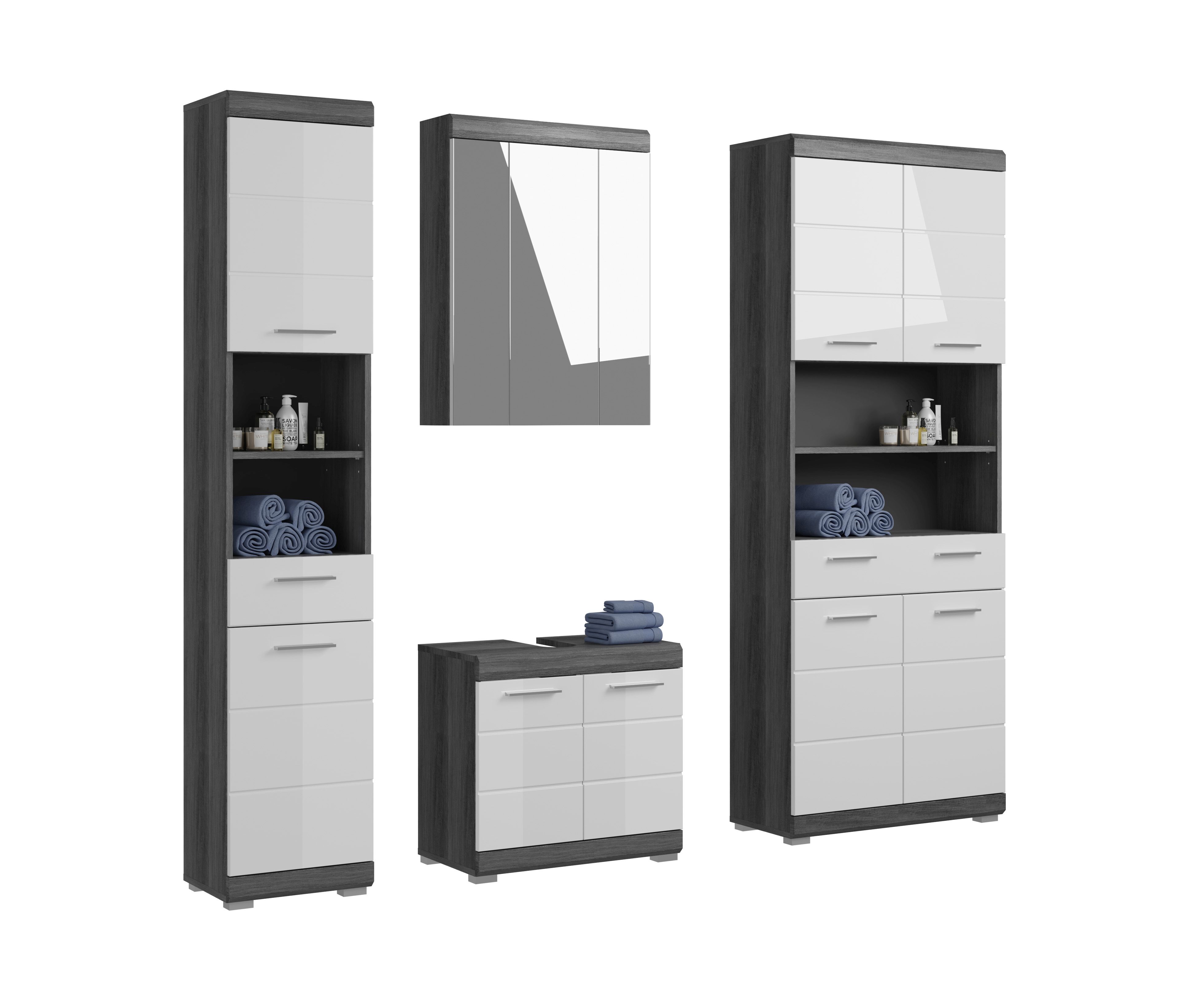 Verleihe deinem Badezimmer den ultimativen Style mit unserer Badkombination in angesagtem Rauchsilber Nachbildung und weißem Hochglanz tiefgezogenem Finish. Mit ihrem trendigen Design und der hochwertigen Verarbeitung setzt sie ein modernes Statement in deinem Zuhause. Entdecke jetzt die perfekte Verbindung von Coolness und Funktionalität für dein Badezimmer!