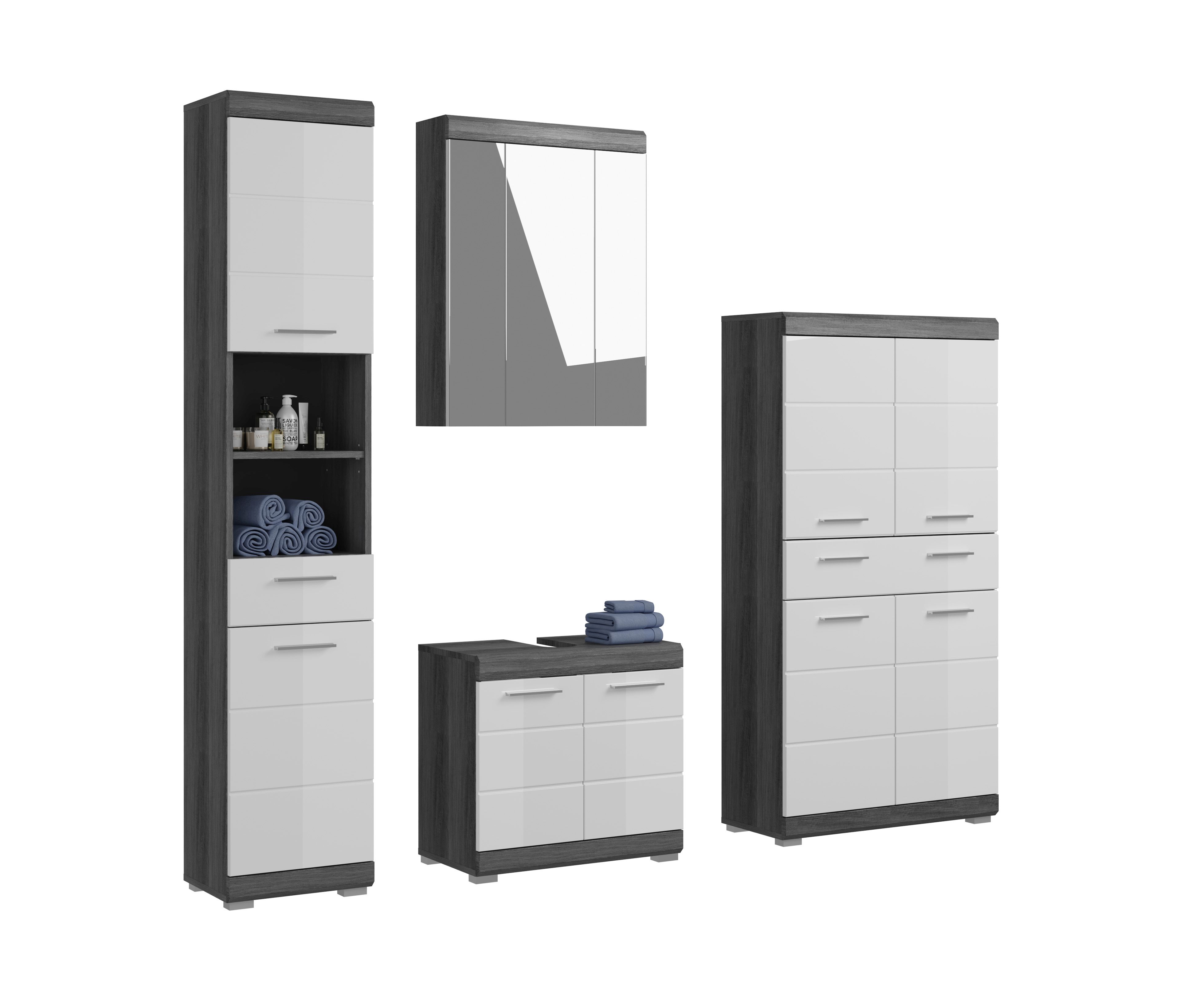 Verleihe deinem Badezimmer den ultimativen Style mit unserer Badkombination in angesagtem Rauchsilber Nachbildung und weißem Hochglanz tiefgezogenem Finish. Mit ihrem trendigen Design und der hochwertigen Verarbeitung setzt sie ein modernes Statement in deinem Zuhause. Entdecke jetzt die perfekte Verbindung von Coolness und Funktionalität für dein Badezimmer!