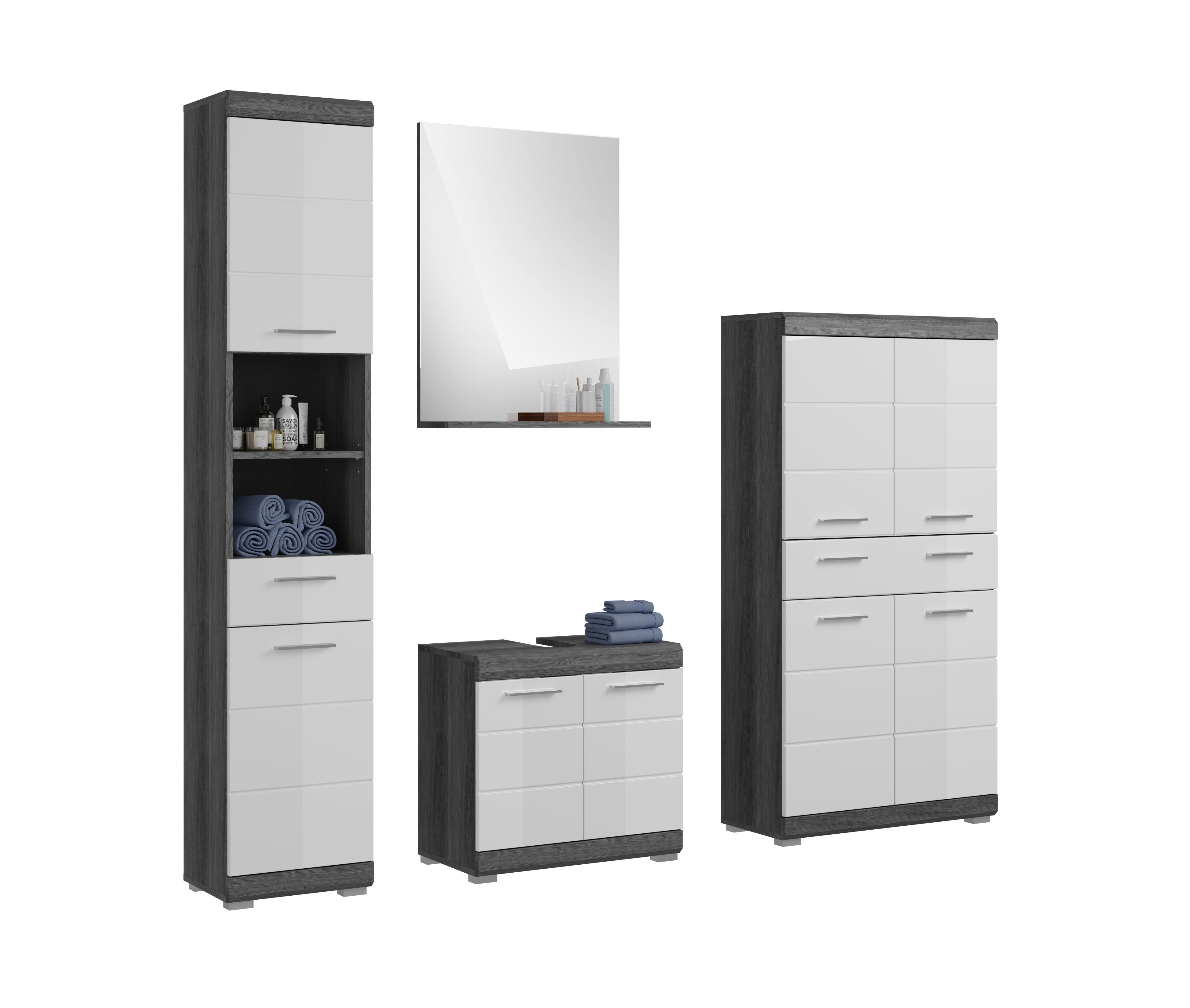 Verleihe deinem Badezimmer den ultimativen Style mit unserer Badkombination in angesagtem Rauchsilber Nachbildung und weißem Hochglanz tiefgezogenem Finish. Mit ihrem trendigen Design und der hochwertigen Verarbeitung setzt sie ein modernes Statement in deinem Zuhause. Entdecke jetzt die perfekte Verbindung von Coolness und Funktionalität für dein Badezimmer!