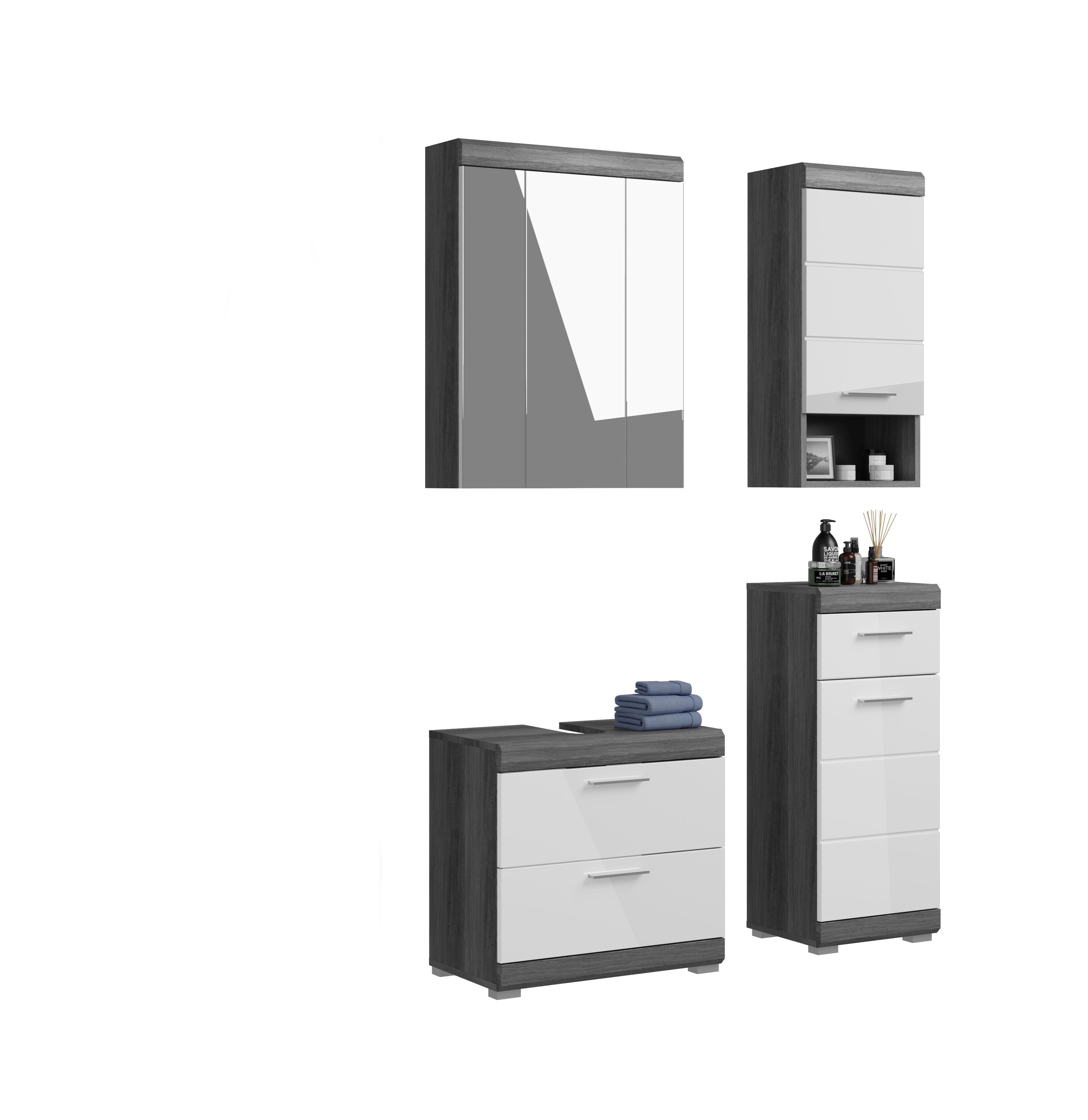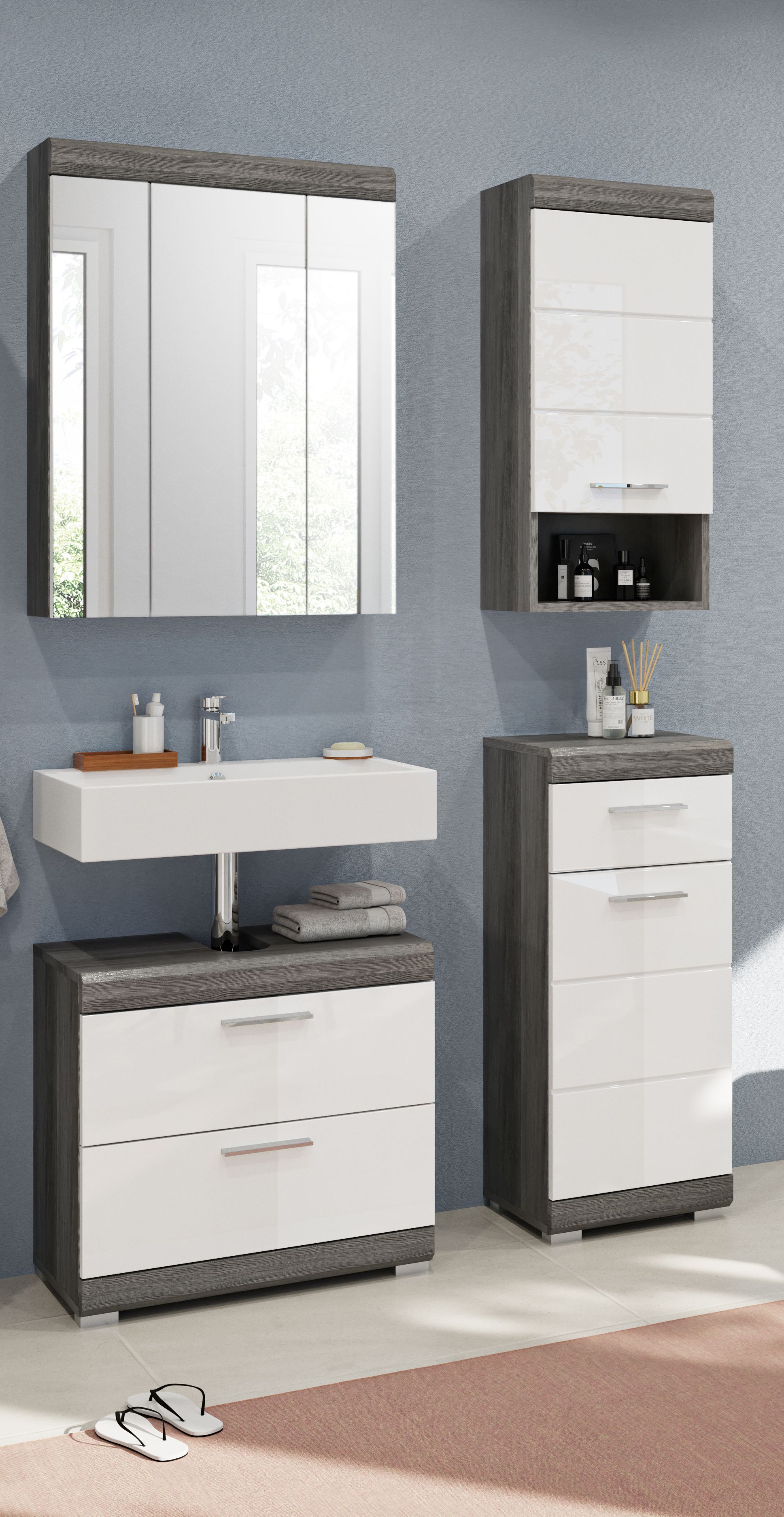 Verleihe deinem Badezimmer den ultimativen Style mit unserer Badkombination in angesagtem Rauchsilber Nachbildung und weißem Hochglanz tiefgezogenem Finish. Mit ihrem trendigen Design und der hochwertigen Verarbeitung setzt sie ein modernes Statement in deinem Zuhause. Entdecke jetzt die perfekte Verbindung von Coolness und Funktionalität für dein Badezimmer!