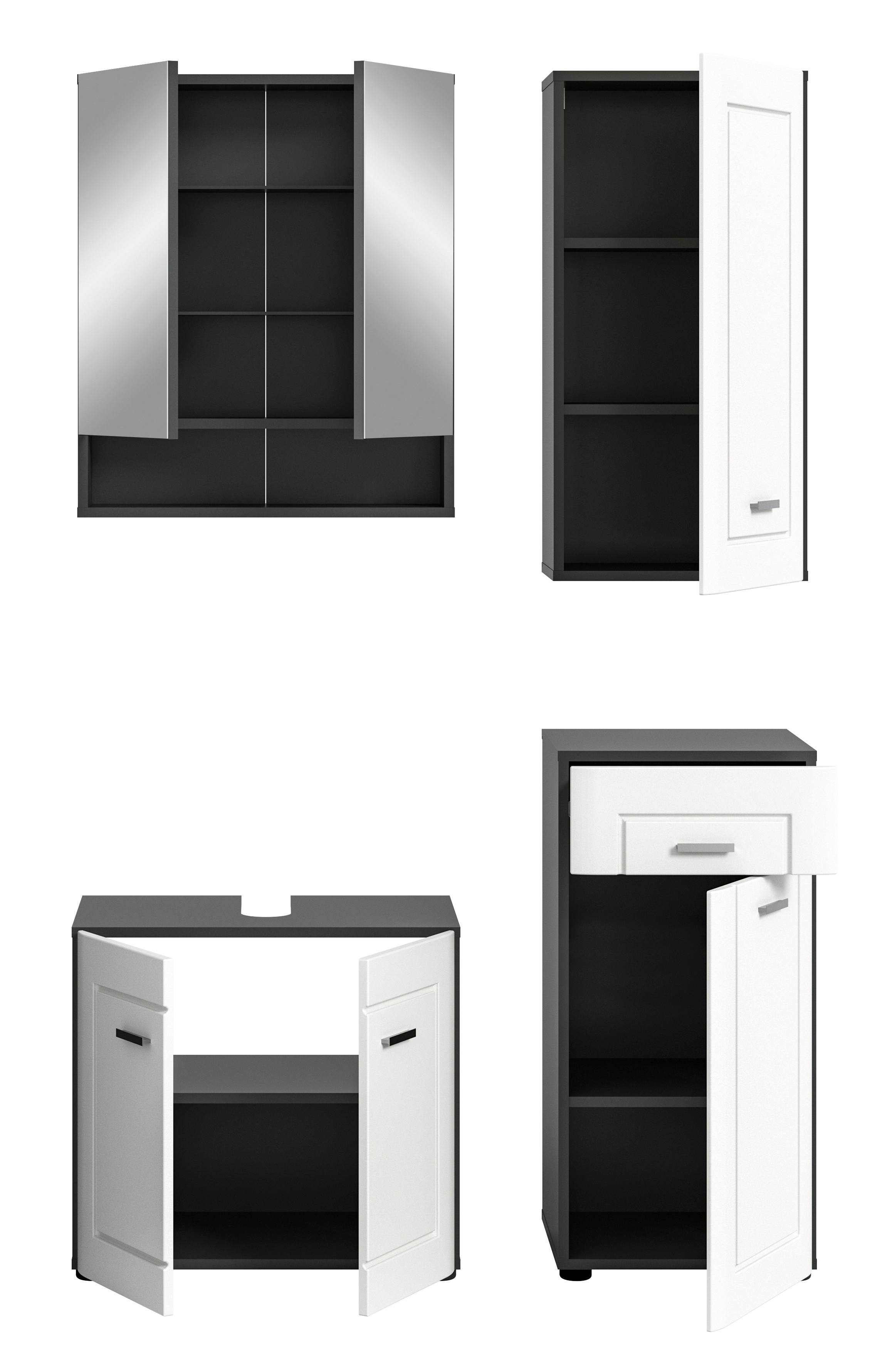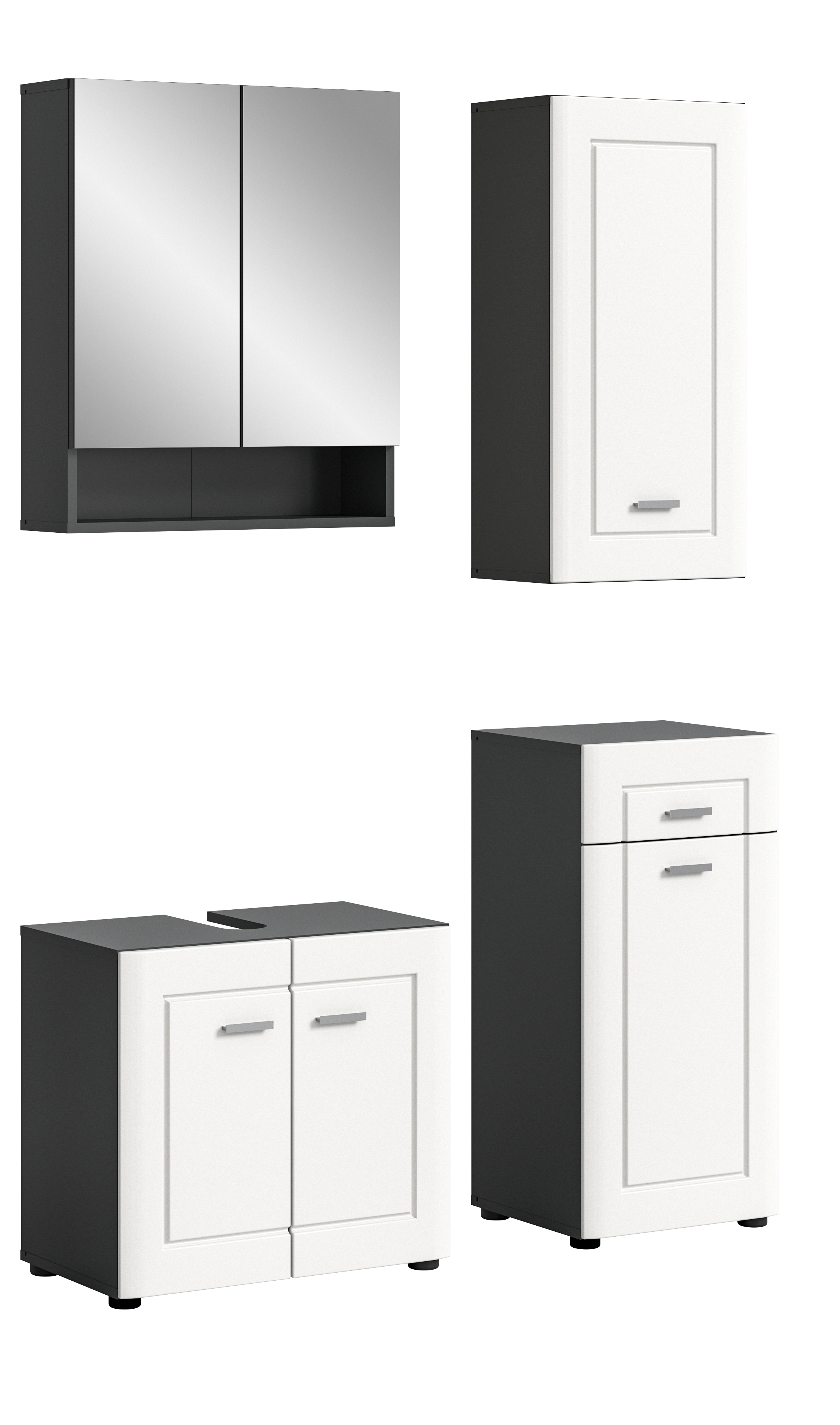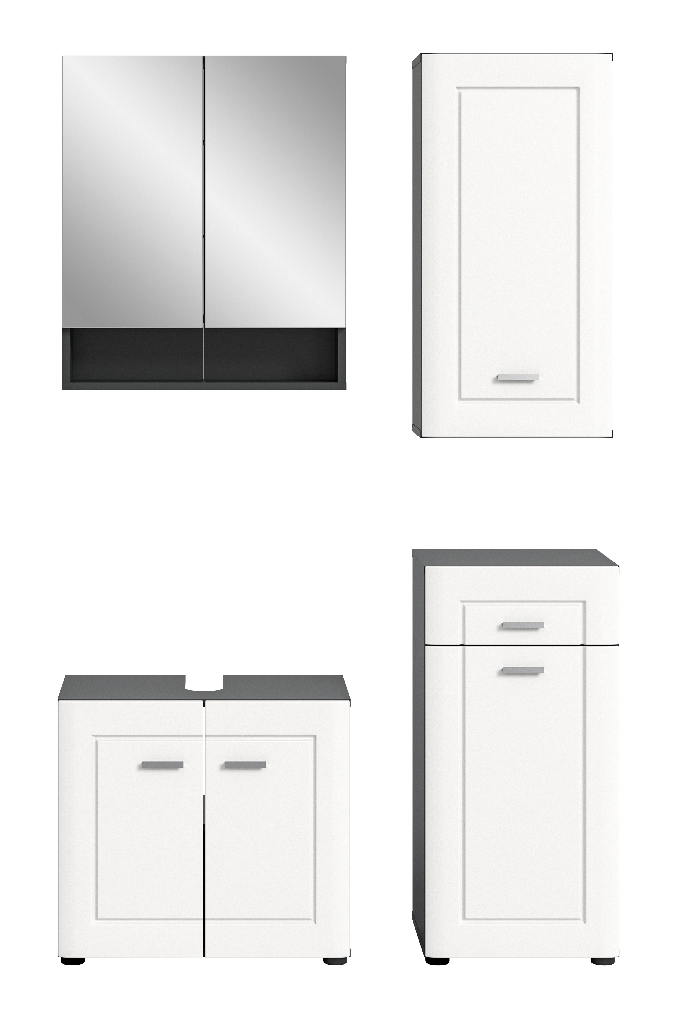 - Funktionalität: Umfassende Badkombination mit verschiedenen Elementen wie Waschbeckenunterschrank, Spiegelschrank, Badkommode und Hängeschrank für eine optimale Nutzung des vorhandenen Raums und eine effiziente Aufbewahrung von Badutensilien und Reinigungsprodukten.