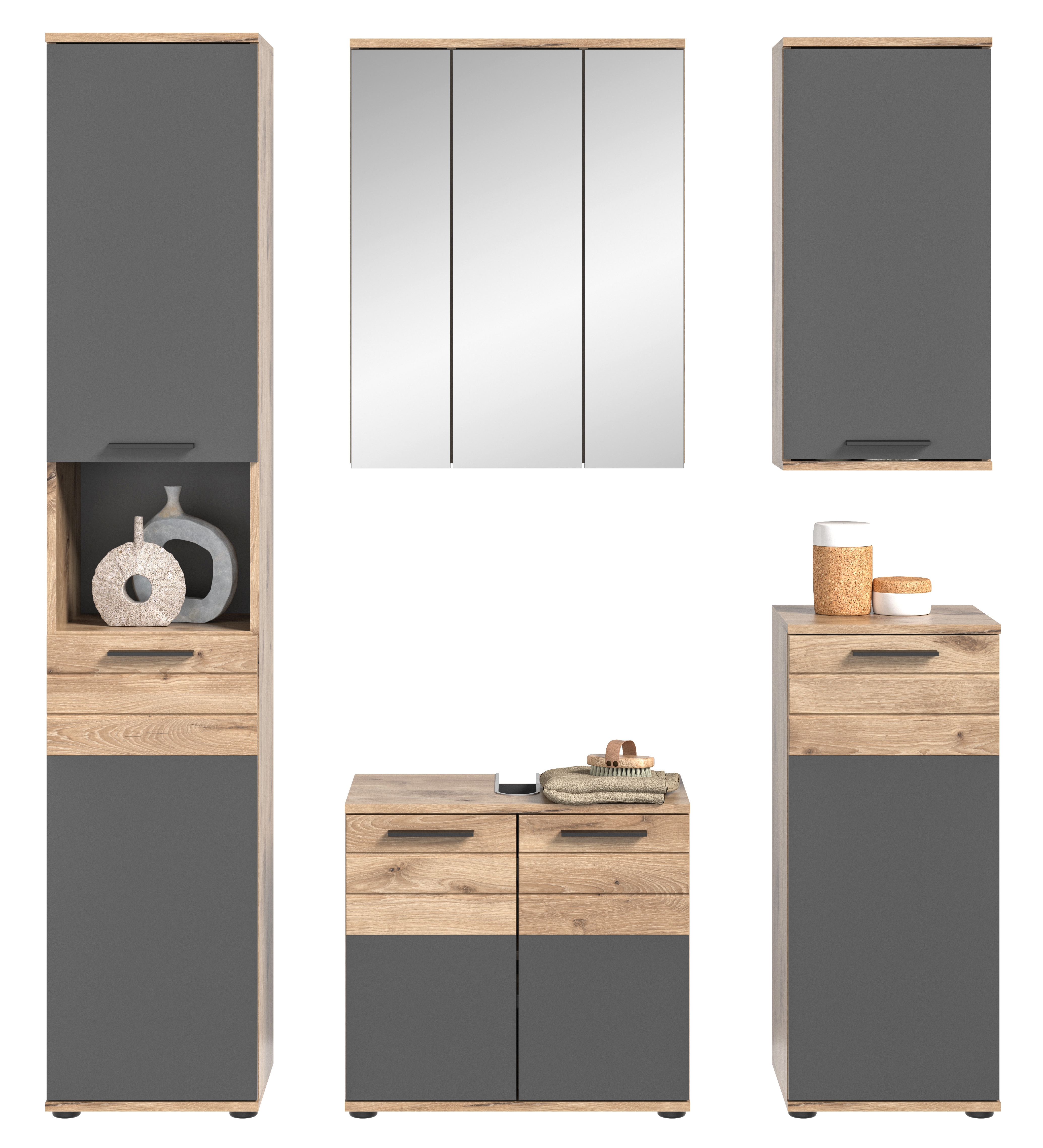 Verwandeln Sie Ihr Badezimmer in eine Oase der Entspannung mit unserer vielseitigen Badkombination in Nox Oak und Basalt grau Nachbildung. Bestehend aus Waschbeckenunterschrank, Hängeschrank, Badkommode, Hochschrank und Spiegelschrank, bietet sie nicht nur ausreichend Stauraum, sondern auch ein modernes Design. Mit ihrer hochwertigen Verarbeitung und der harmonischen Farbkombination wird diese Badkombination zum Blickfang in Ihrem Badezimmer.