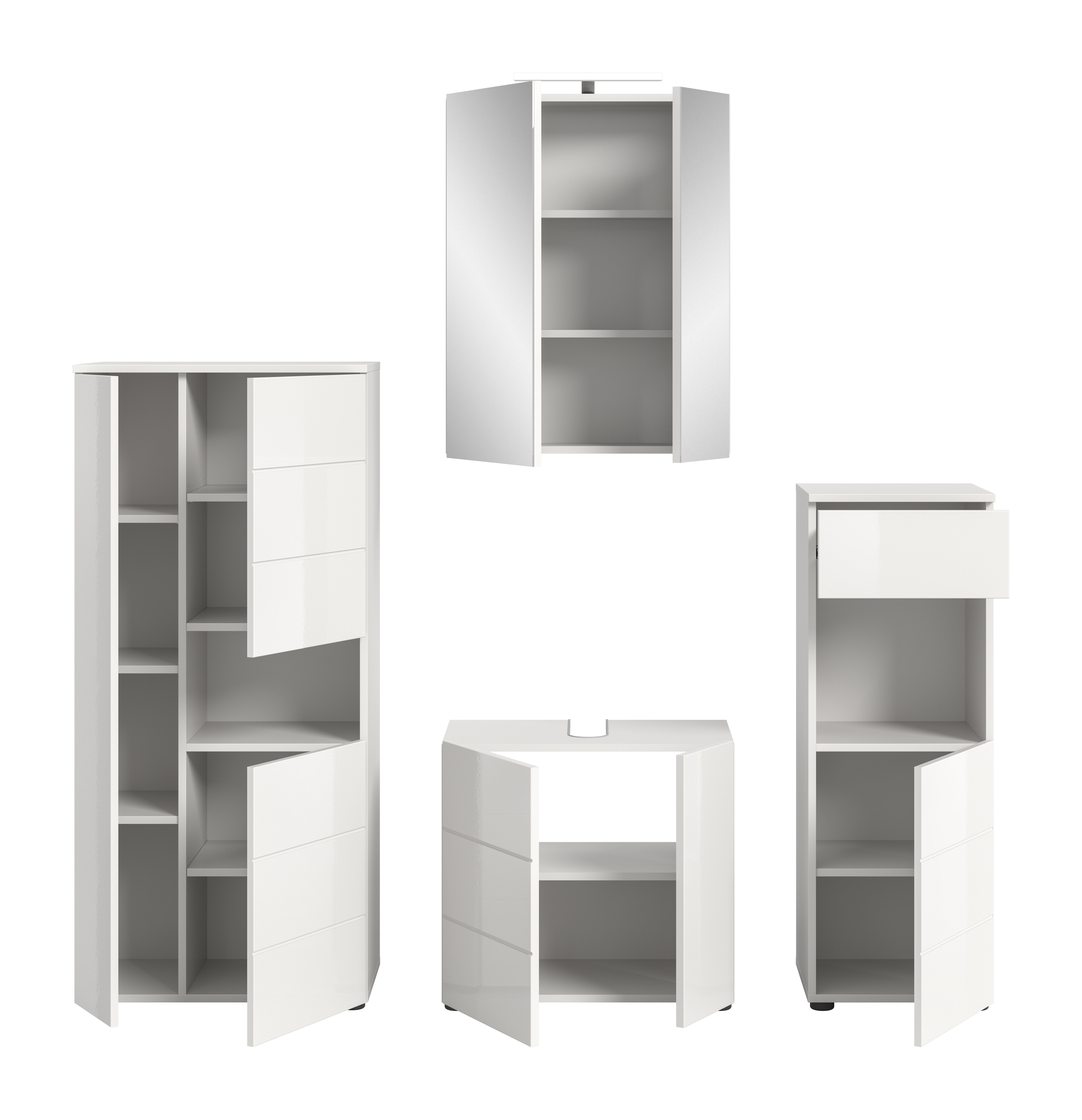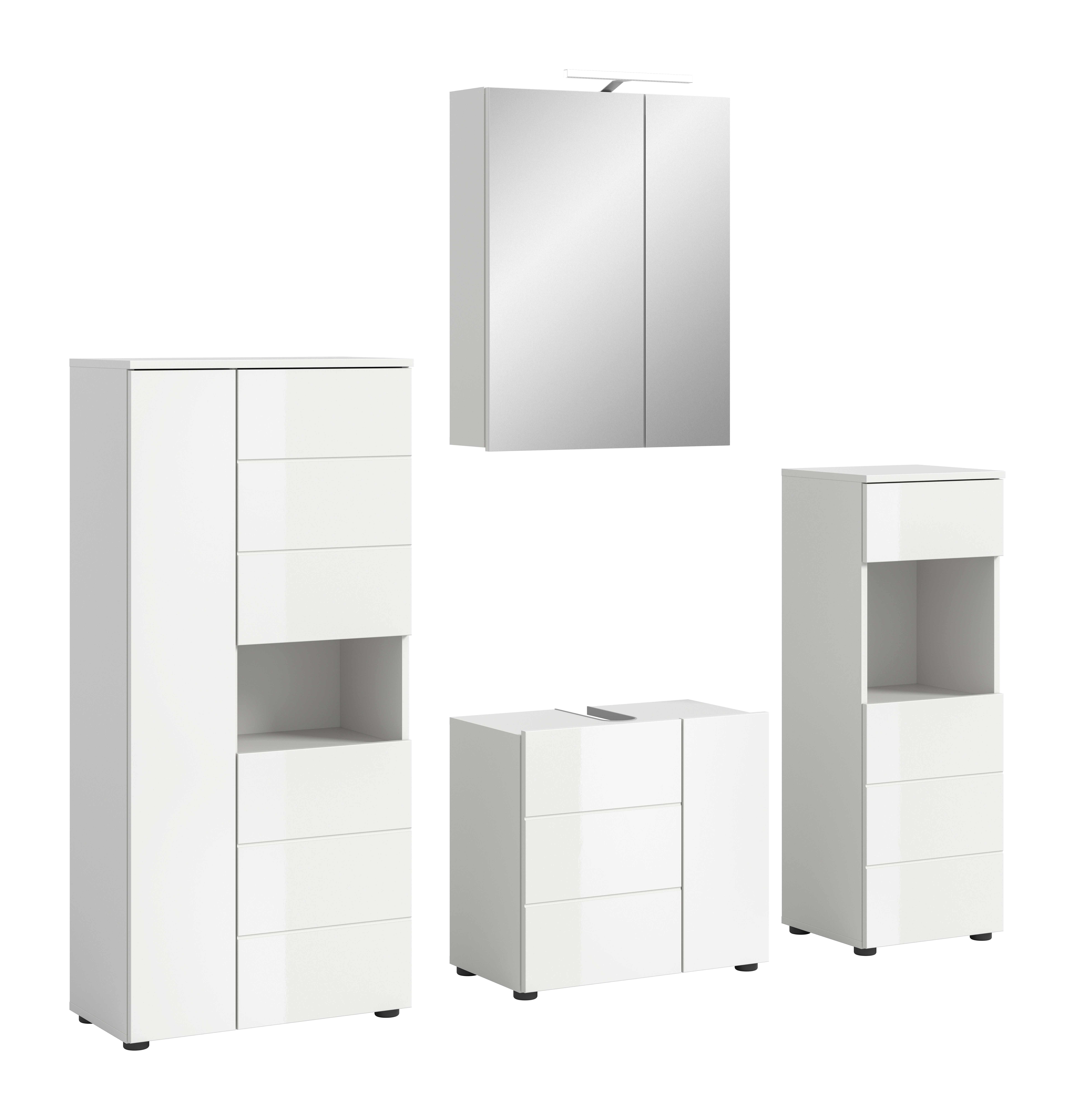 - 4 tlg. Set besteht aus: 1x Midischrank, 1x Waschbeckenunterschrank, 1x Spiegelschrank, 1x Badkommode, 1x Aufsatzleuchte