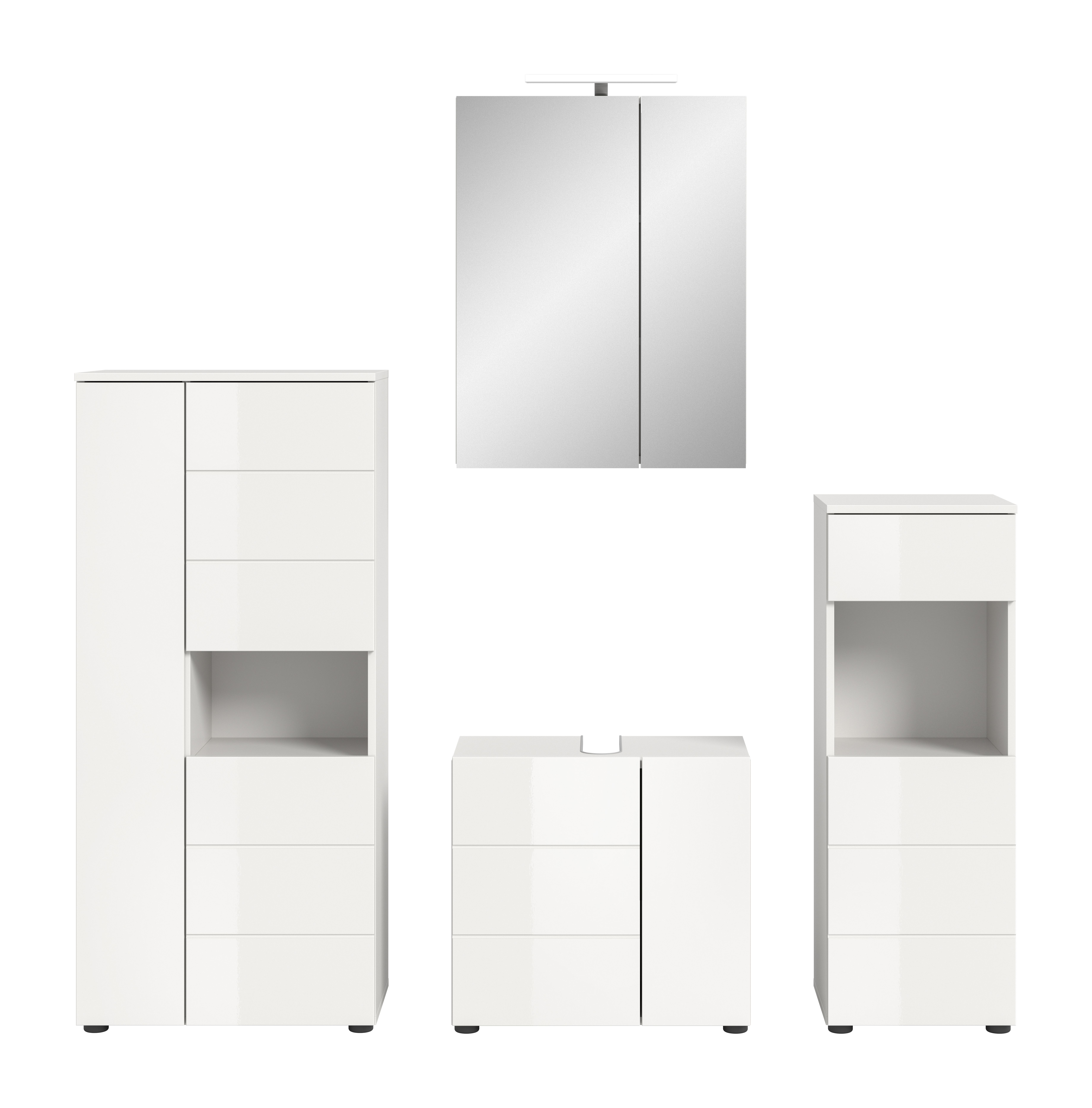Die großzügige Badkombination (B/H/T: 188x190x34 cm) in weiß hochglänzender Tiefzieh-Optik bietet Ihnen alles, was Sie für Ihr Badezimmer benötigen. Sie beinhaltet einen breiten Badschrank, einen Waschbeckenunterschrank, einen Spiegelschrank, einen schmalen Badschrank und eine praktische Aufsatzleuchte. Diese Kombination schafft eine helle, einladende Atmosphäre und sorgt gleichzeitig für Ordnung. Genießen Sie die perfekte Mischung aus Stil und Funktionalität in Ihrer Badeoase mit dieser hochwertigen Badkombination!