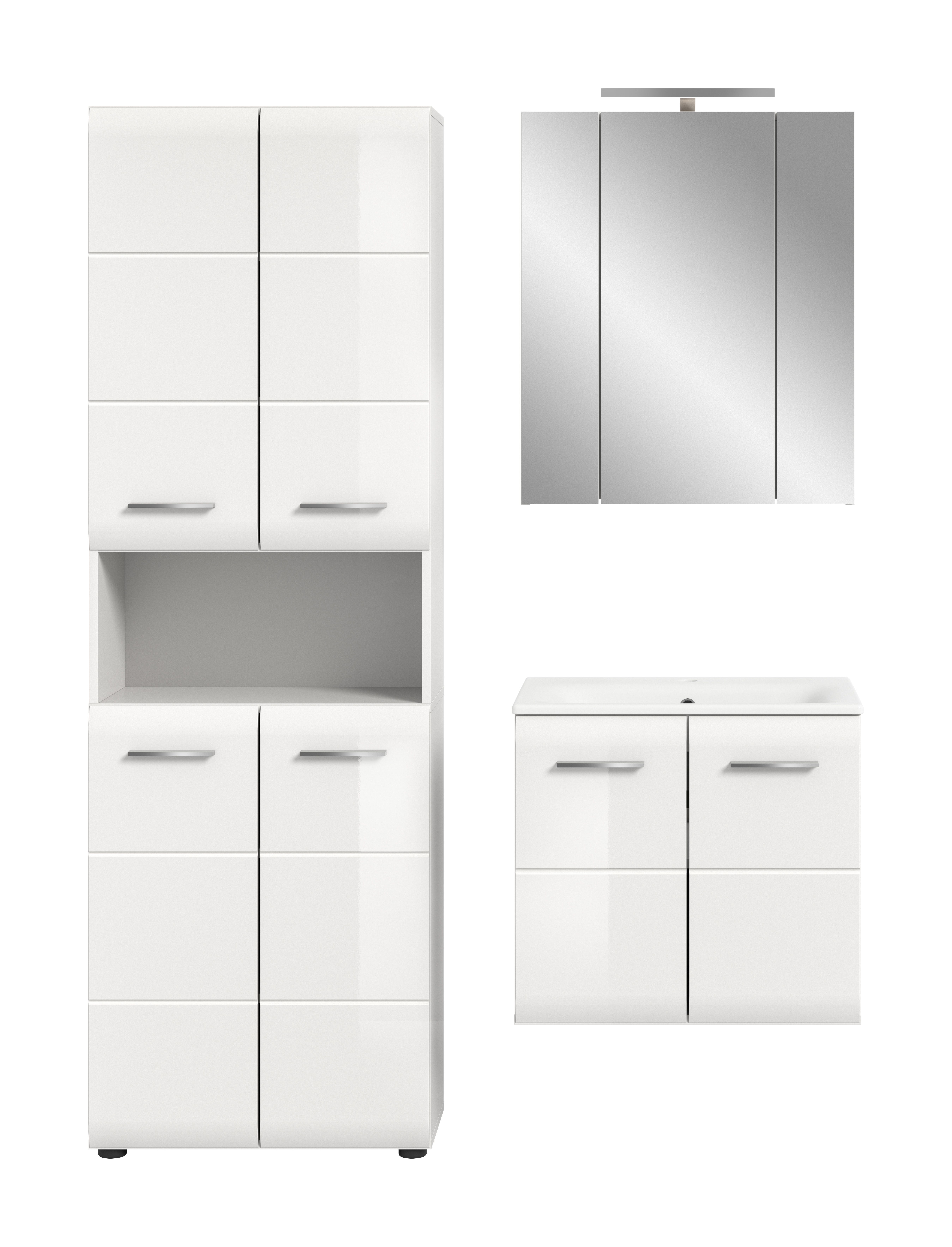 - 5-teilige Badkombination beteht aus 1x Hochschrank breit, 1x Waschtisch inkl. Waschbecken, 1x Spiegelschrank inkl. Beleuchtung