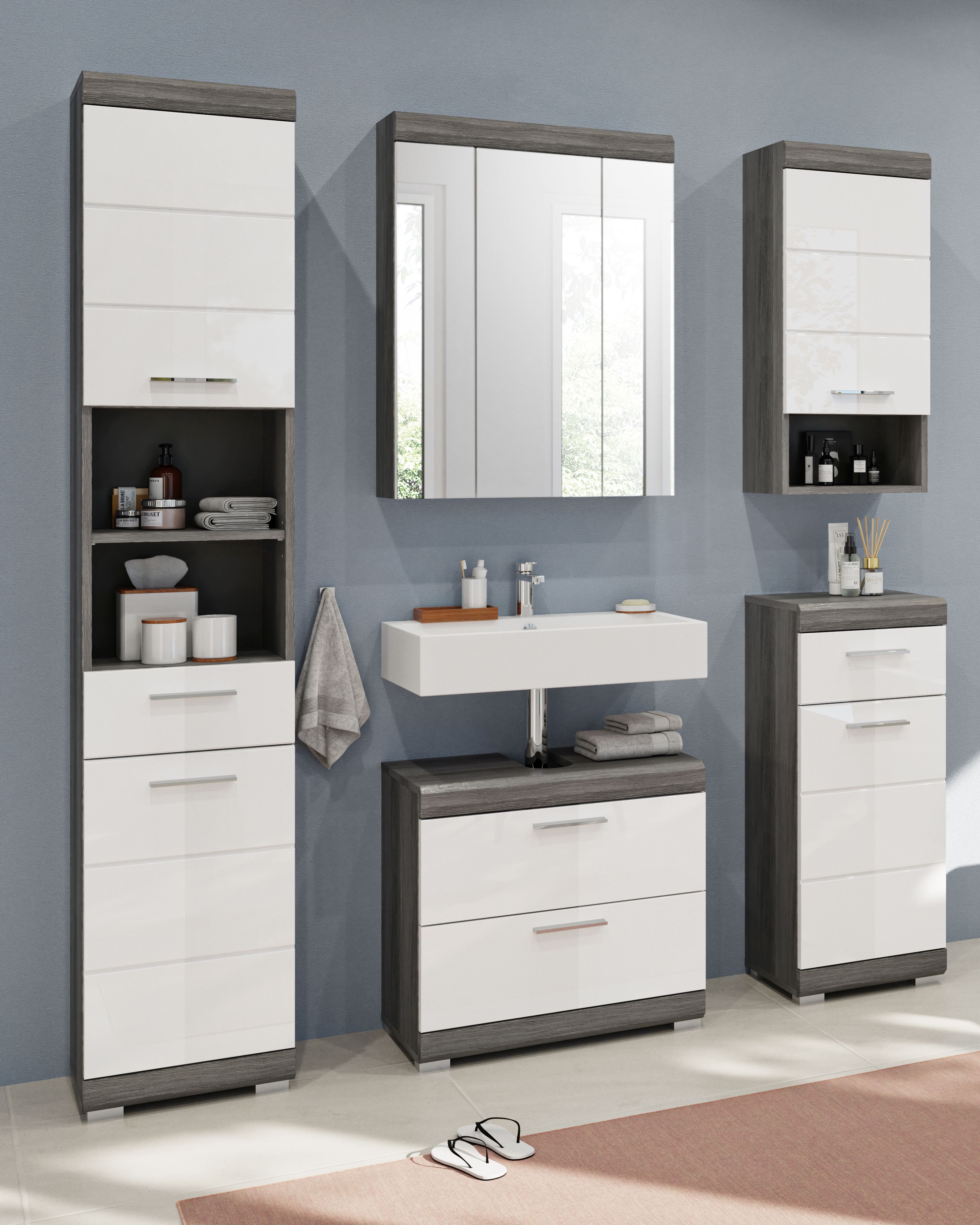 Verleihe deinem Badezimmer den ultimativen Style mit unserer Badkombination in angesagtem Rauchsilber Nachbildung und weißem Hochglanz tiefgezogenem Finish. Mit ihrem trendigen Design und der hochwertigen Verarbeitung setzt sie ein modernes Statement in deinem Zuhause. Entdecke jetzt die perfekte Verbindung von Coolness und Funktionalität für dein Badezimmer!
