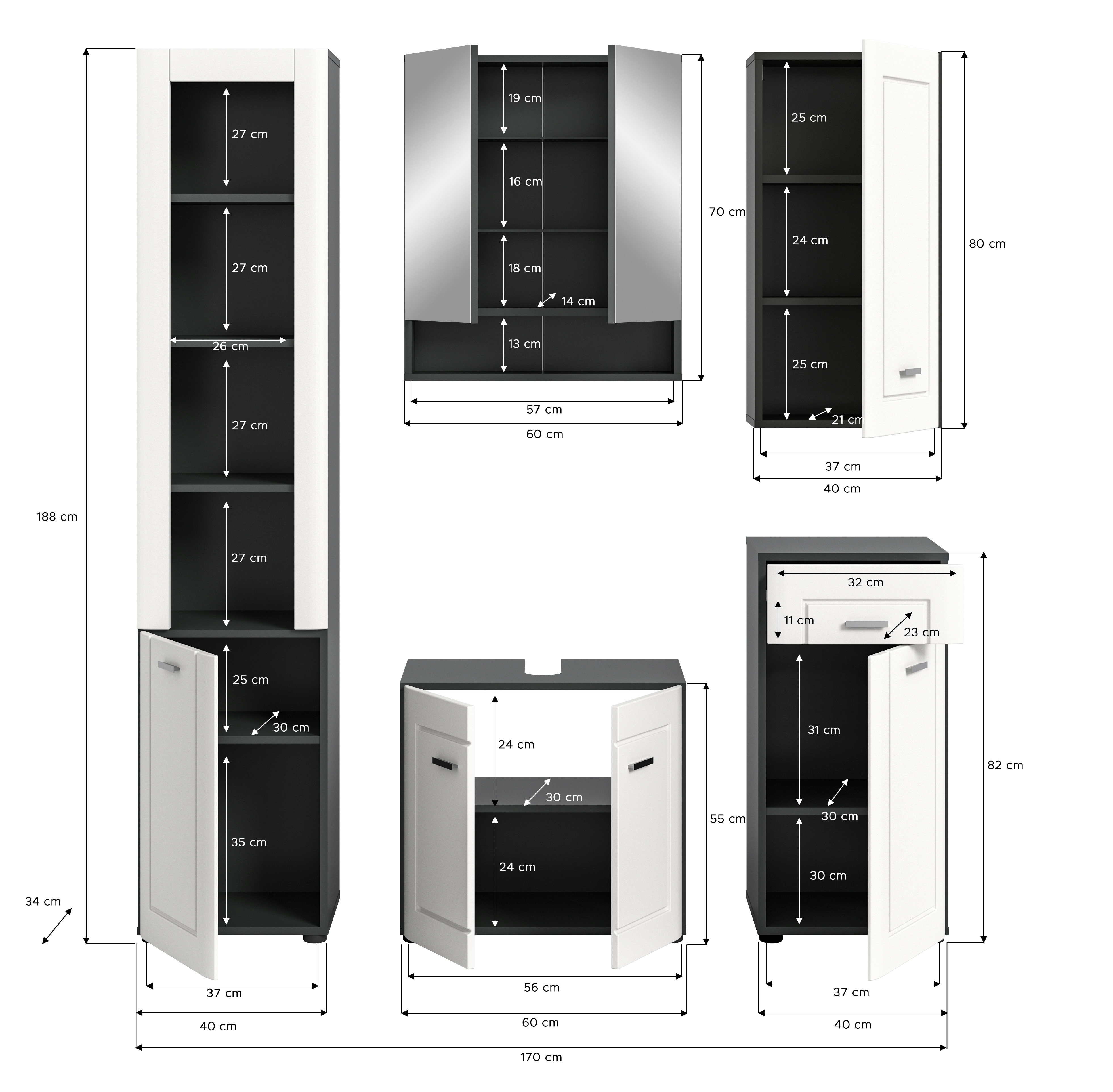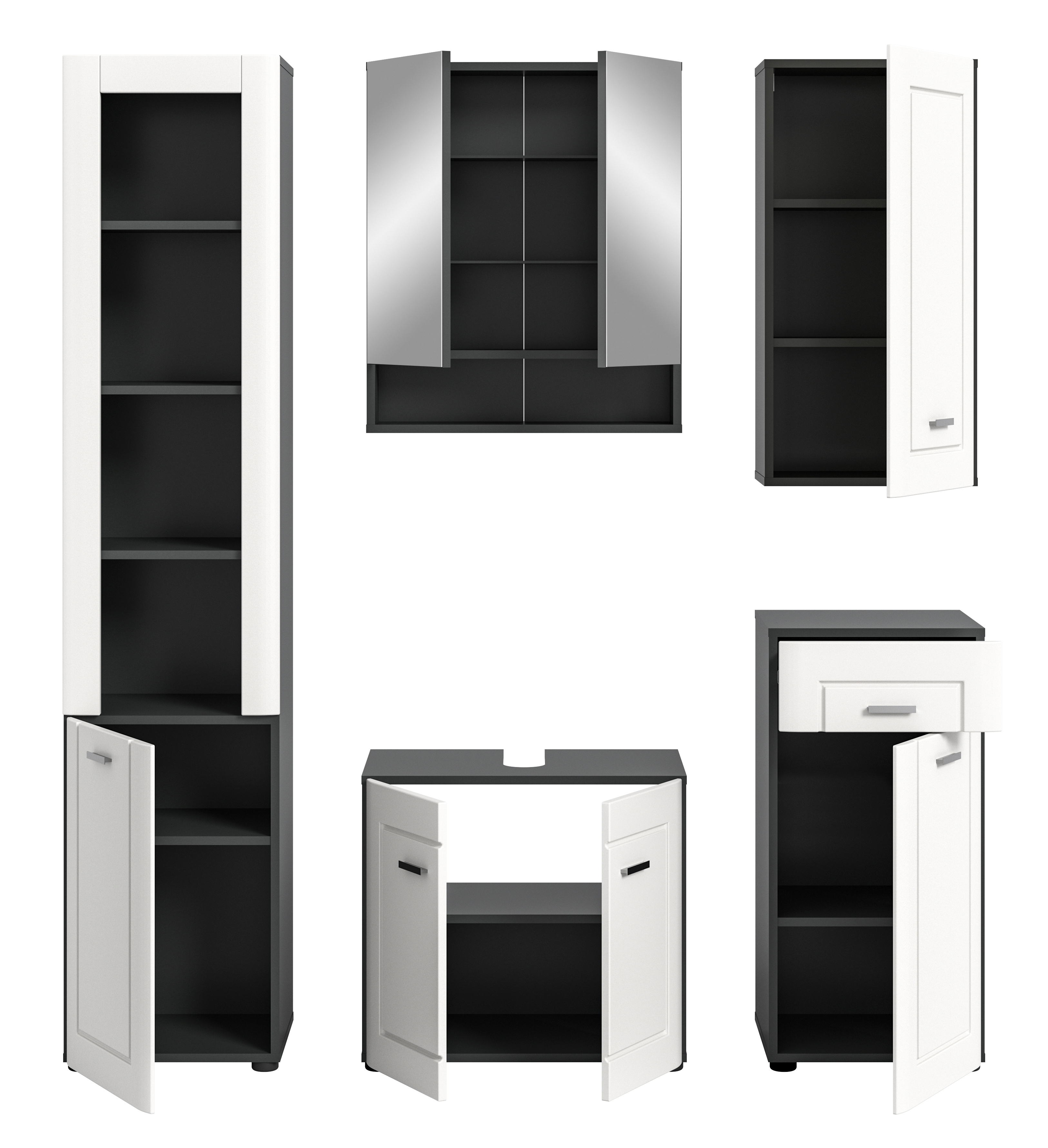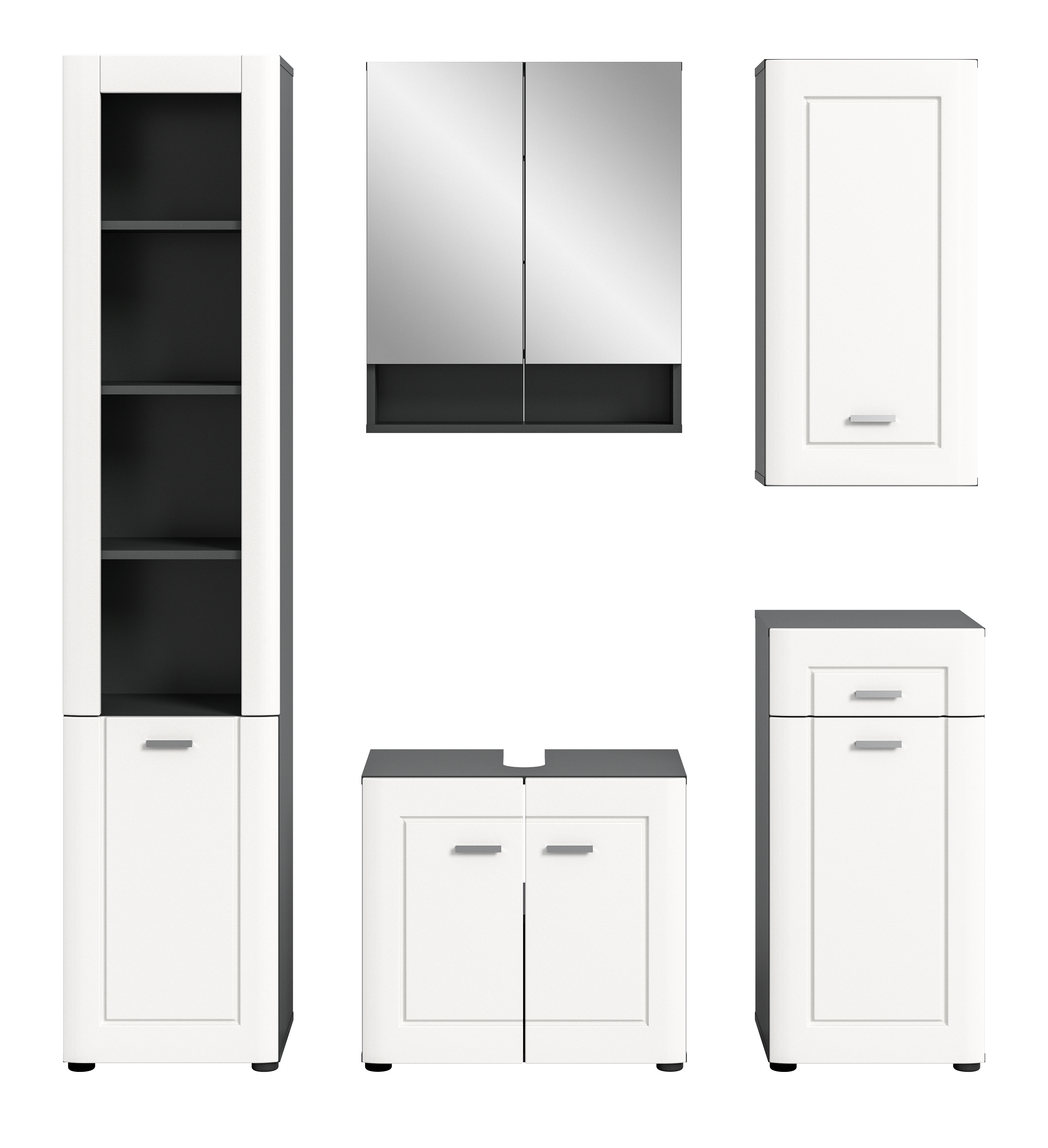 - Funktionalität: Umfassende Badkombination mit verschiedenen Elementen wie Waschbeckenunterschrank, Hochschrank, Spiegelschrank, Badkommode und Hängeschrank für eine optimale Nutzung des vorhandenen Raums und eine effiziente Aufbewahrung von Badutensilien und Reinigungsprodukten.
