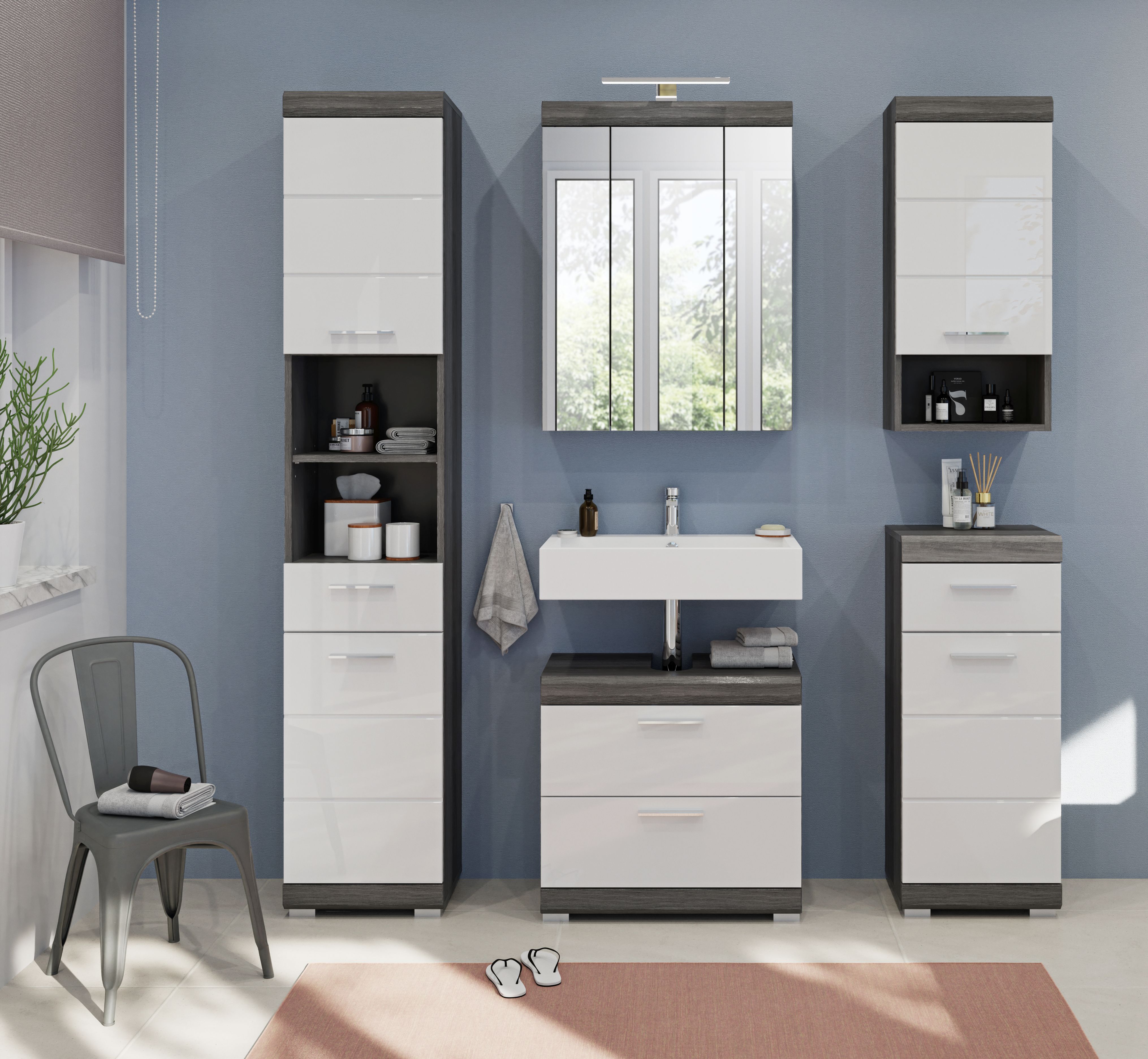 Verleihe deinem Badezimmer den ultimativen Style mit unserer Badkombination in angesagtem Rauchsilber Nachbildung und weißem Hochglanz tiefgezogenem Finish. Mit ihrem trendigen Design und der hochwertigen Verarbeitung setzt sie ein modernes Statement in deinem Zuhause. Entdecke jetzt die perfekte Verbindung von Coolness und Funktionalität für dein Badezimmer!