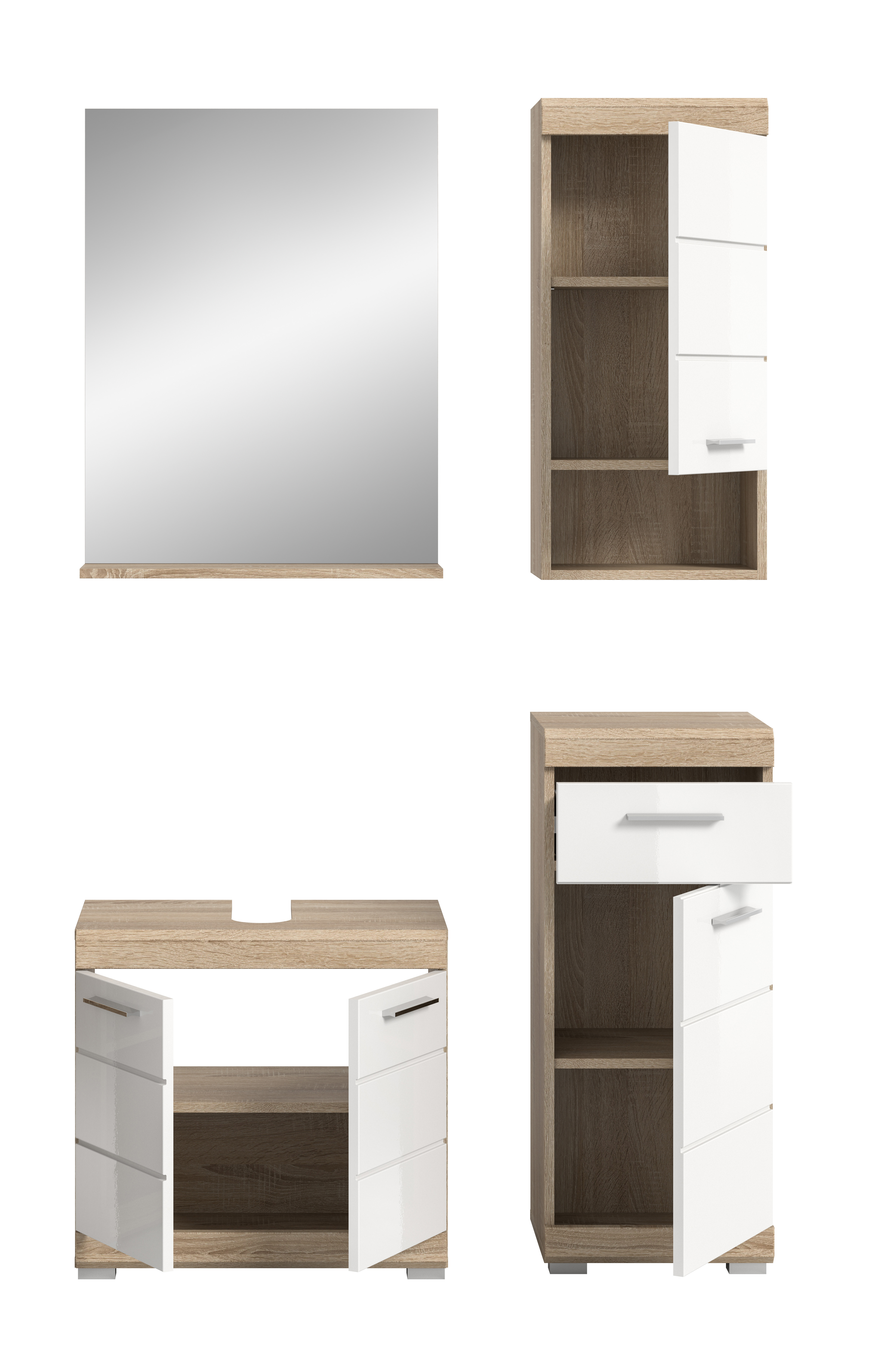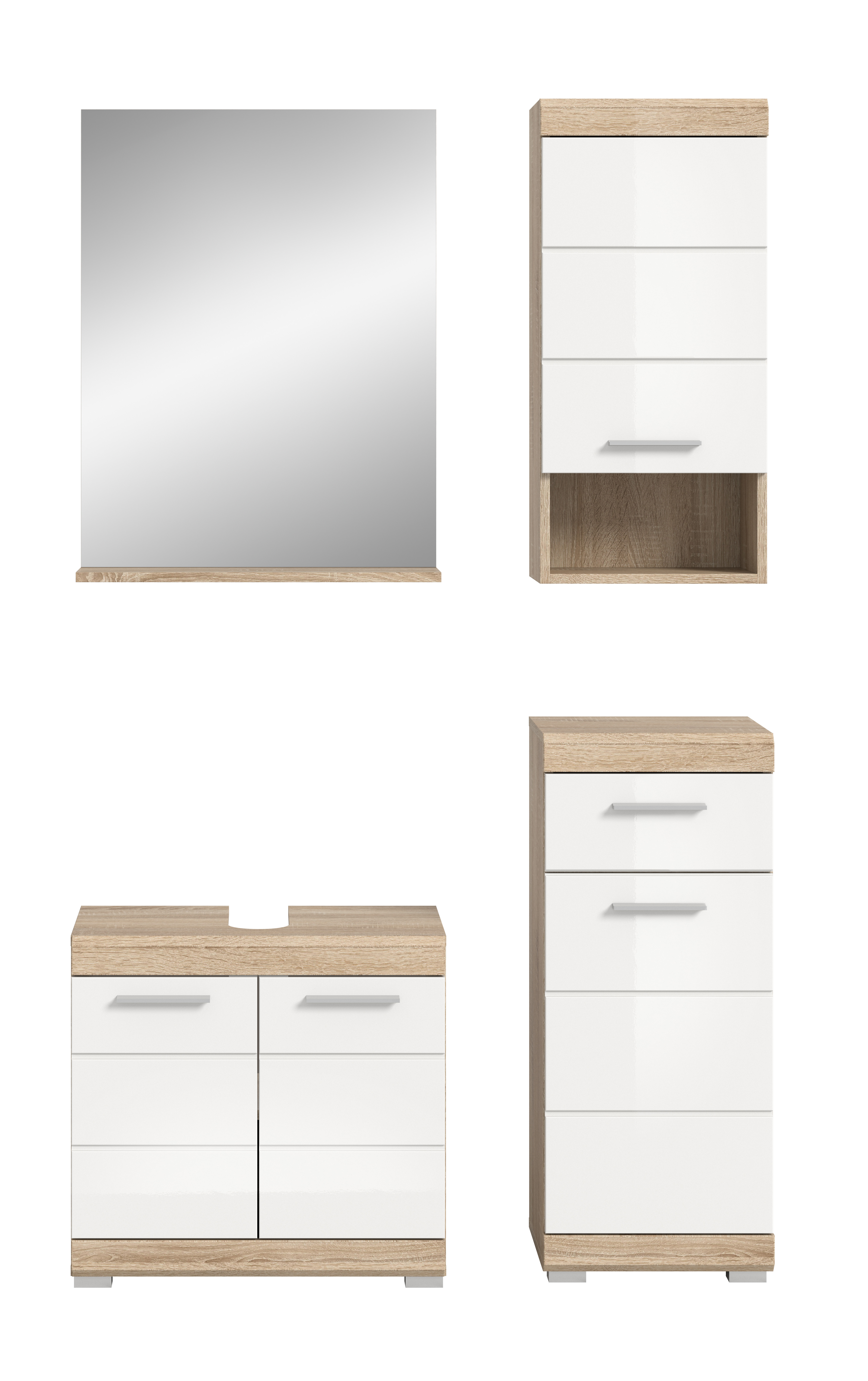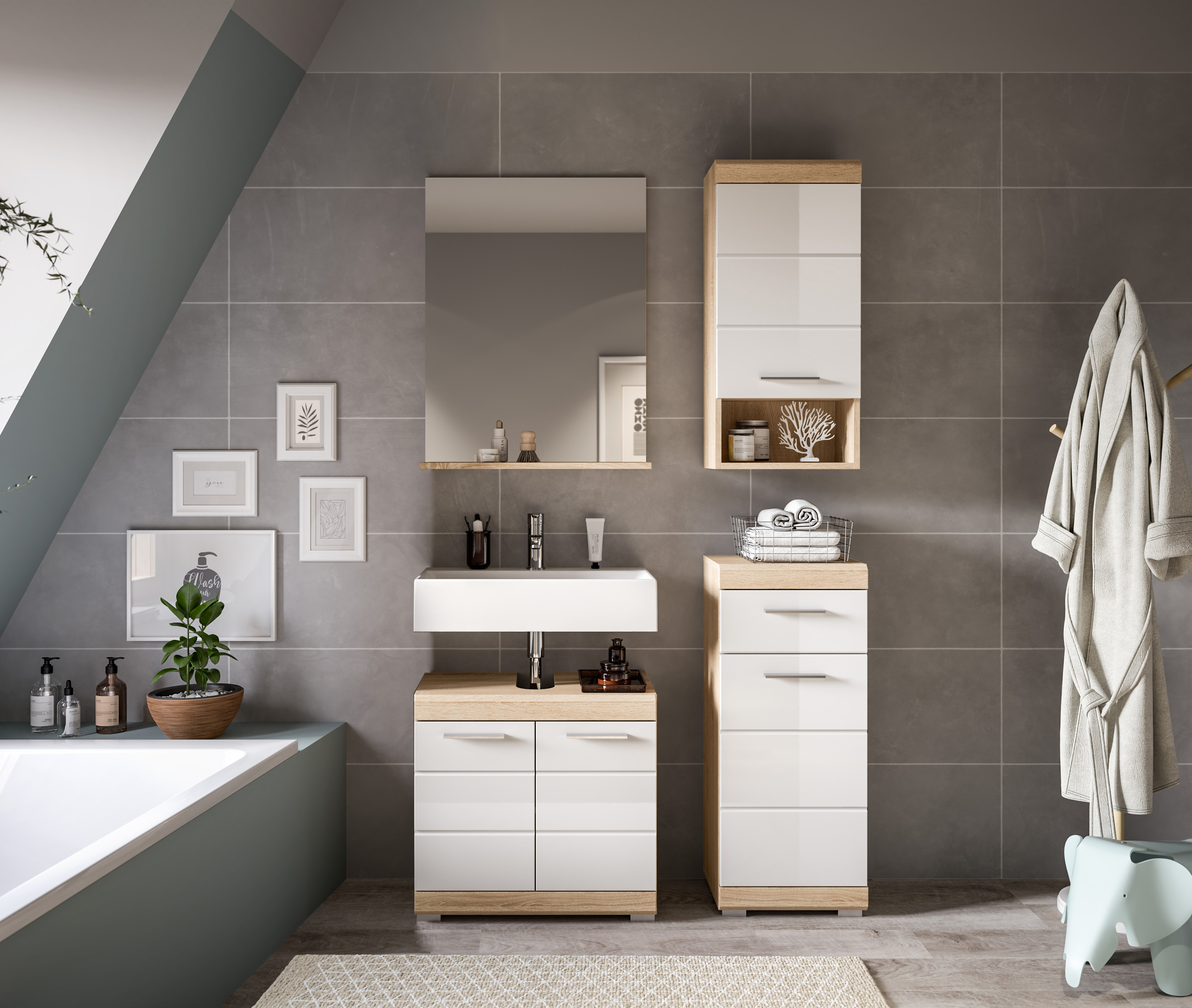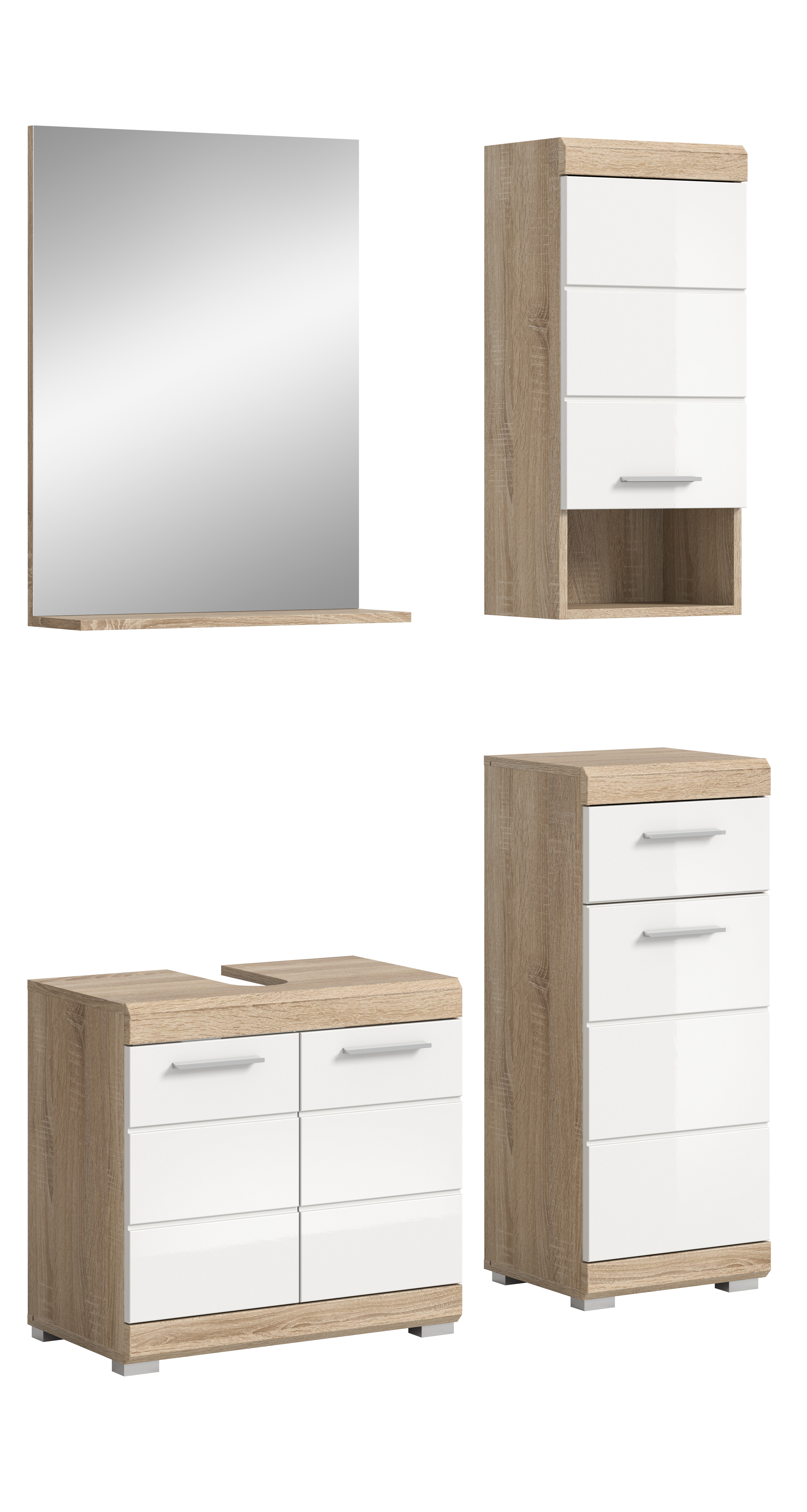 Entdecken Sie die perfekte Kombination aus Stil und Funktionalität für Ihr Badezimmer mit unserer Badkombination in Sonoma Eiche hell und weißem Hochglanz. Sie bietet bietet ausreichend Stauraum und verleiht Ihrem Raum einen modernen und ansprechenden Look. Tauchen Sie ein in zeitlose Eleganz und optimale Organisation mit diesem einzigartigen Möbelstück.