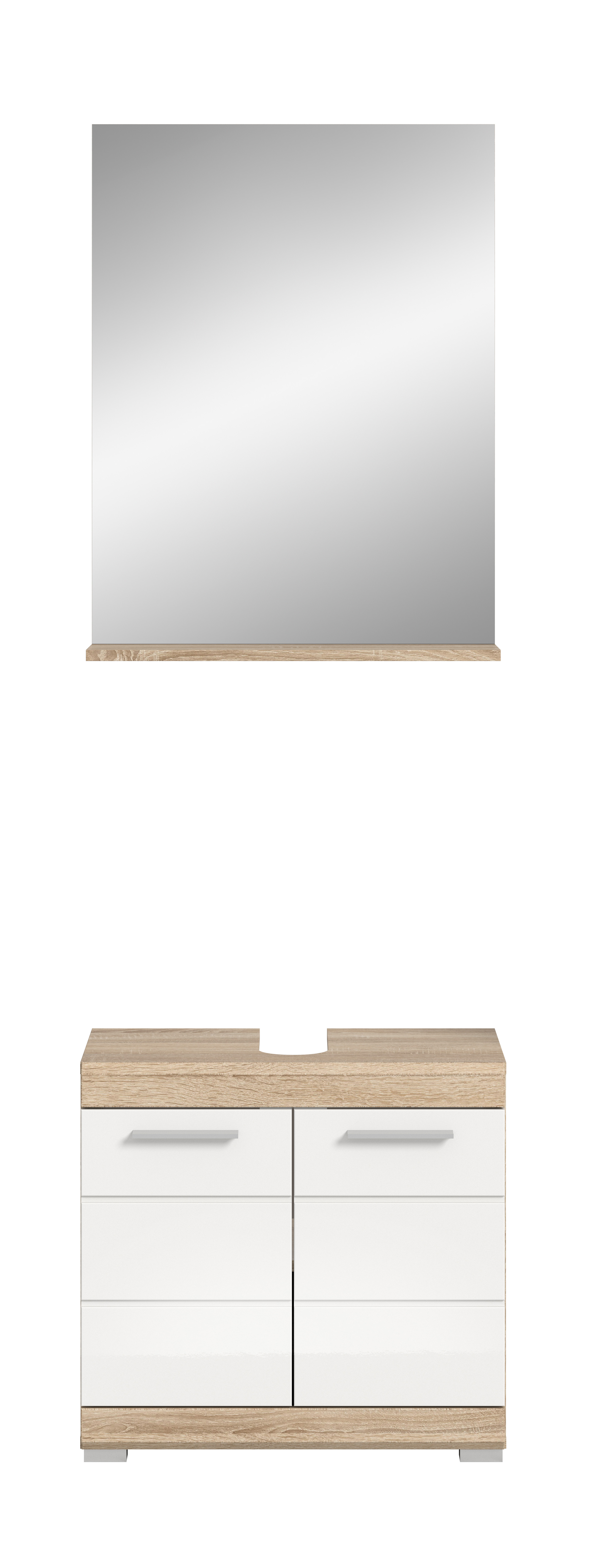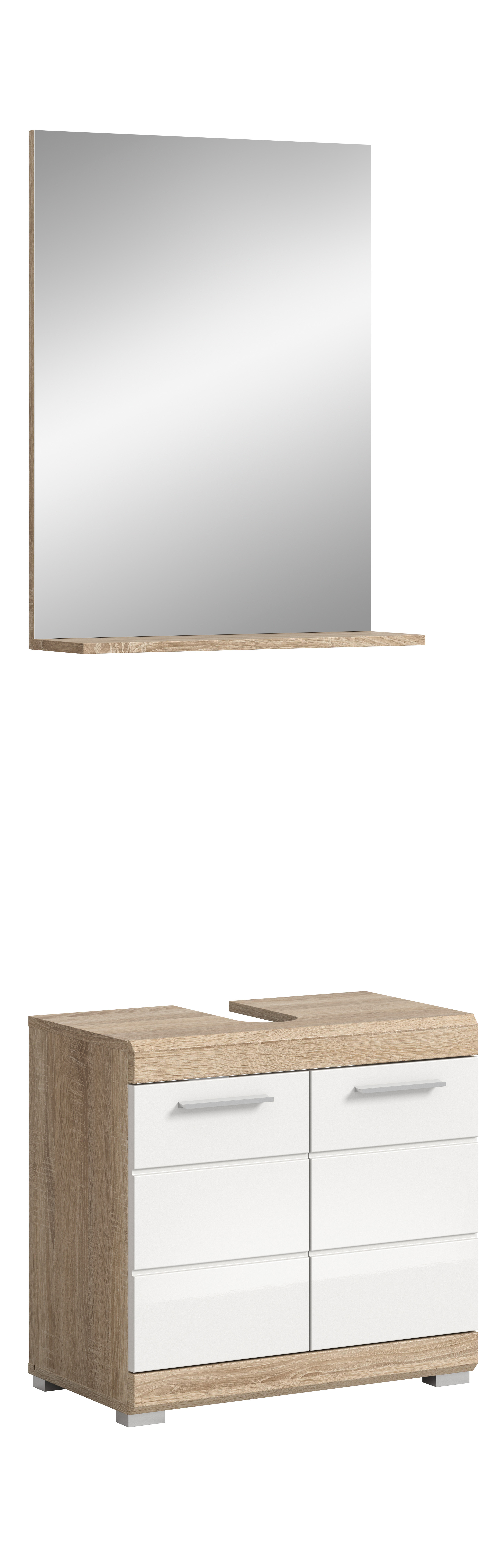 Entdecken Sie die perfekte Kombination aus Stil und Funktionalität für Ihr Badezimmer mit unserer Badkombination in Sonoma Eiche hell und weißem Hochglanz. Sie bietet bietet ausreichend Stauraum und verleiht Ihrem Raum einen modernen und ansprechenden Look. Tauchen Sie ein in zeitlose Eleganz und optimale Organisation mit diesem einzigartigen Möbelstück.