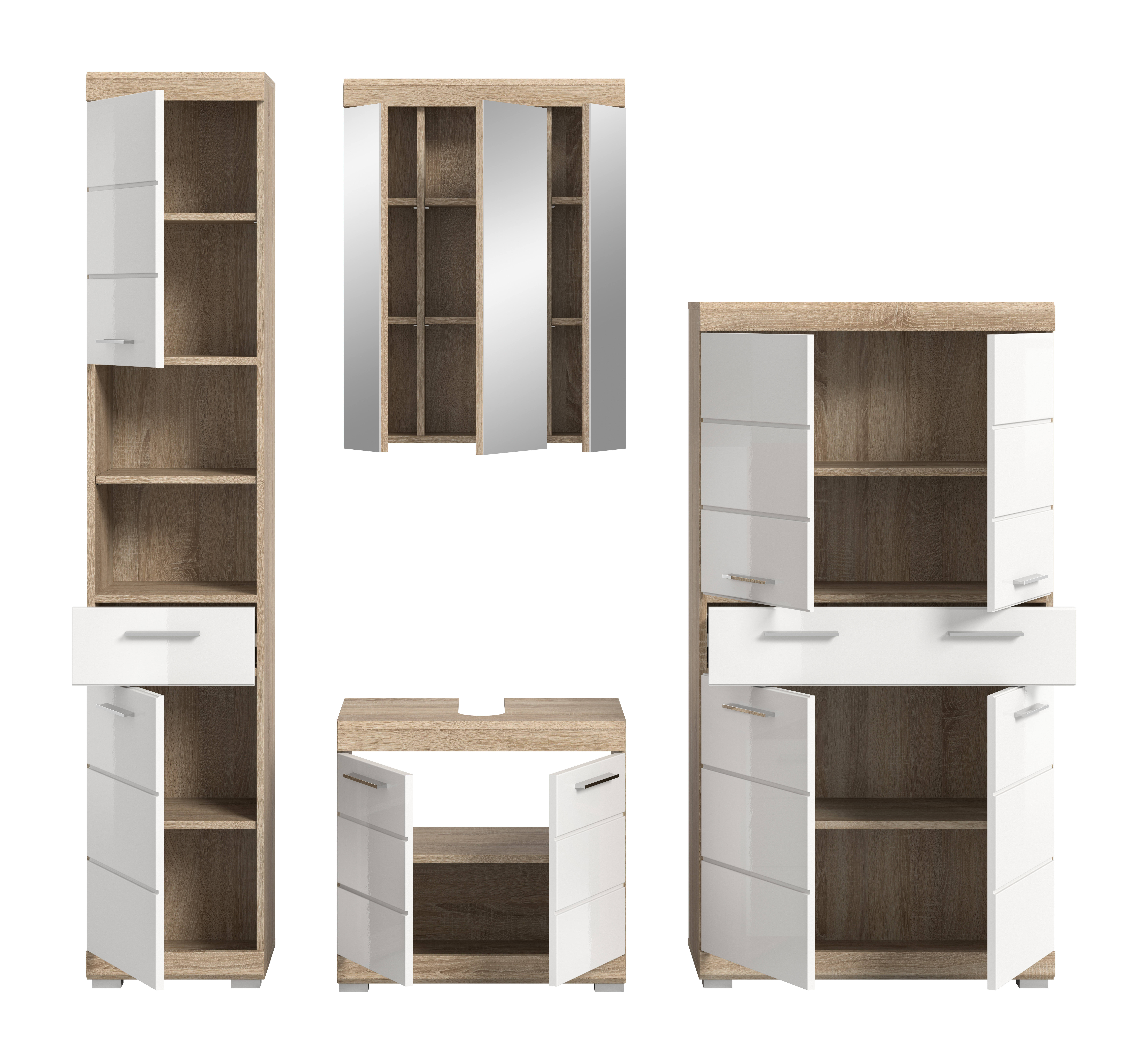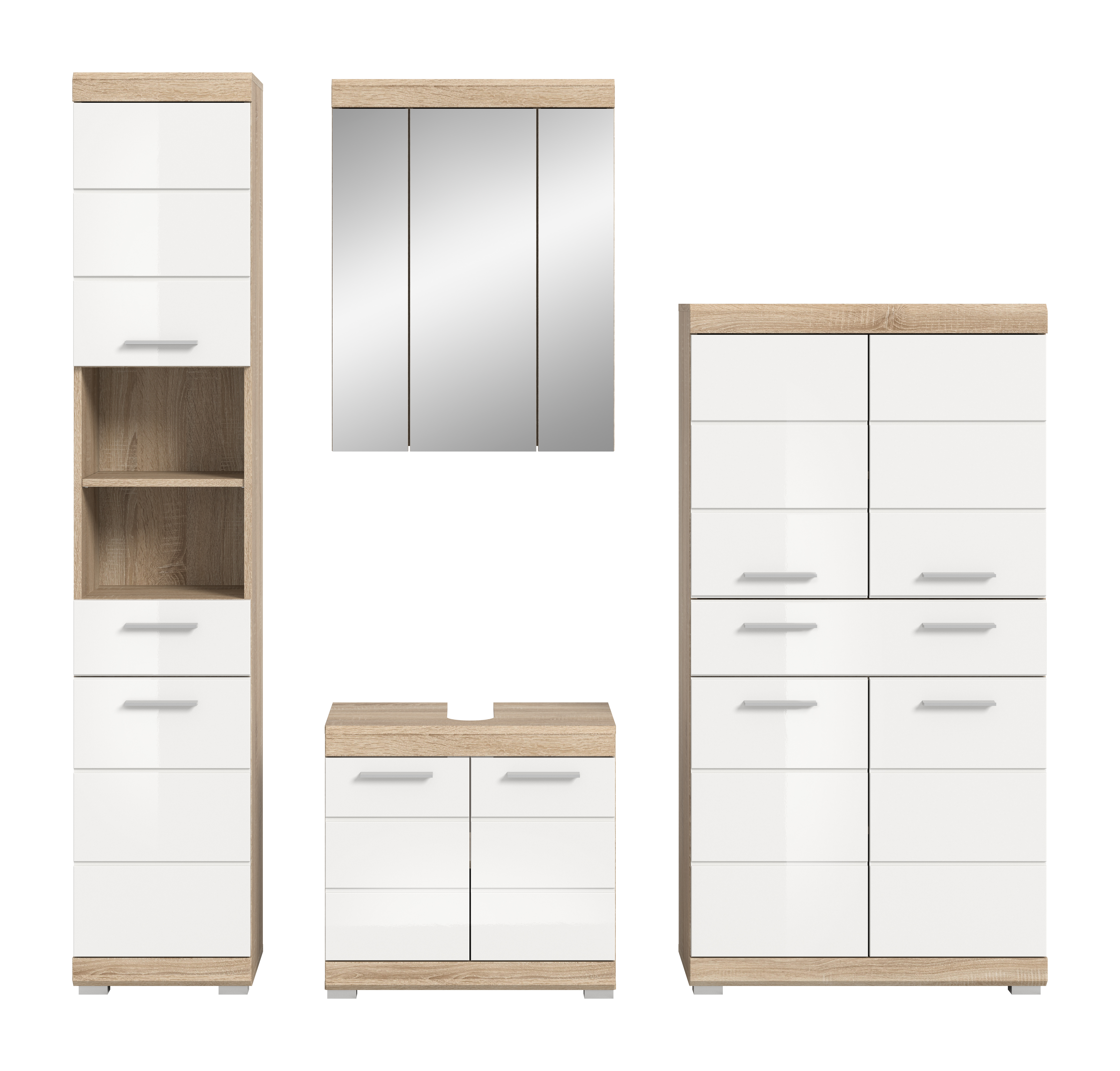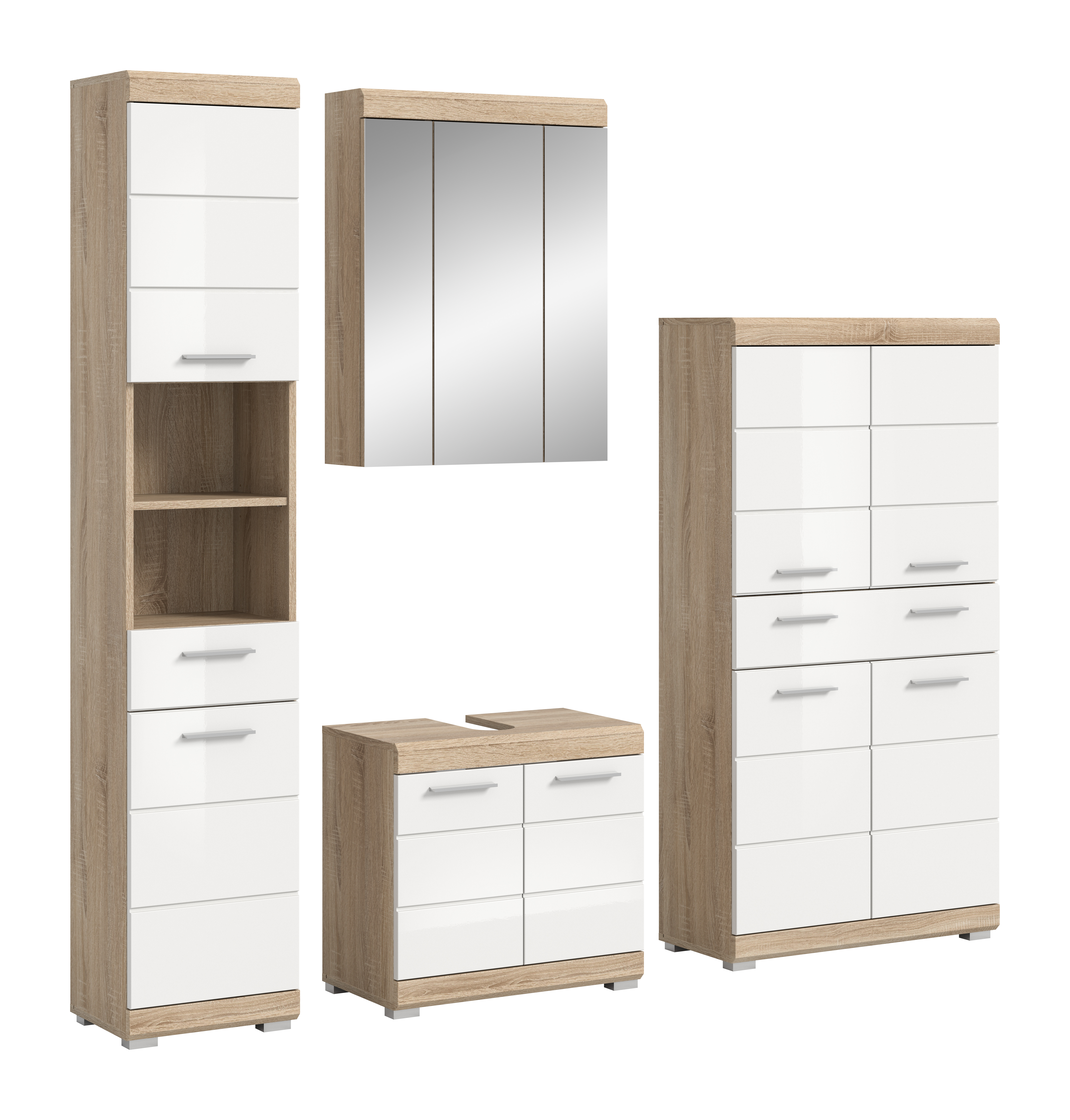 Entdecken Sie die perfekte Kombination aus Stil und Funktionalität für Ihr Badezimmer mit unserer Badkombination in Sonoma Eiche hell und weißem Hochglanz. Sie bietet bietet ausreichend Stauraum und verleiht Ihrem Raum einen modernen und ansprechenden Look. Tauchen Sie ein in zeitlose Eleganz und optimale Organisation mit diesem einzigartigen Möbelstück.
