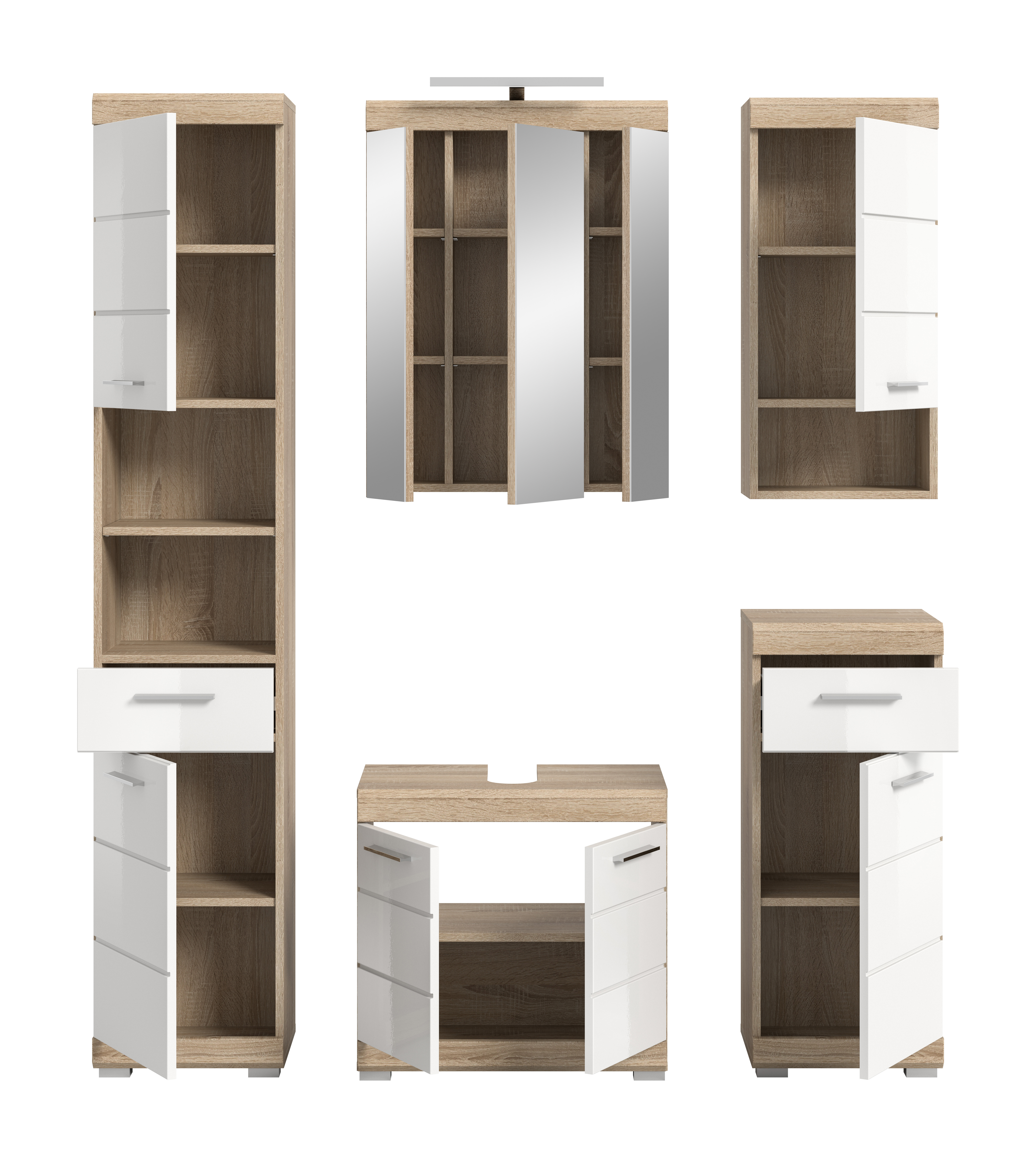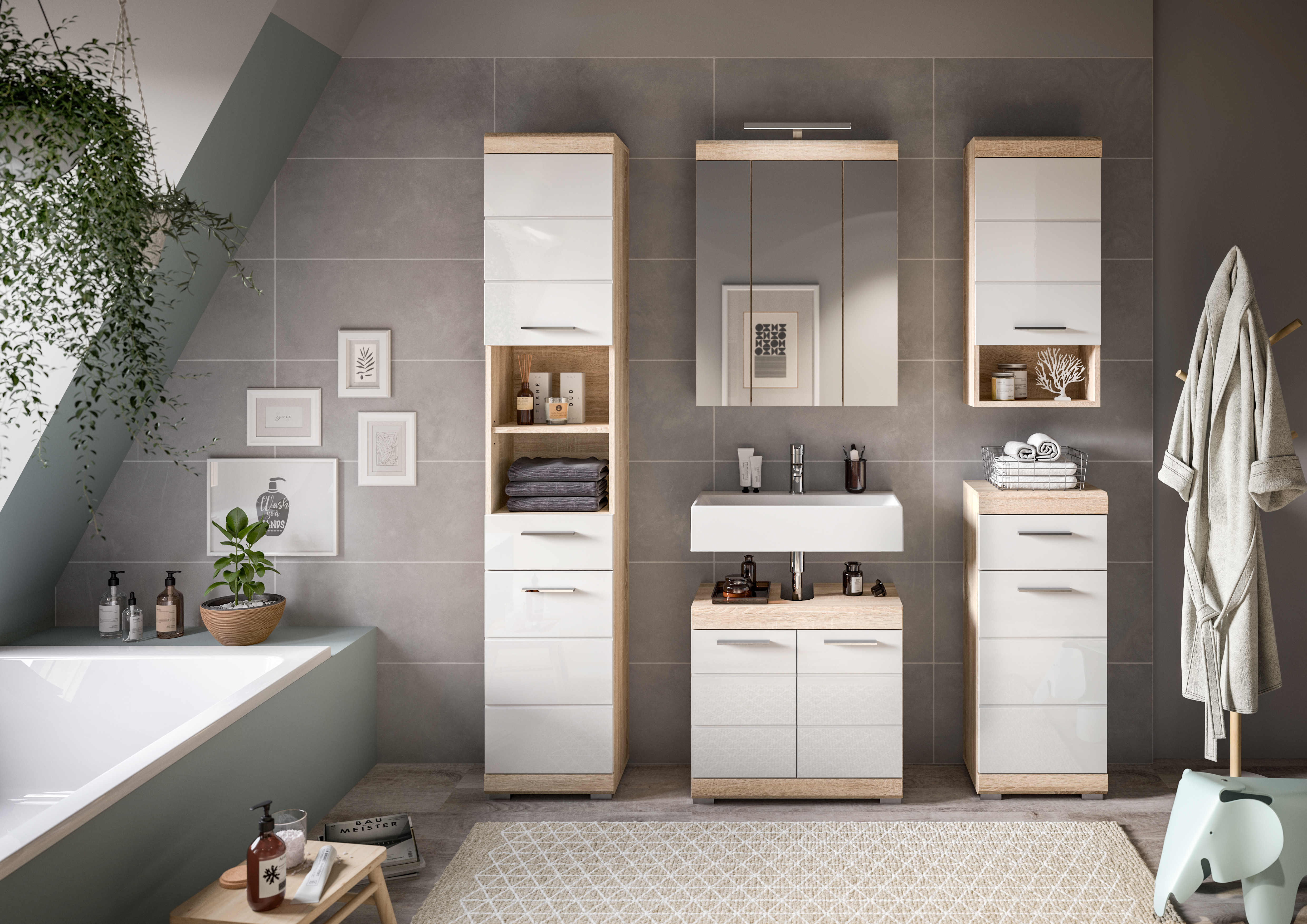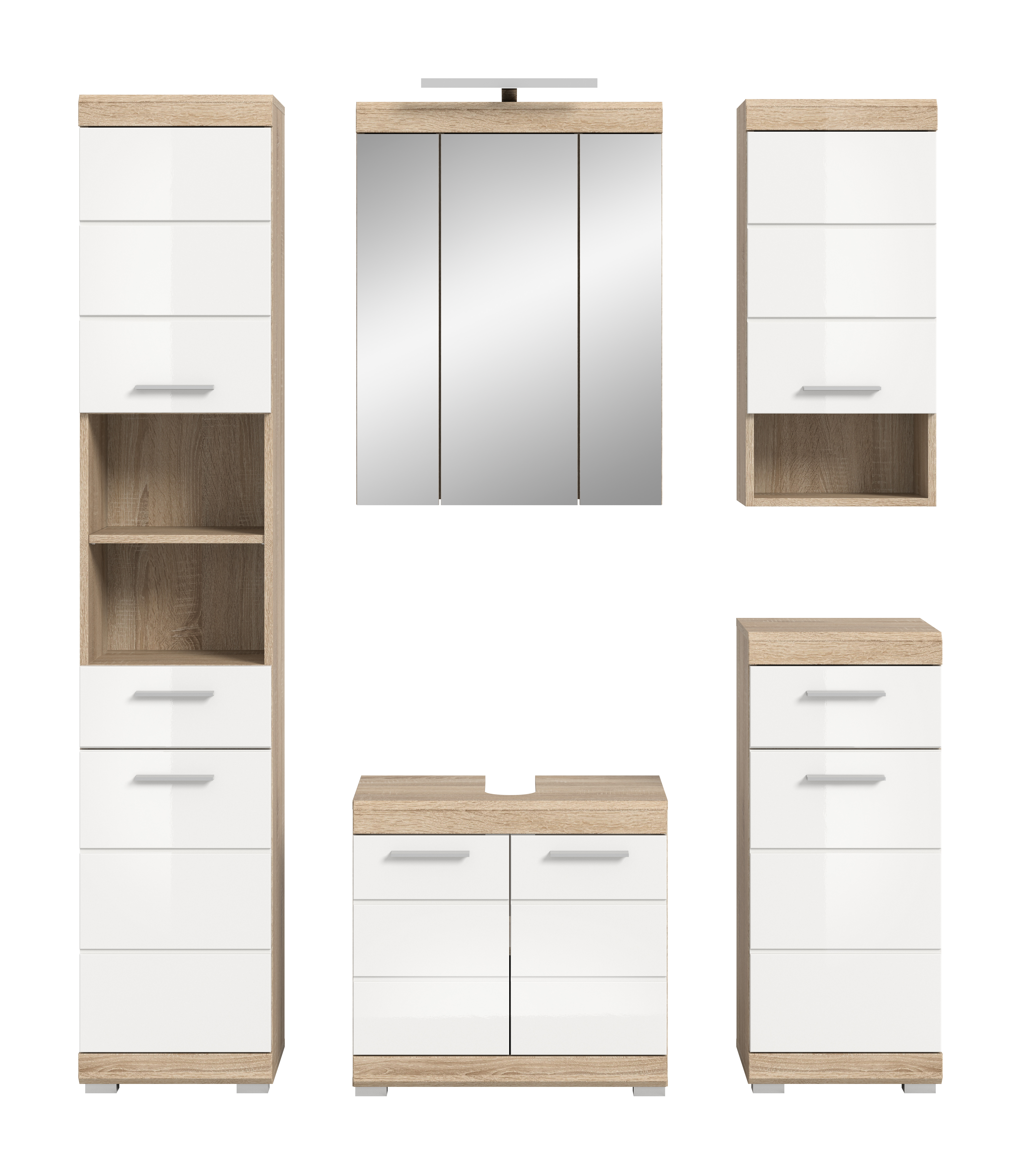 Entdecken Sie die perfekte Kombination aus Stil und Funktionalität für Ihr Badezimmer mit unserer Badkombination in Sonoma Eiche hell und weißem Hochglanz. Sie bietet bietet ausreichend Stauraum und verleiht Ihrem Raum einen modernen und ansprechenden Look. Tauchen Sie ein in zeitlose Eleganz und optimale Organisation mit diesem einzigartigen Möbelstück.