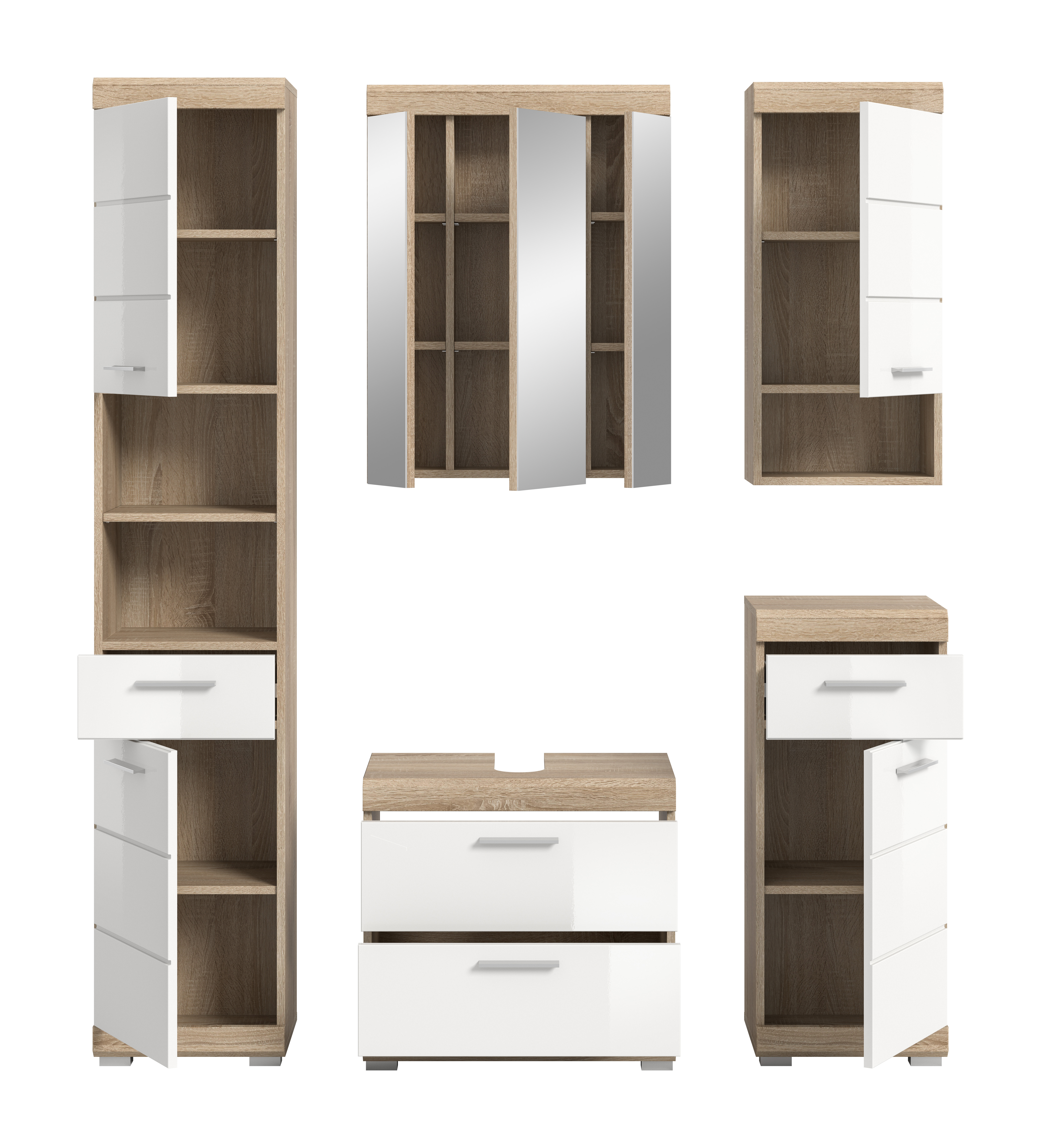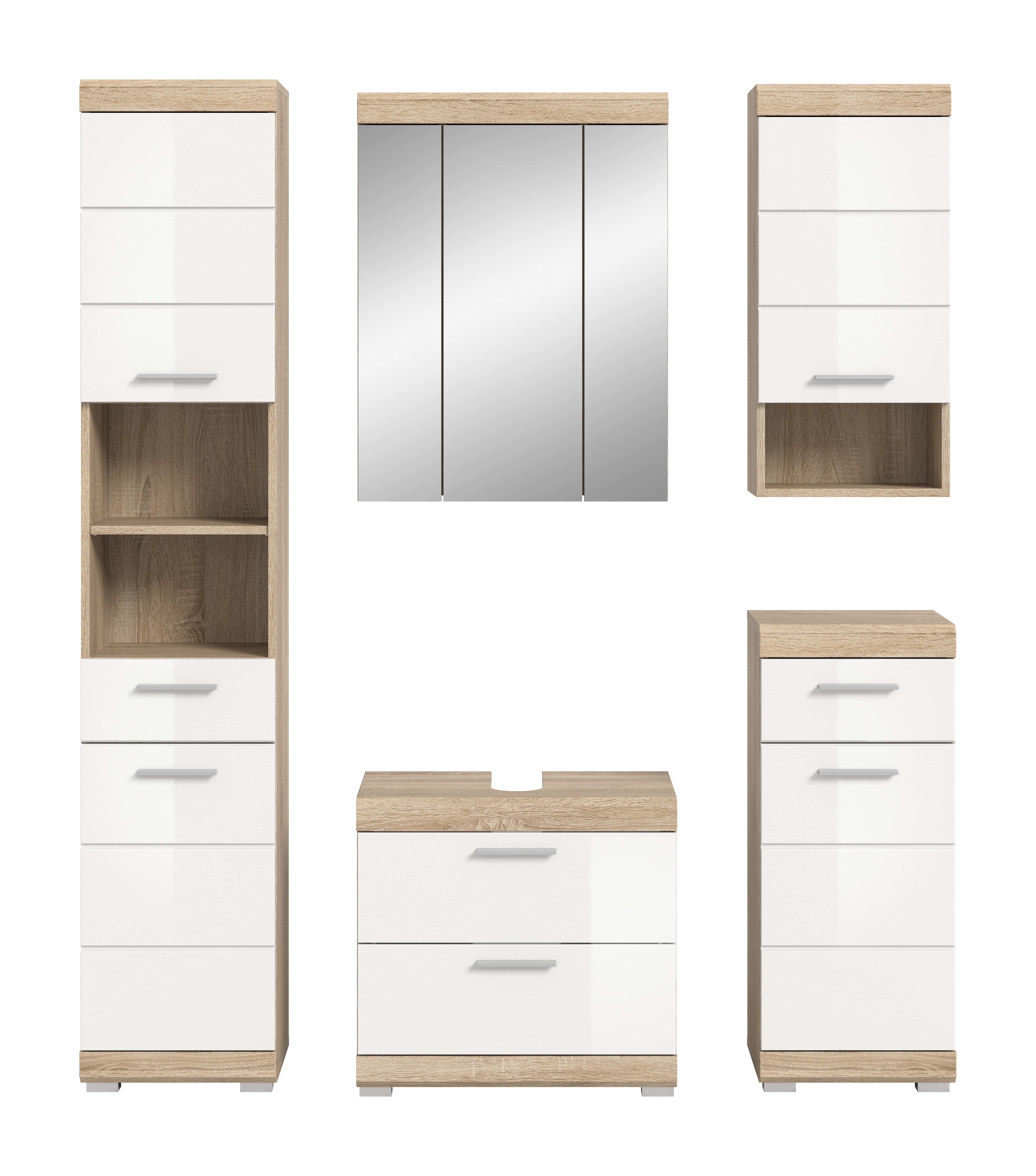 Entdecken Sie die perfekte Kombination aus Stil und Funktionalität für Ihr Badezimmer mit unserer Badkombination in Sonoma Eiche hell und weißem Hochglanz. Sie bietet bietet ausreichend Stauraum und verleiht Ihrem Raum einen modernen und ansprechenden Look. Tauchen Sie ein in zeitlose Eleganz und optimale Organisation mit diesem einzigartigen Möbelstück.