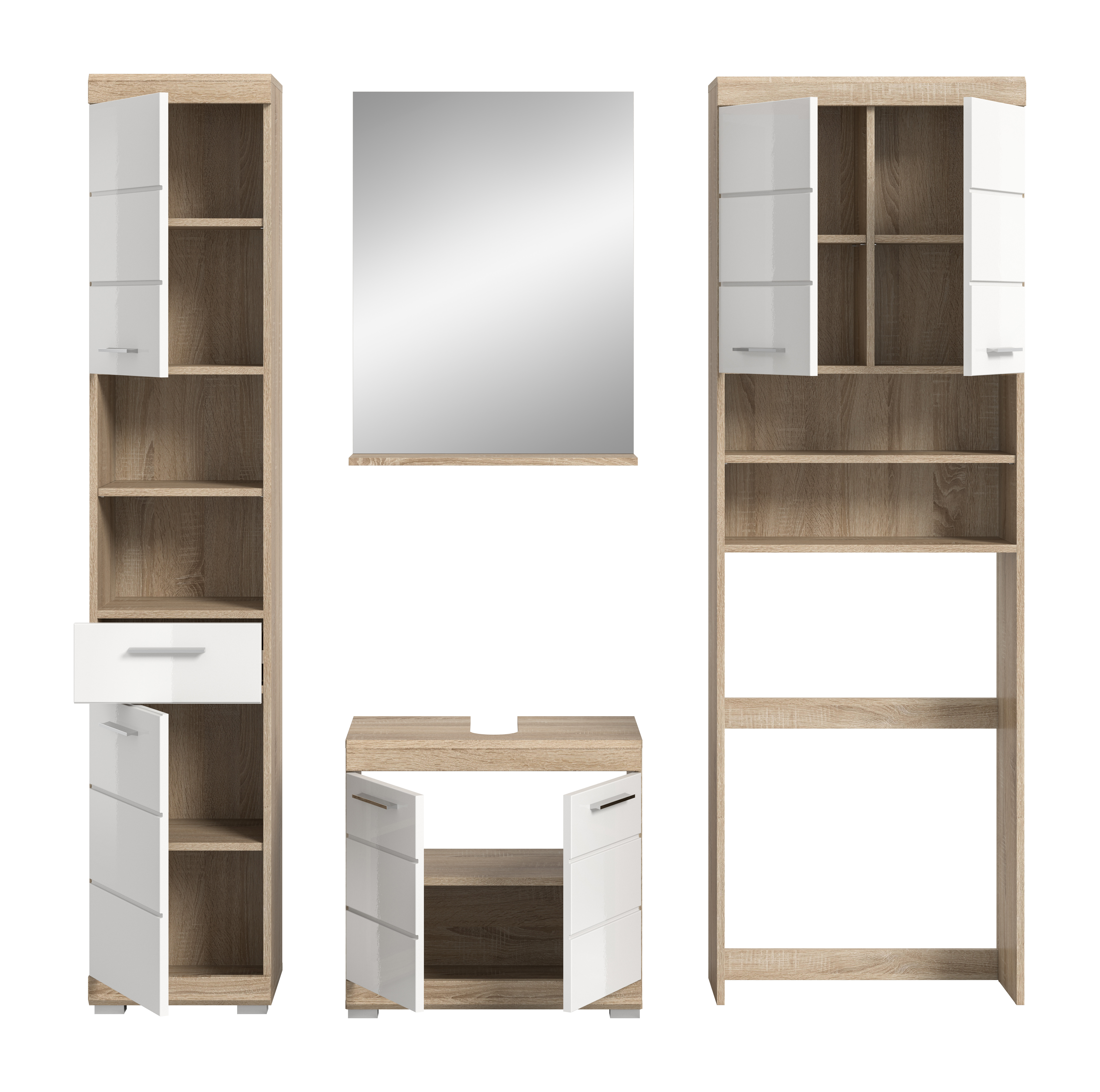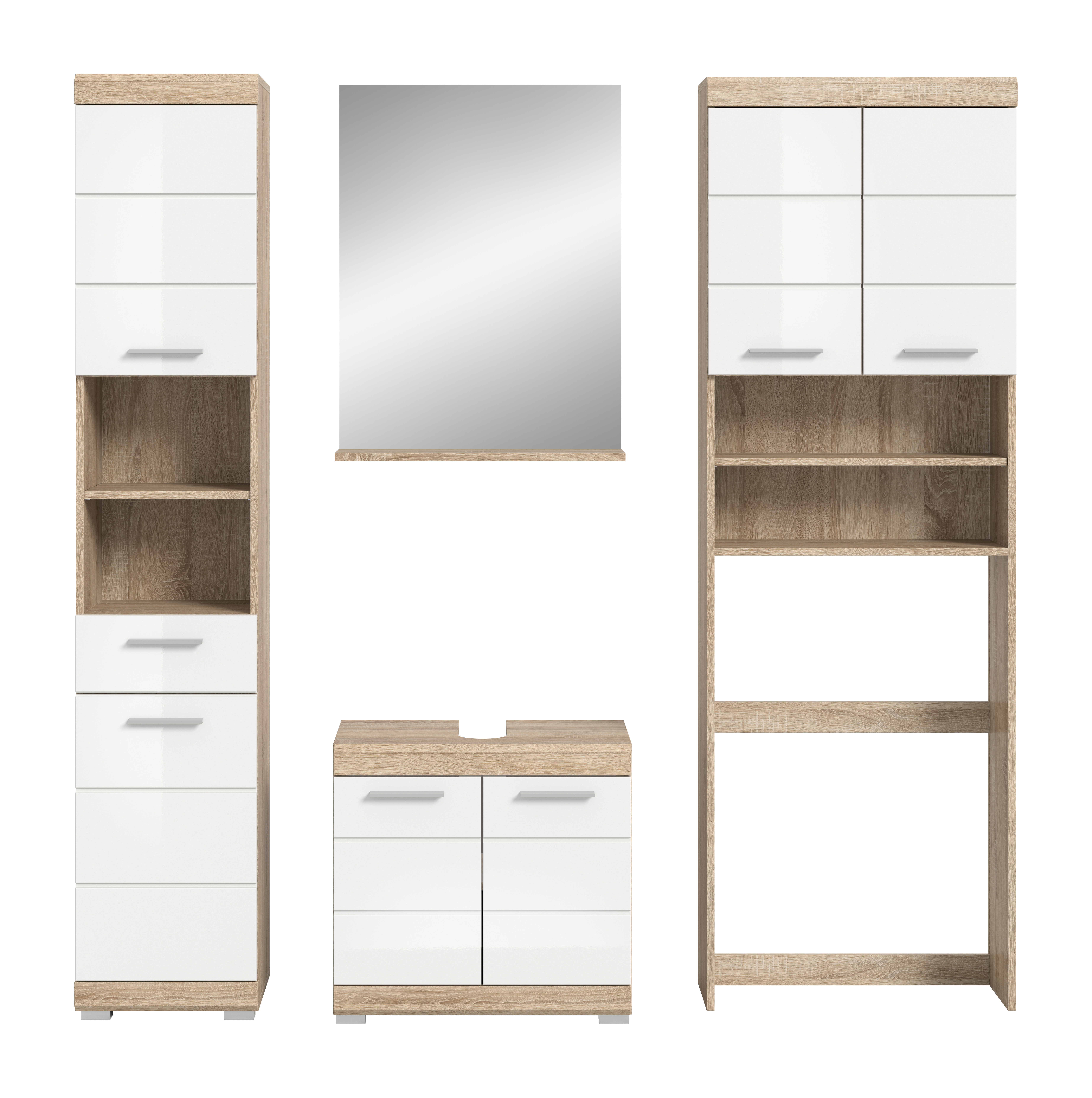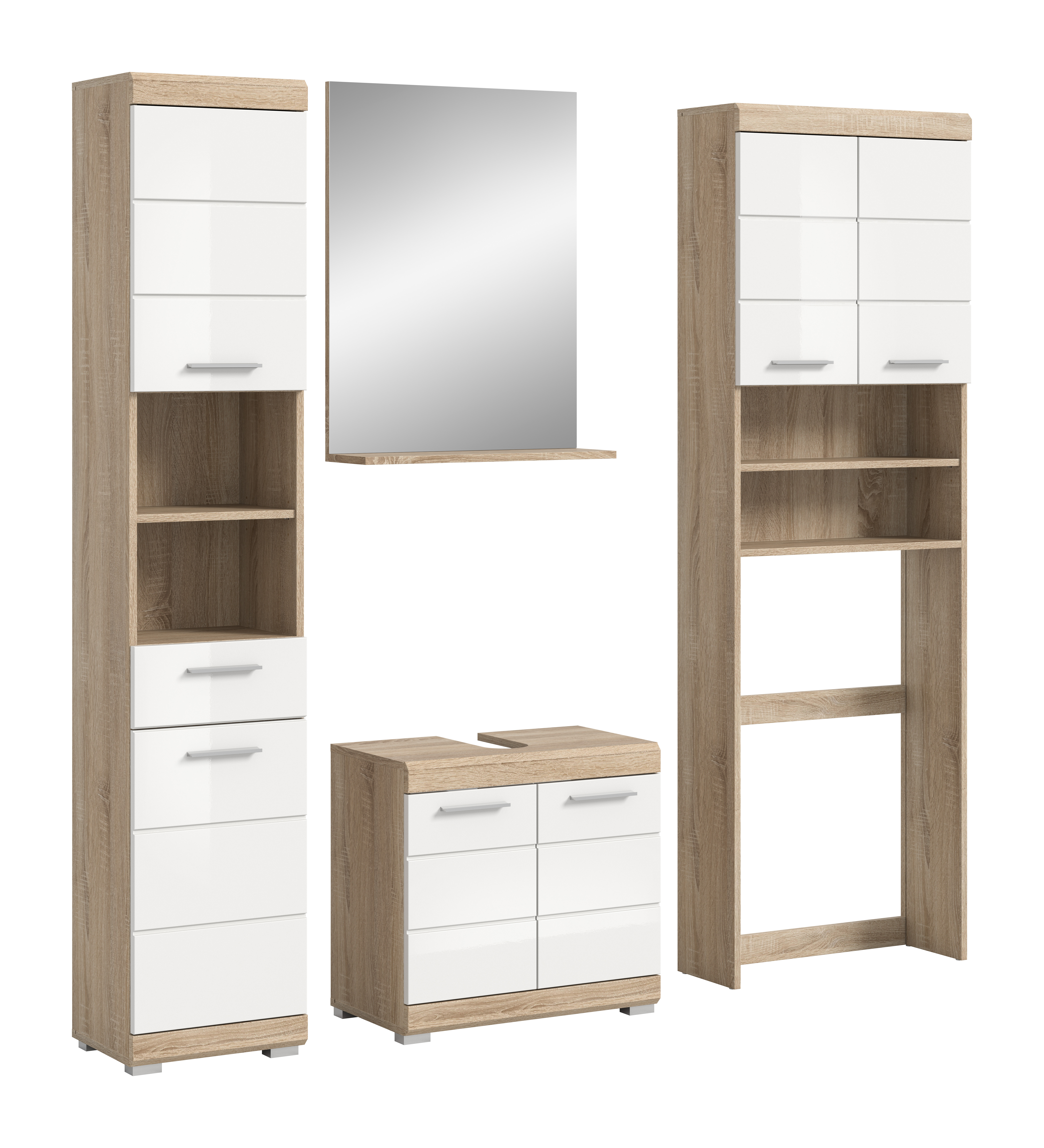 Entdecken Sie die perfekte Kombination aus Stil und Funktionalität für Ihr Badezimmer mit unserer Badkombination in Sonoma Eiche hell und weißem Hochglanz. Sie bietet bietet ausreichend Stauraum und verleiht Ihrem Raum einen modernen und ansprechenden Look. Tauchen Sie ein in zeitlose Eleganz und optimale Organisation mit diesem einzigartigen Möbelstück.