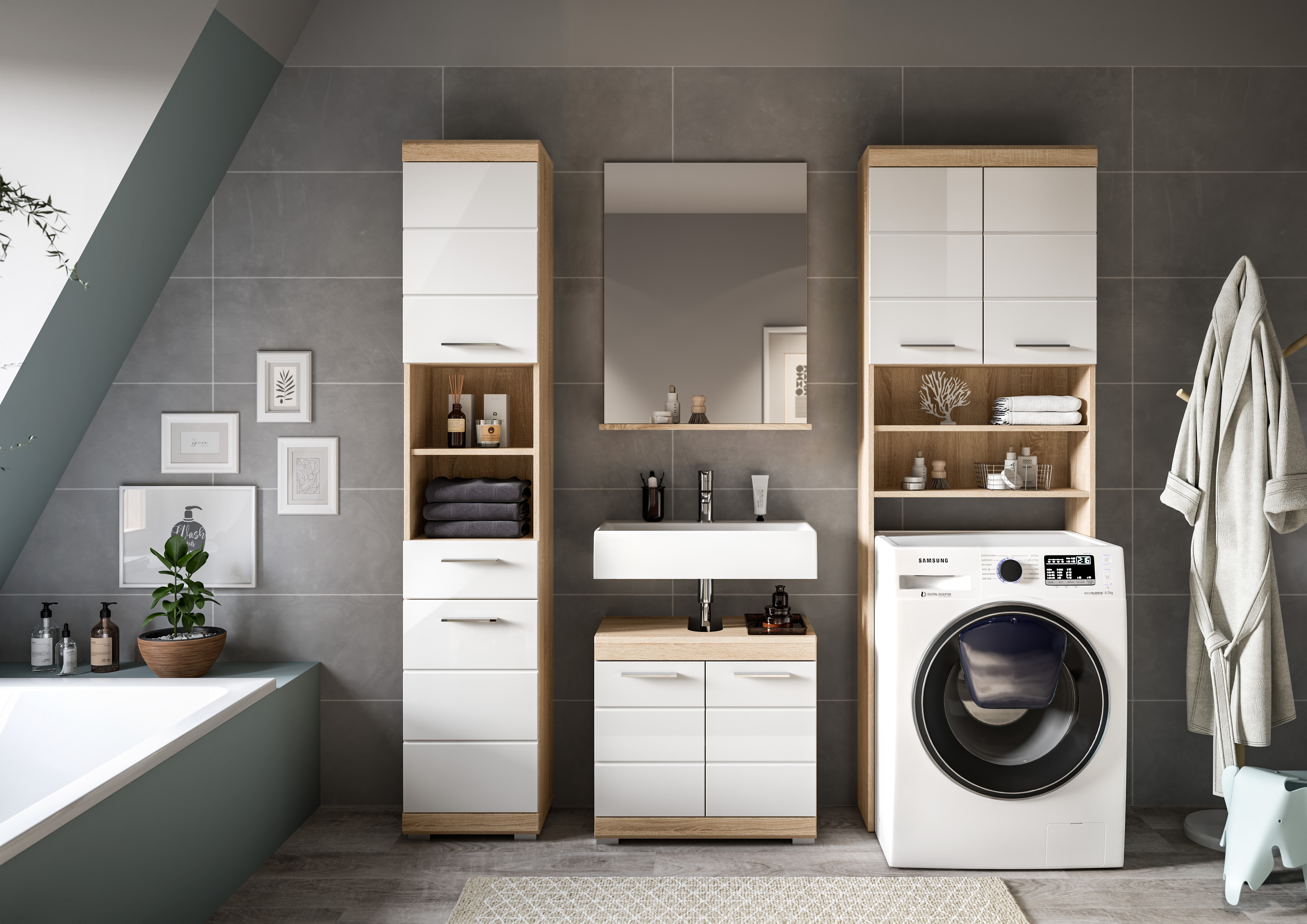 - Einsatzbereich: Die Badkombination eignet sich ideal für Badezimmer oder Hauswirtschaftsräume, in denen umfassender Stauraum benötigt wird und eine moderne Ästhetik gewünscht ist. Sie bietet eine praktische und stilvolle Lösung zur Organisation und Gestaltung des Raums.